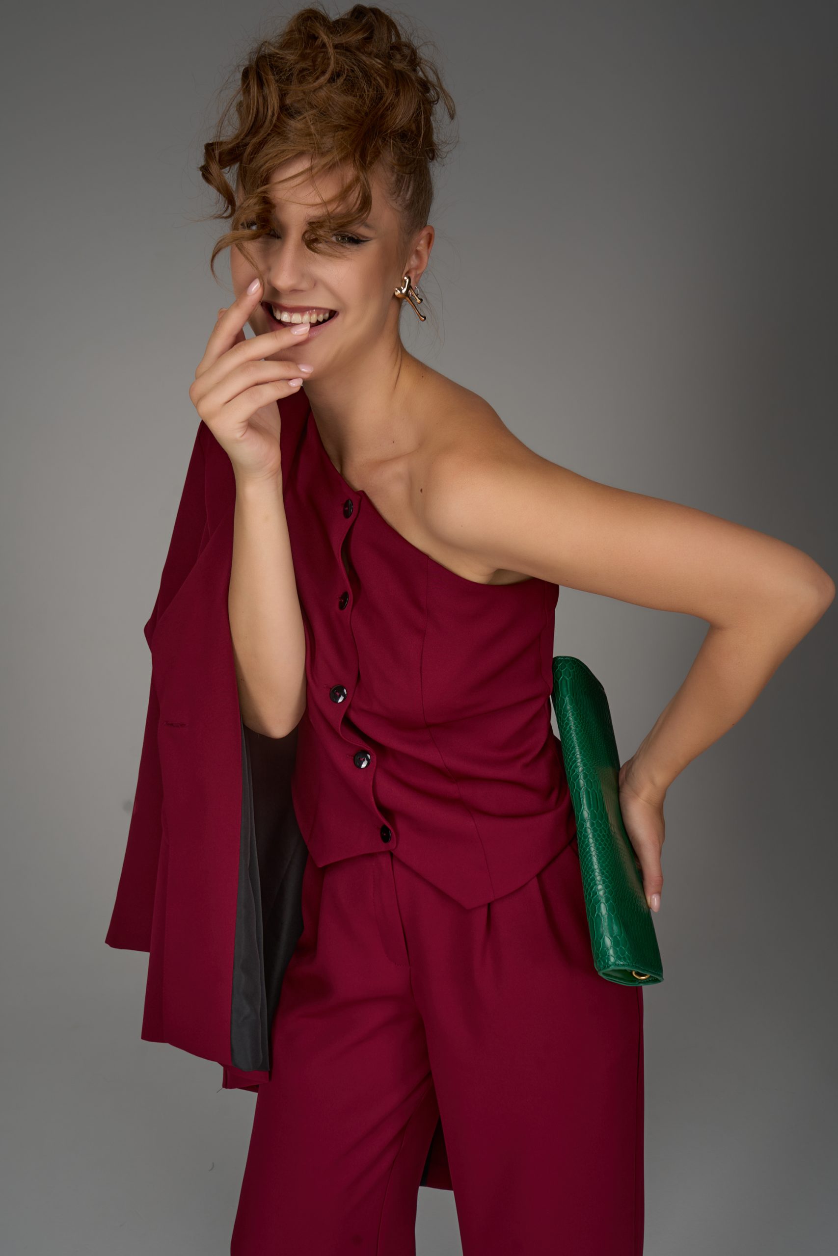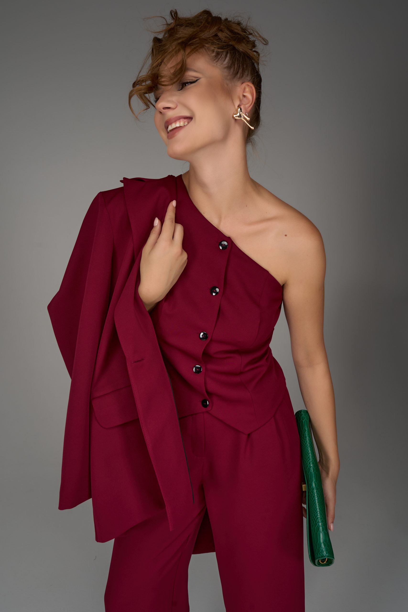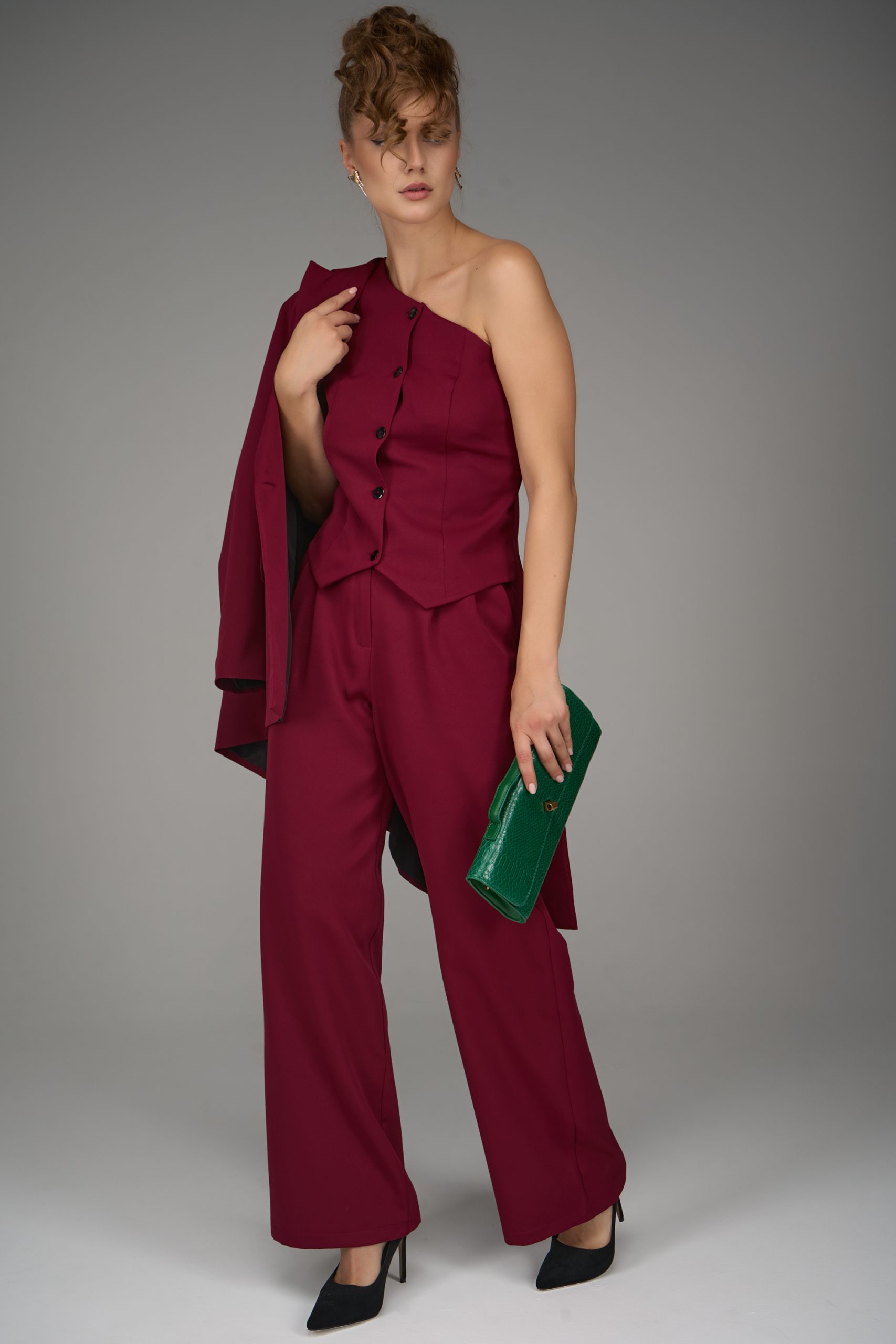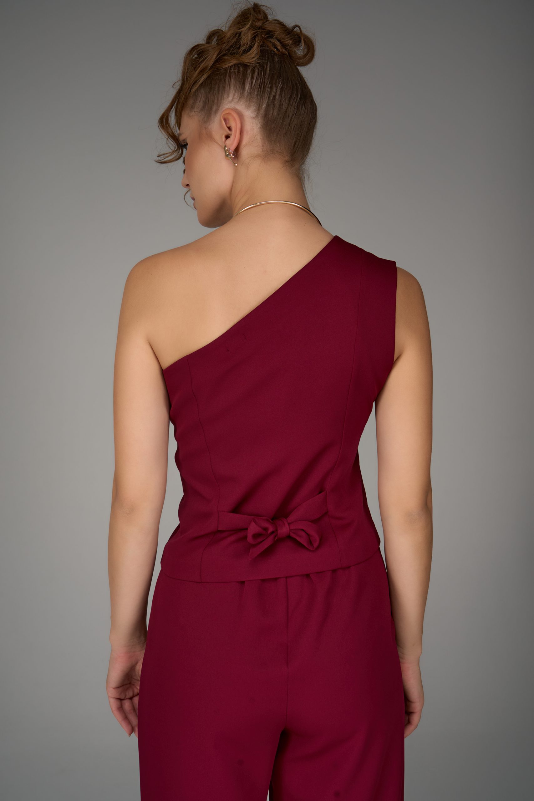 Жилет на одно плечо — смелый акцент коллекции. Нестандартный крой превращает классическую деталь гардероба в модное высказывание. Ассиметричная линия делает образ современным и запоминающимся, подчеркивая изящность фигуры и утончённый вкус.