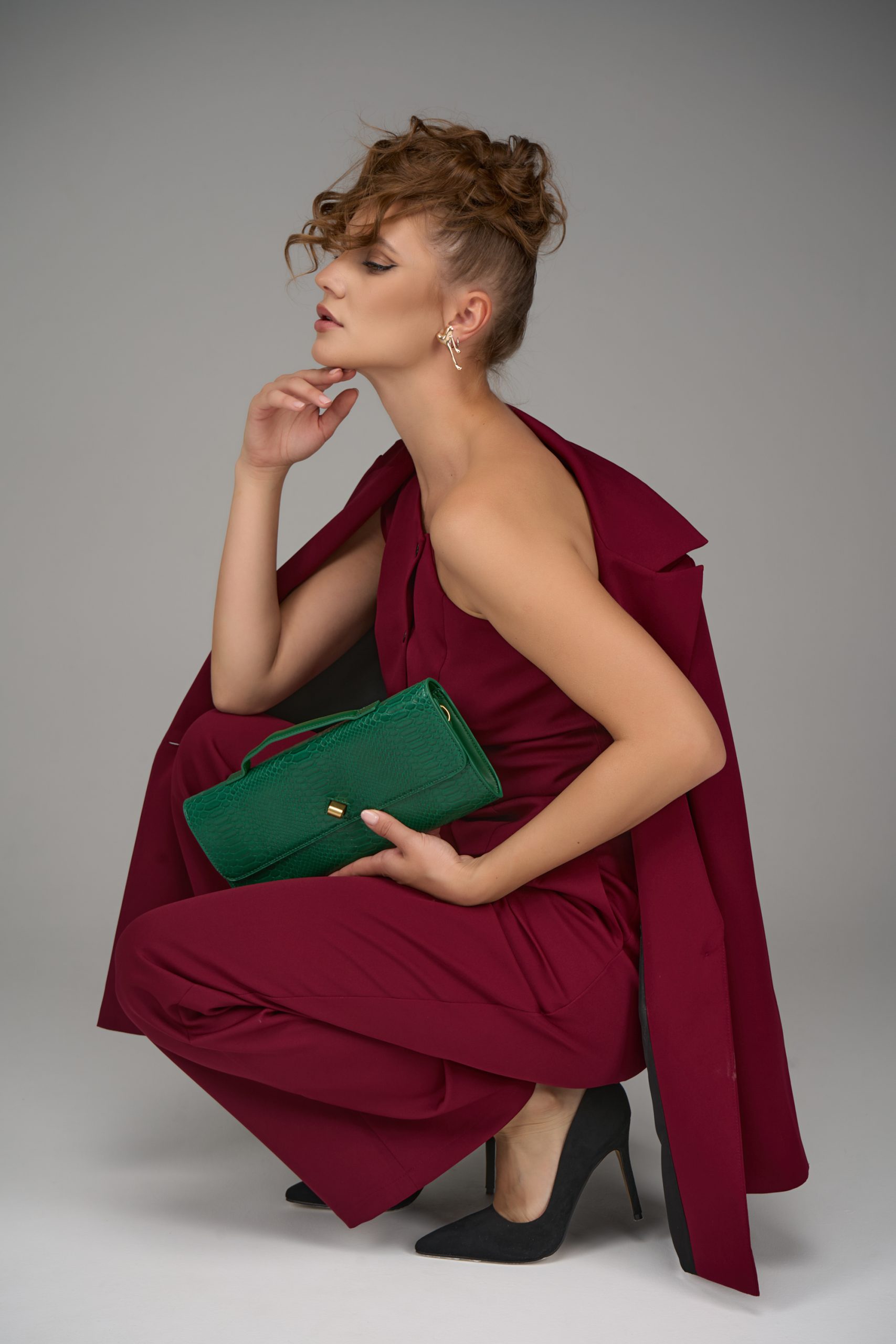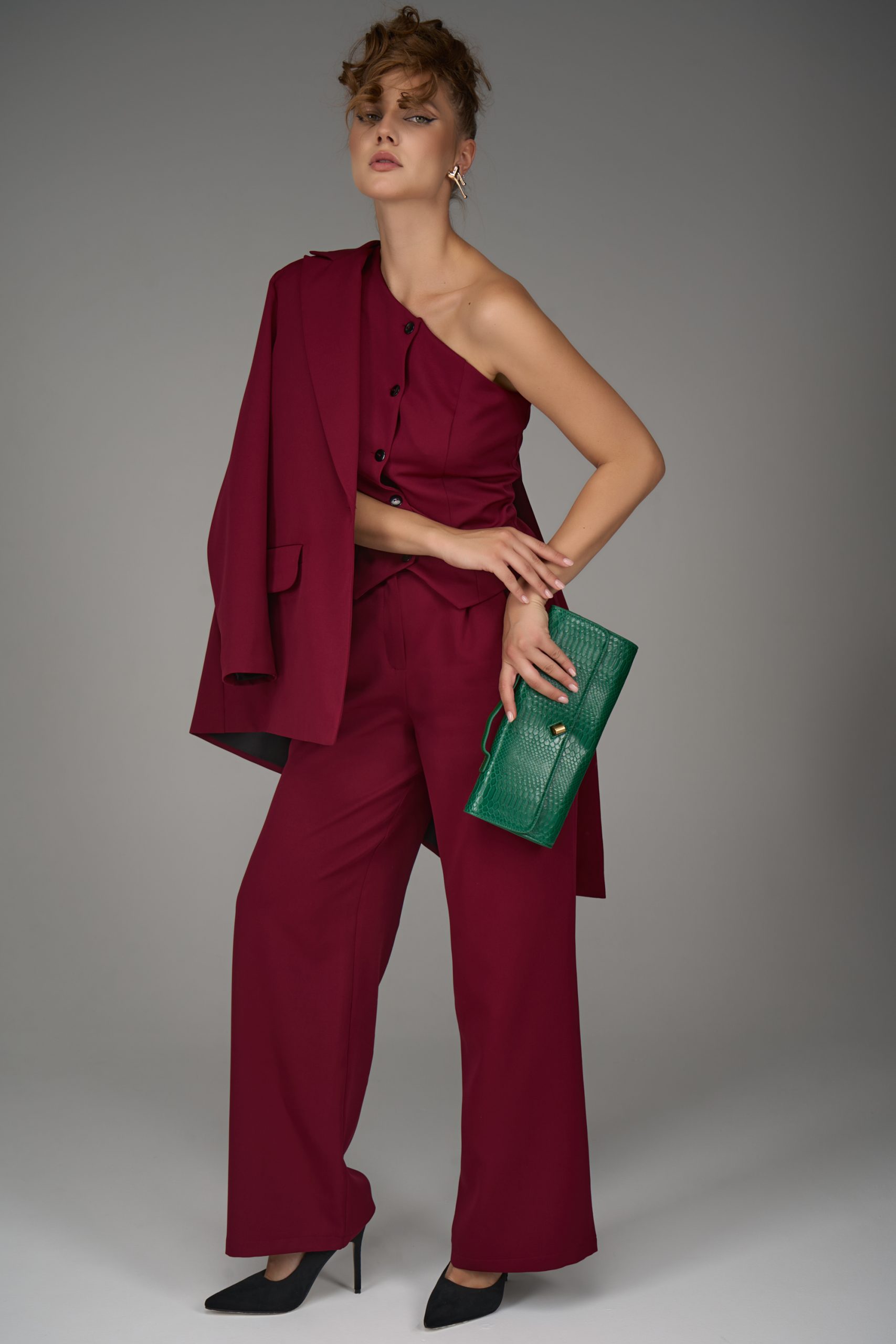 Жилет можно носить как самостоятельный элемент — с брюками или юбкой с высокой талией, так и в комплекте с пиджаком и брюк «Клио» для создания эффектного костюмного ансамбля.