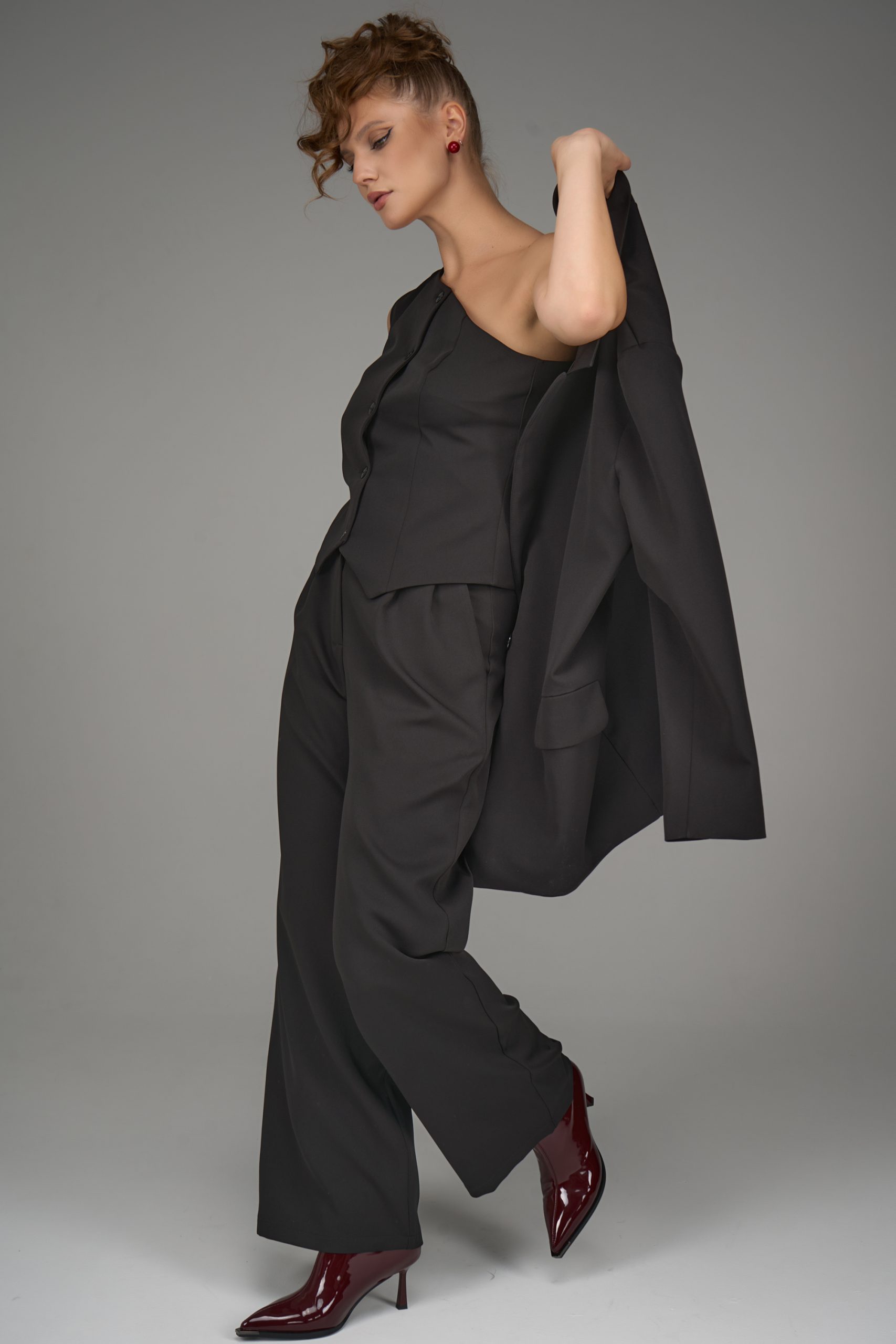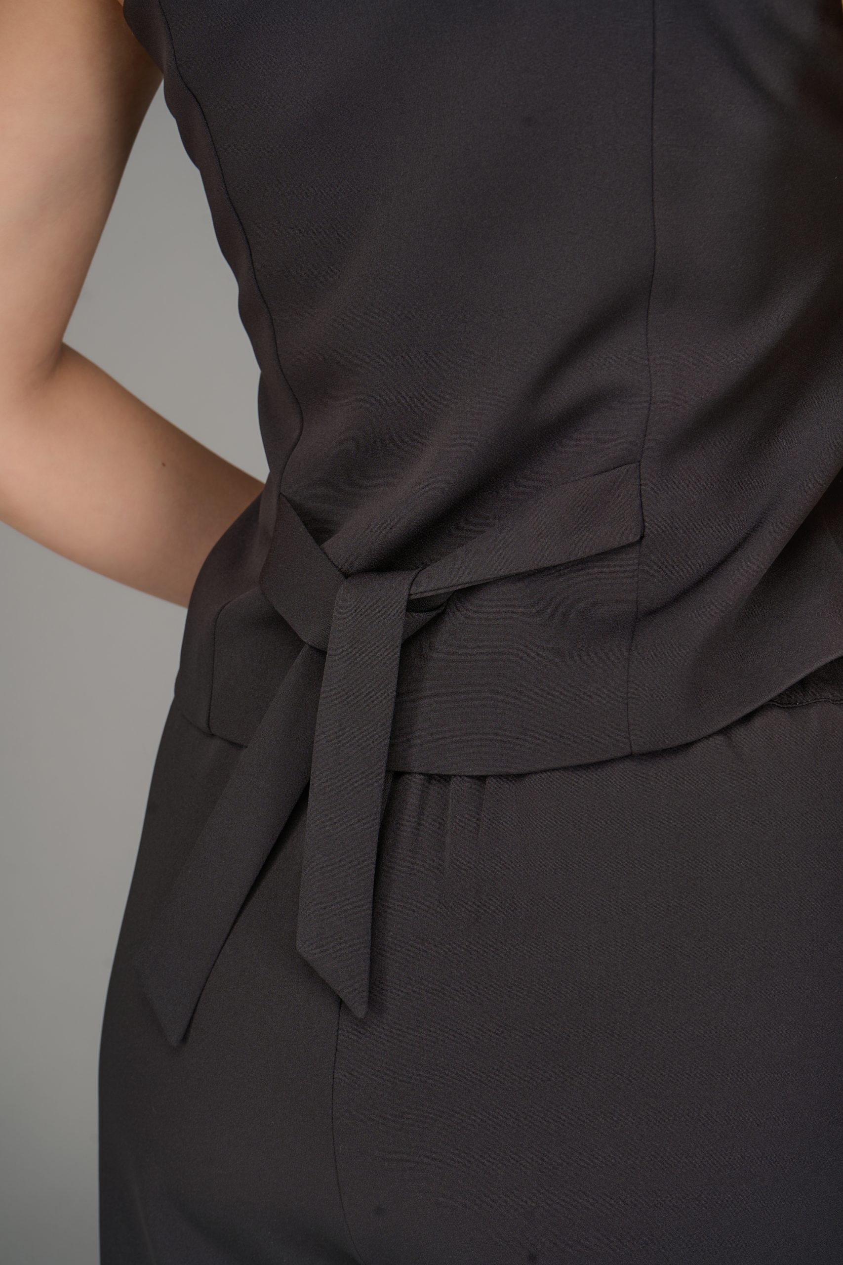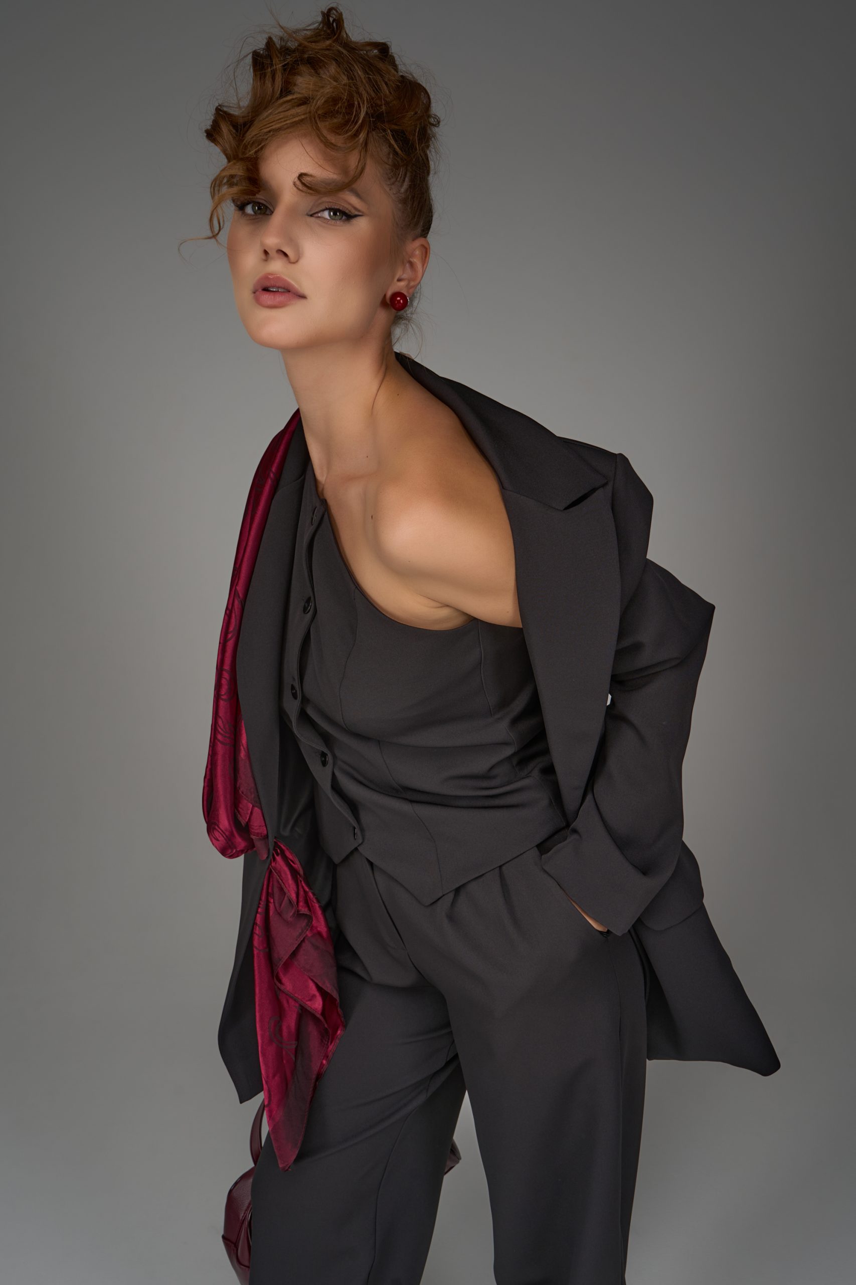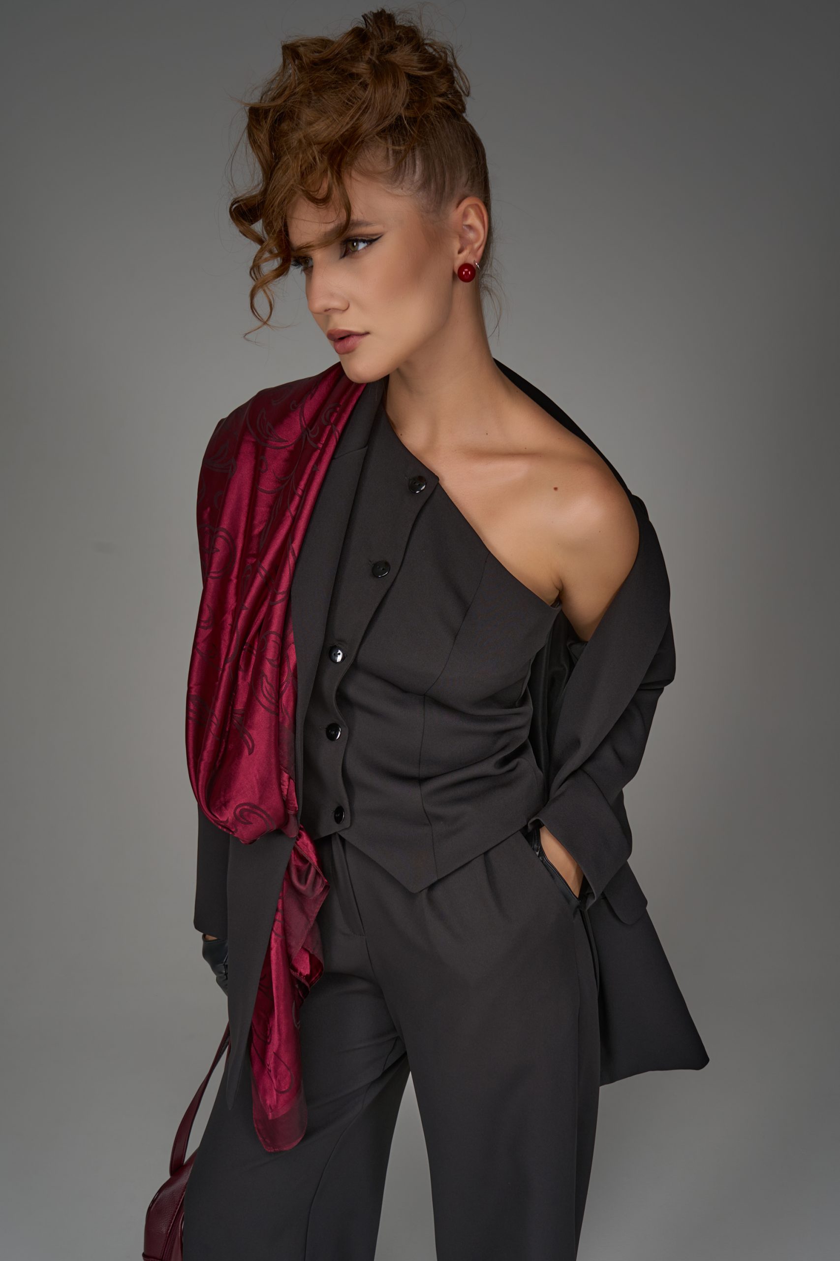 Жилет можно носить как самостоятельный элемент — с брюками или юбкой с высокой талией, так и в комплекте с пиджаком и брюк «Клио» для создания эффектного костюмного ансамбля.