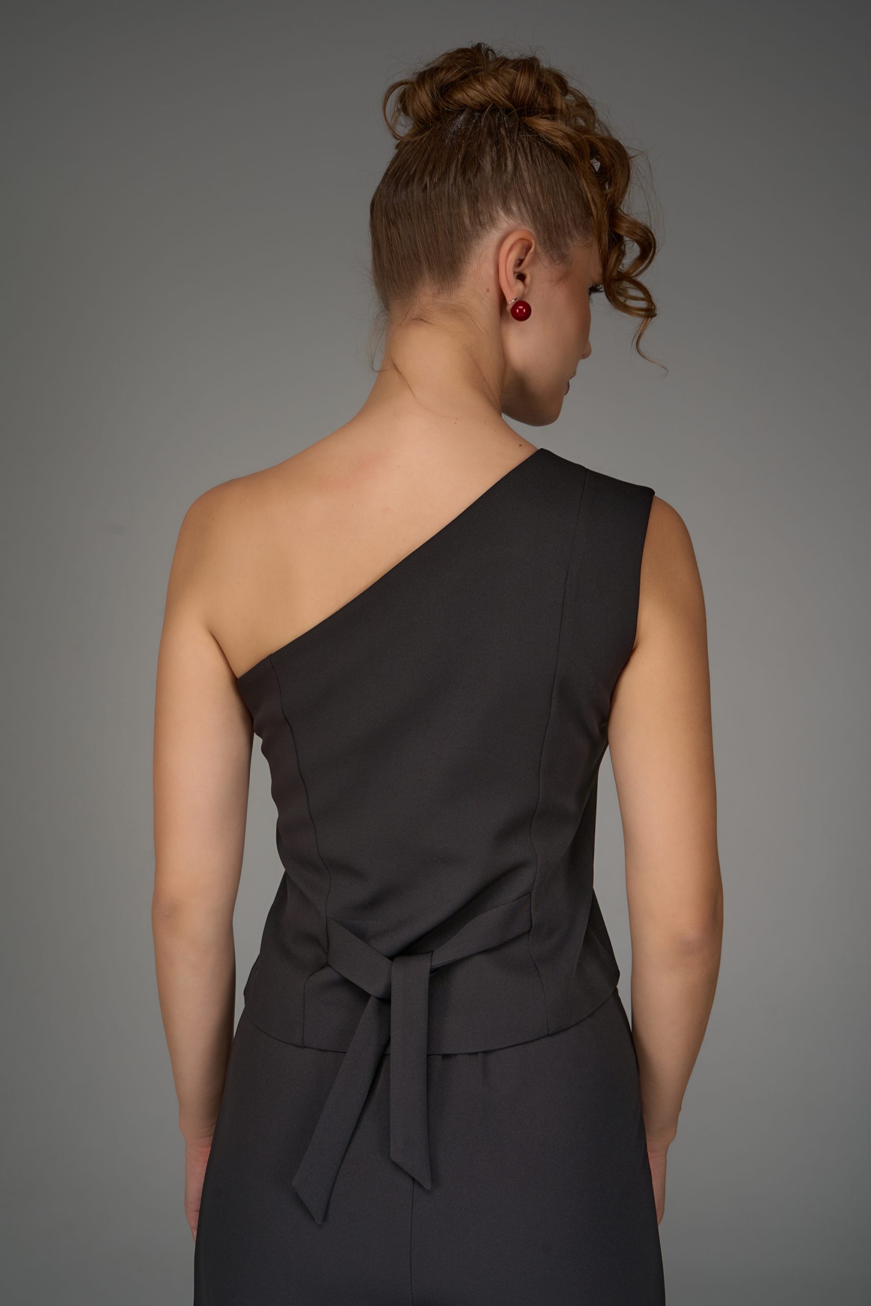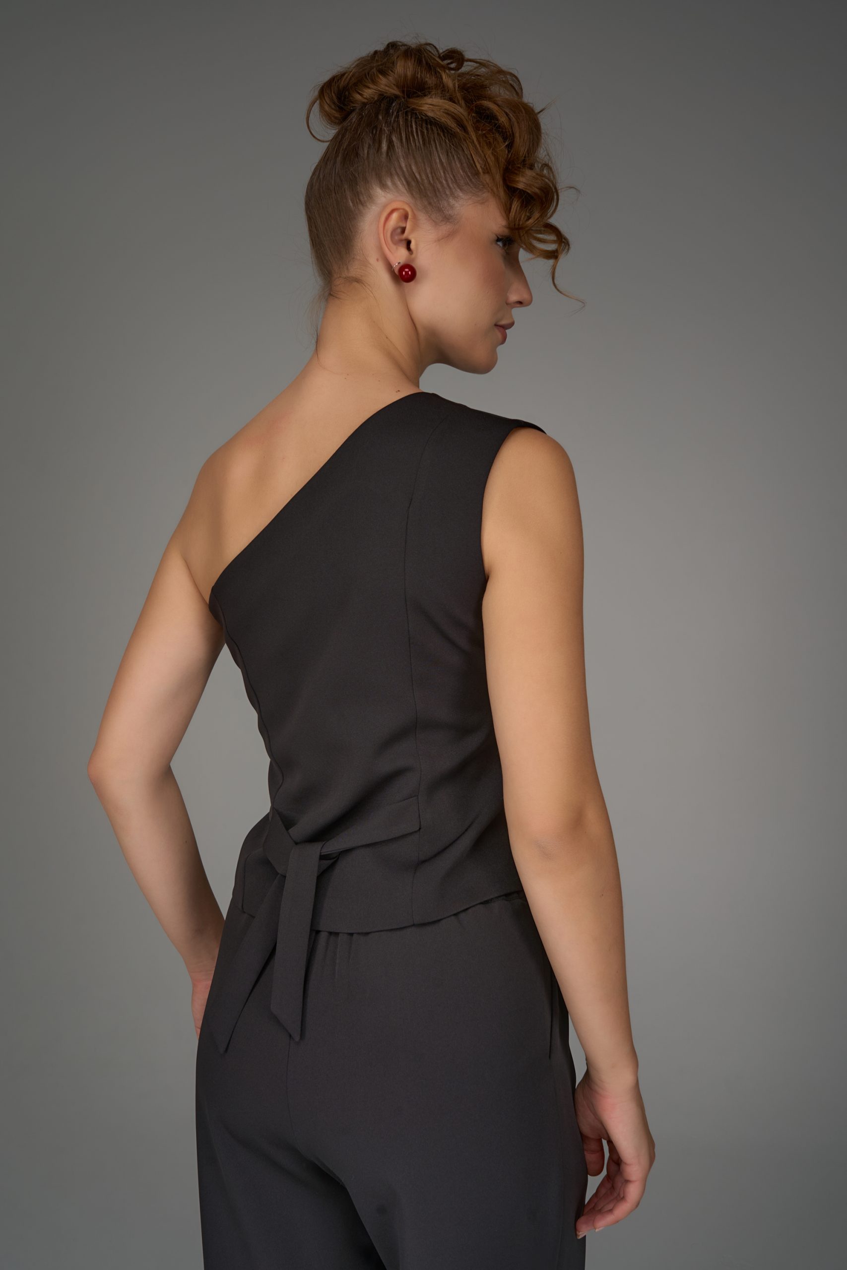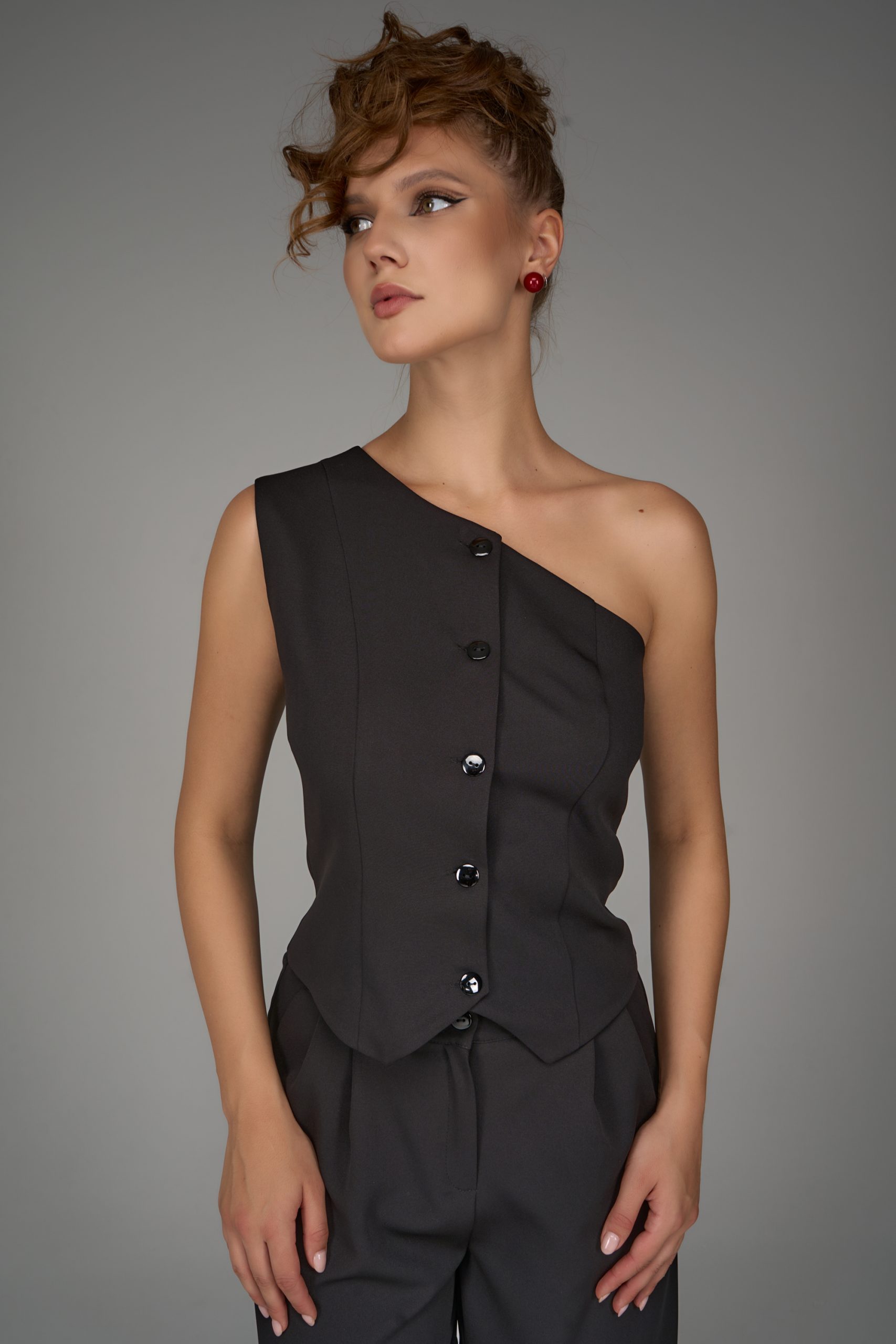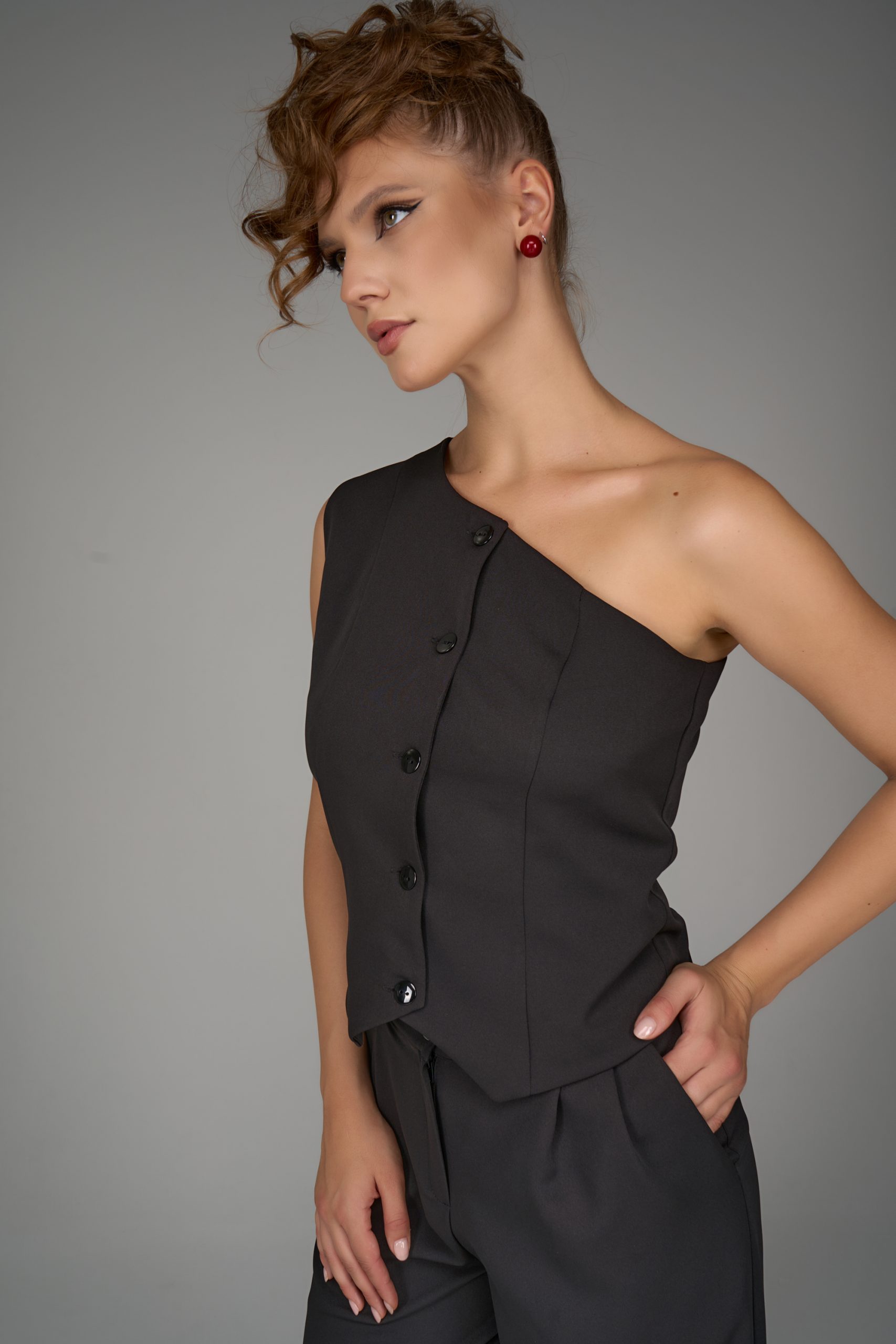 Жилет на одно плечо — смелый акцент коллекции. Нестандартный крой превращает классическую деталь гардероба в модное высказывание. Ассиметричная линия делает образ современным и запоминающимся, подчеркивая изящность фигуры и утончённый вкус.