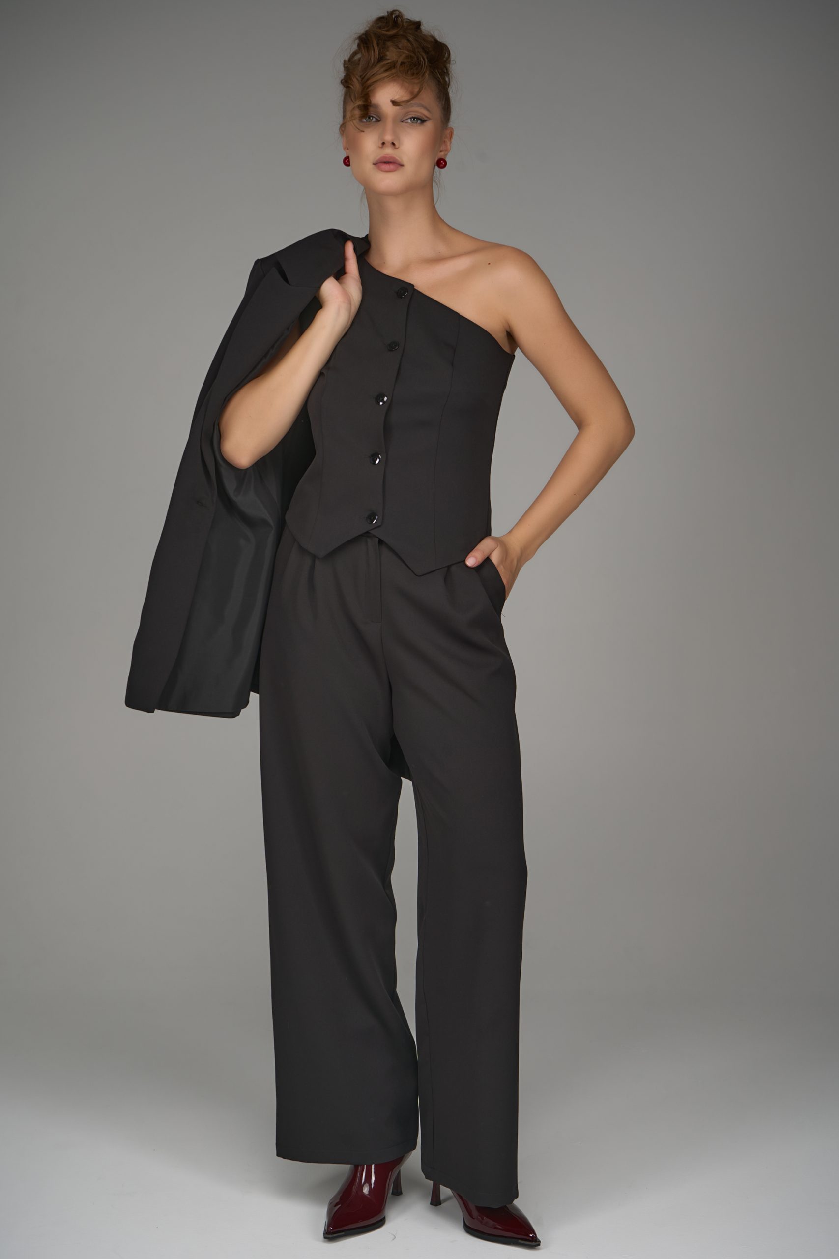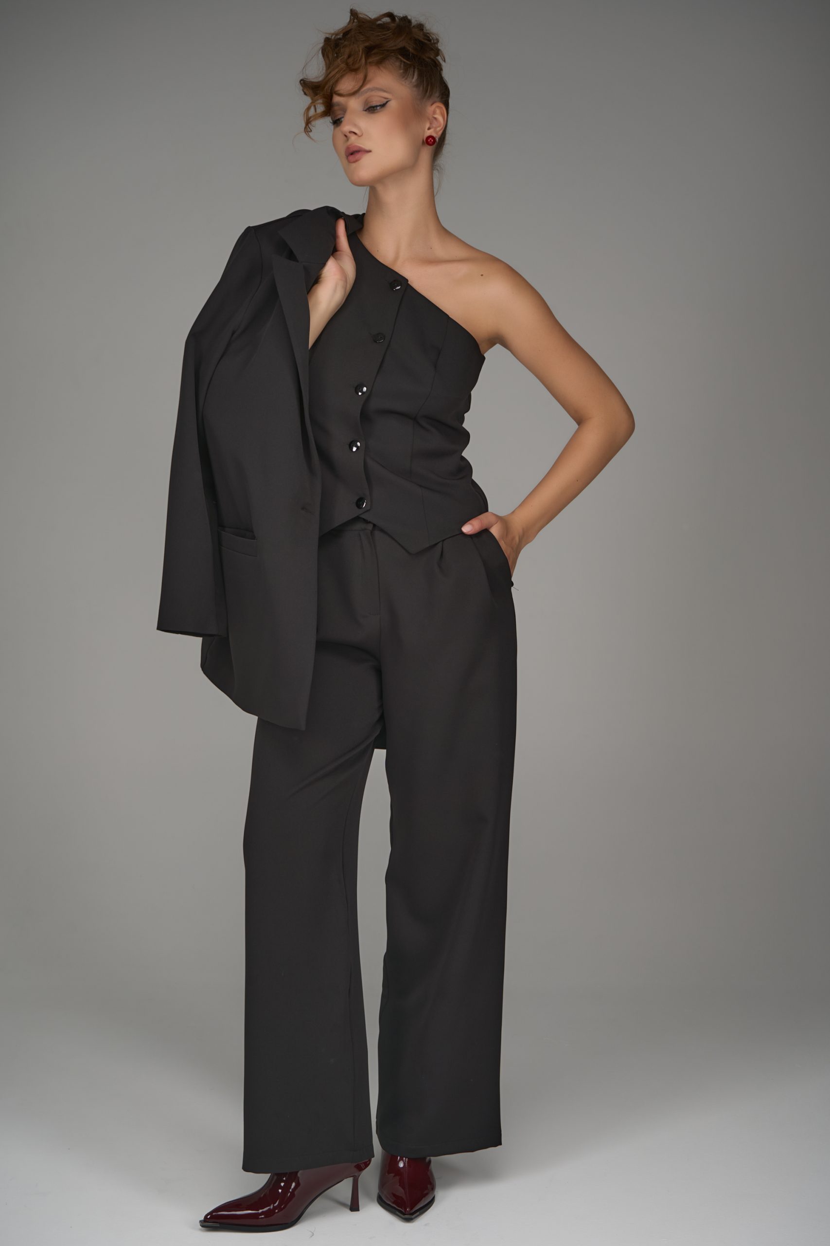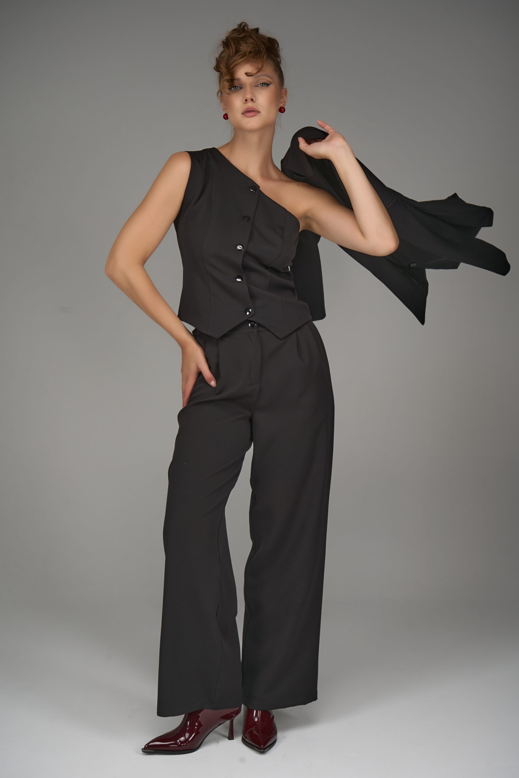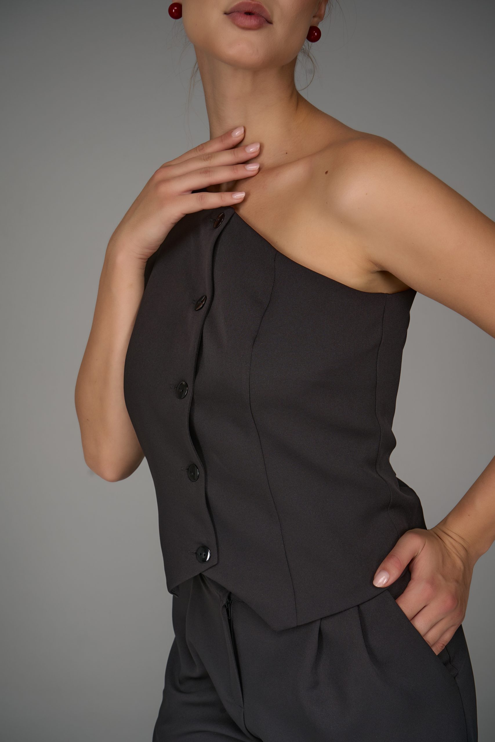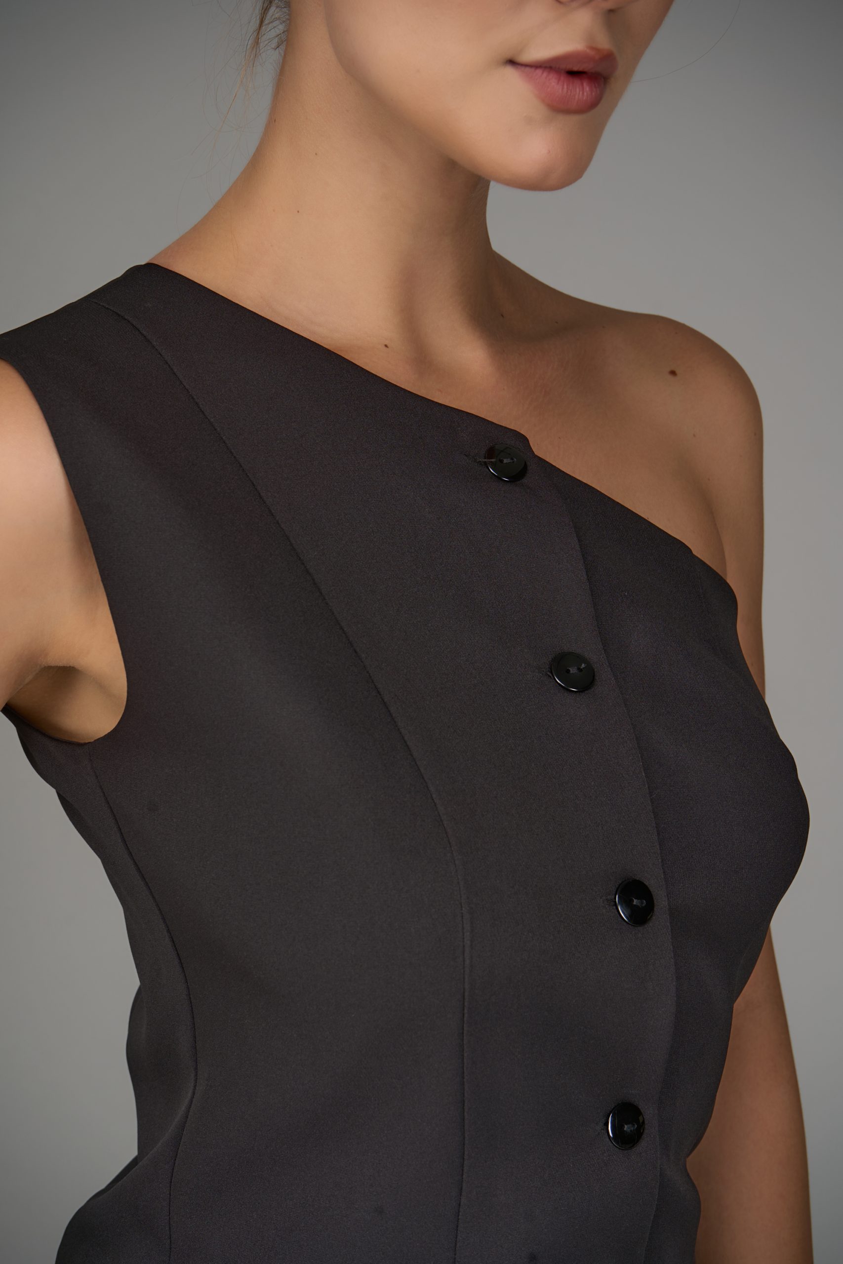 Жилет на одно плечо — смелый акцент коллекции. Нестандартный крой превращает классическую деталь гардероба в модное высказывание. Ассиметричная линия делает образ современным и запоминающимся, подчеркивая изящность фигуры и утончённый вкус.