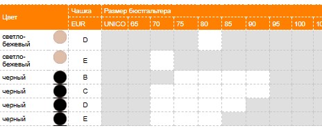 | Цвет | Чашка | Размер бюстгальтера | |||||||||||||