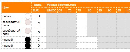 Цвет | Чашка | Размер бюстгальтера | |||||||||||||