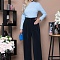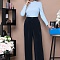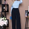 • Брюки-палаццо  из комфортной костюмной ткани,с высокой посадкой по талии,застегивающиеся на молнию в гульфике.По переду от пояса застрочены  мягкие складки.В боковых швах функциональные карманы.Пояс притачной,застегивающийся на одну пуговицу,посаженный по спинке на резину.