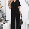 Нарядный брючный комплект из трикотажного полотна с легким блеском.Блузка с цельнокроеными рукавами и V-образным вырезом горловины.Брюки расширенные к низу, с эластичной резиной в поясе.