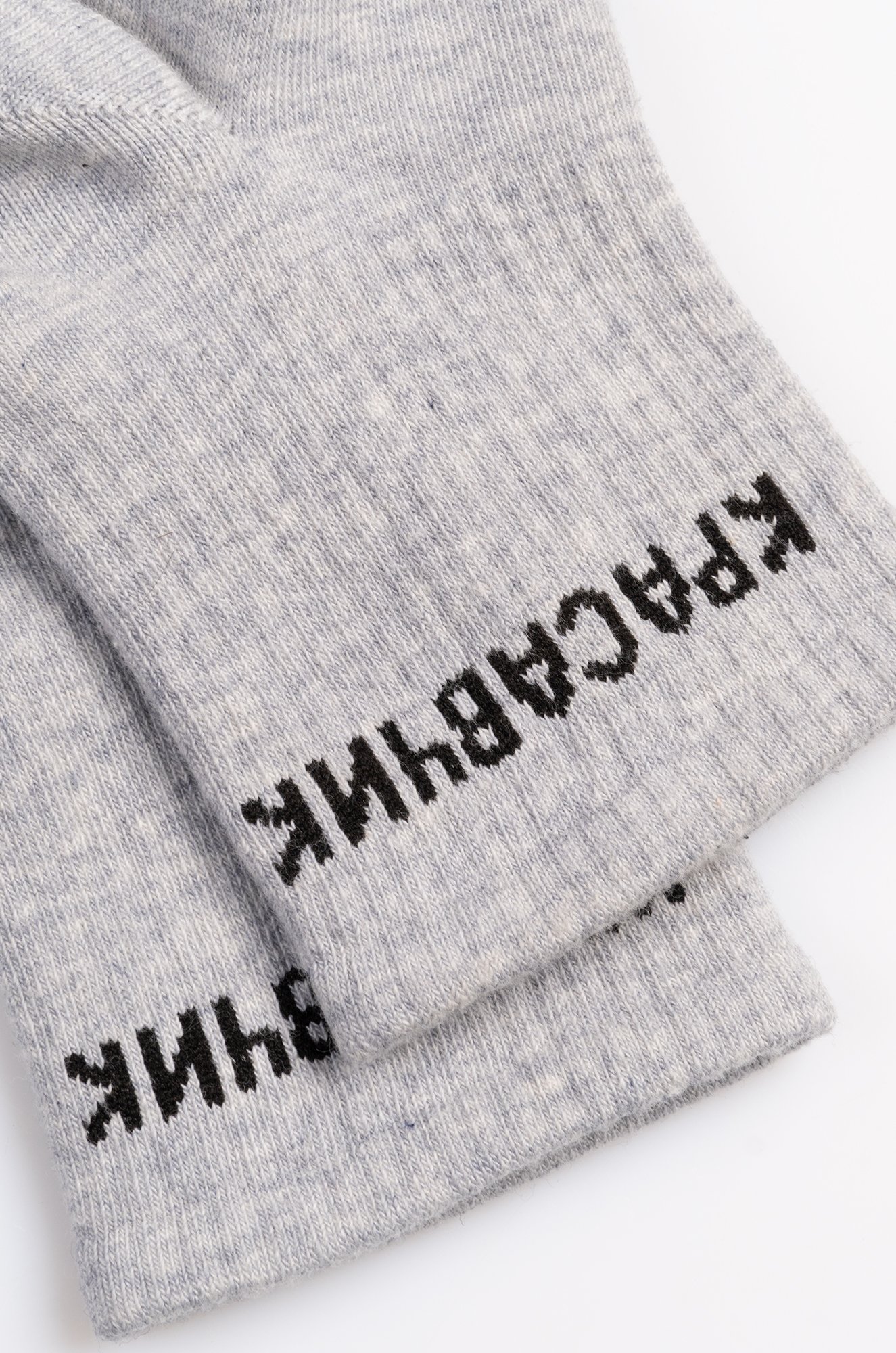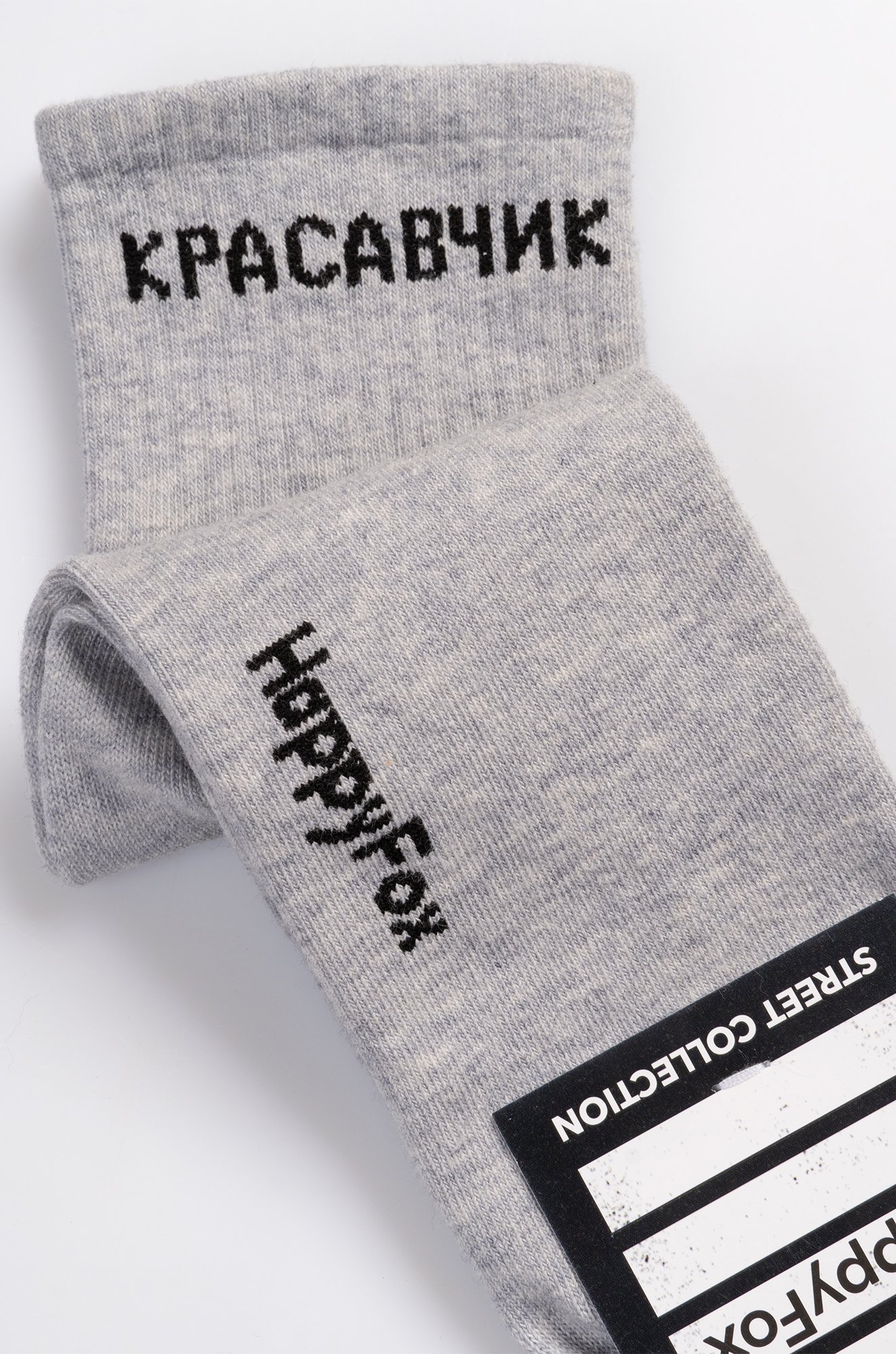 Серые мужские носки с прикольной надписью Красавчик точно поднимут настроение и разбавят повседневные будни! Демисезонная модель средней длины выполнена из смесового трикотажа: хлопок с добавлением эластана для лучшей посадки по ноге.