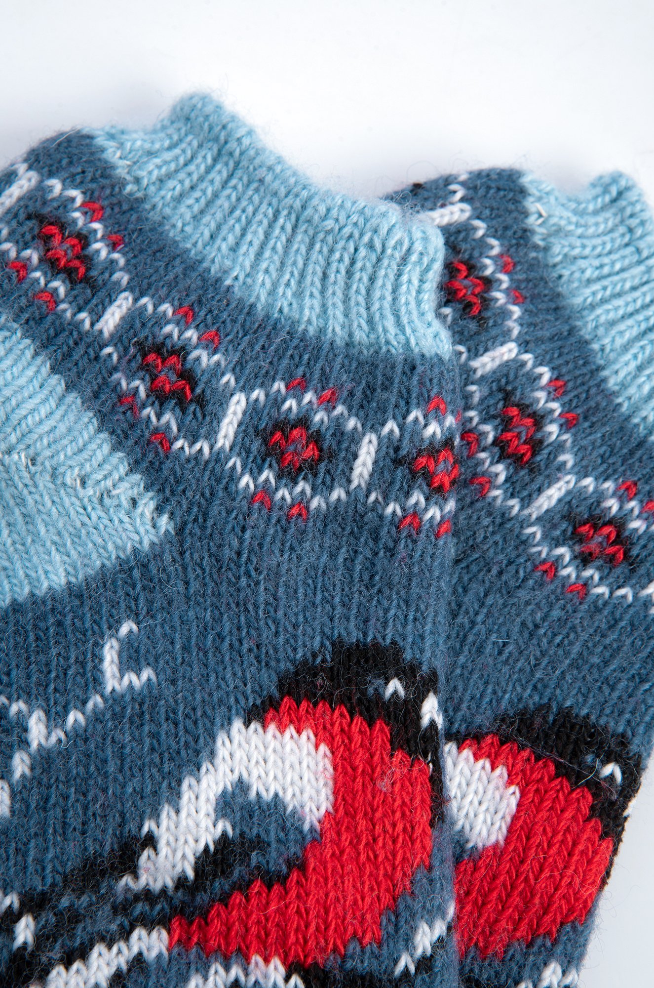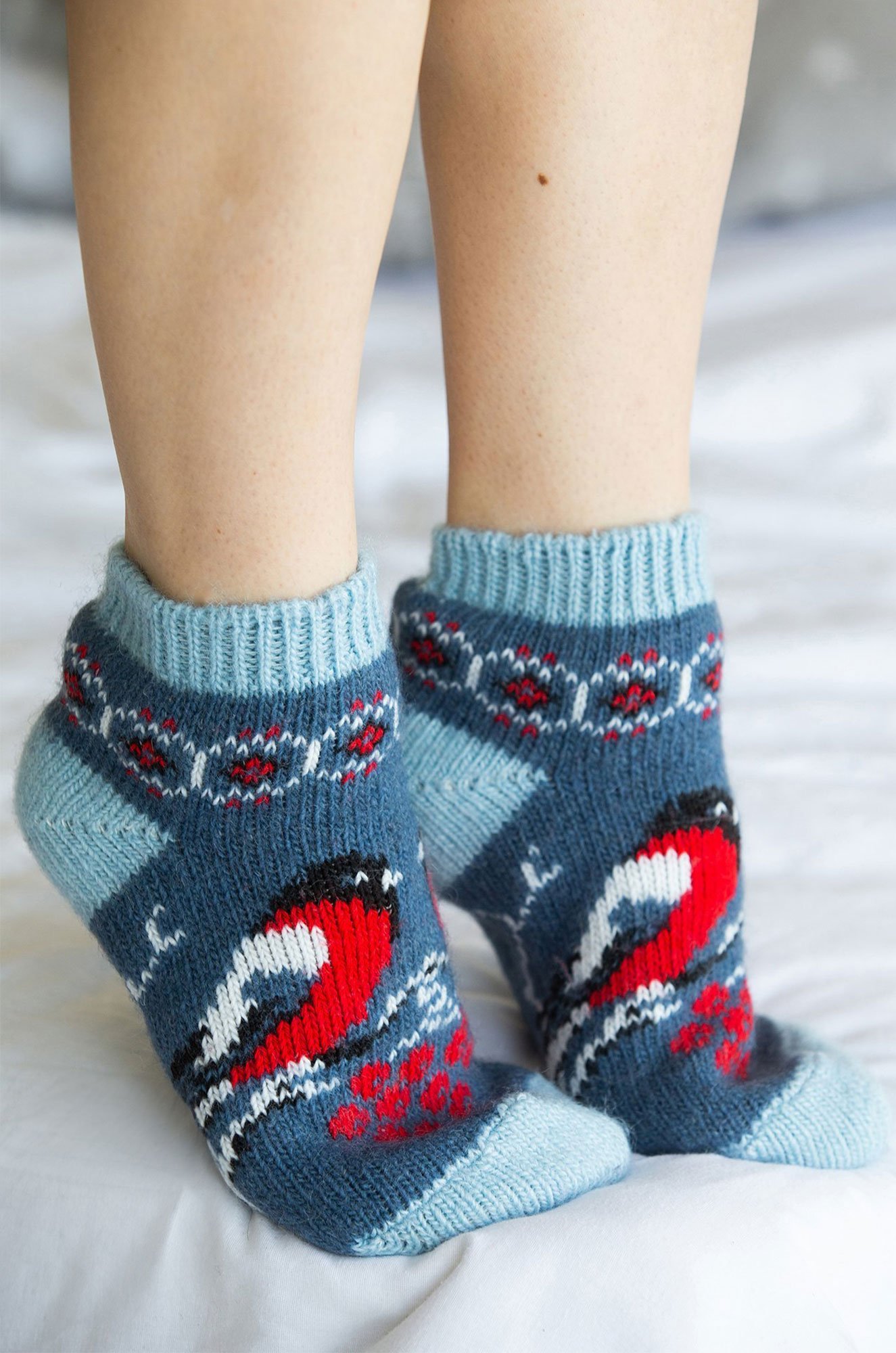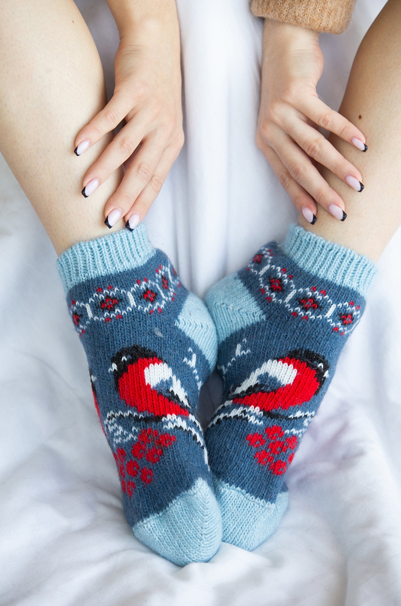 Яркие и уютные теплые вязаные носки с новогодним рисунком Снегири подарят отличное настроение! Мягкая пряжа приятно обнимает стопы, создавая ощущение уюта и тепла даже в самую холодную зиму. Красивая пара носков станет милым зимним аксессуаром и отличным подарком на Новый год или Рождество.