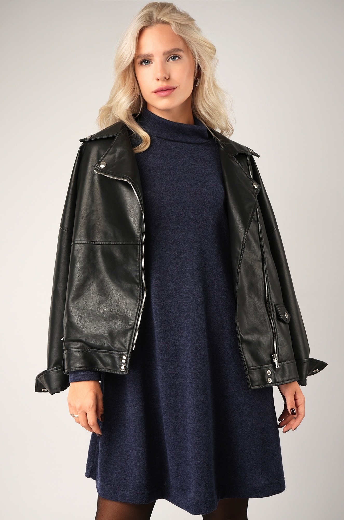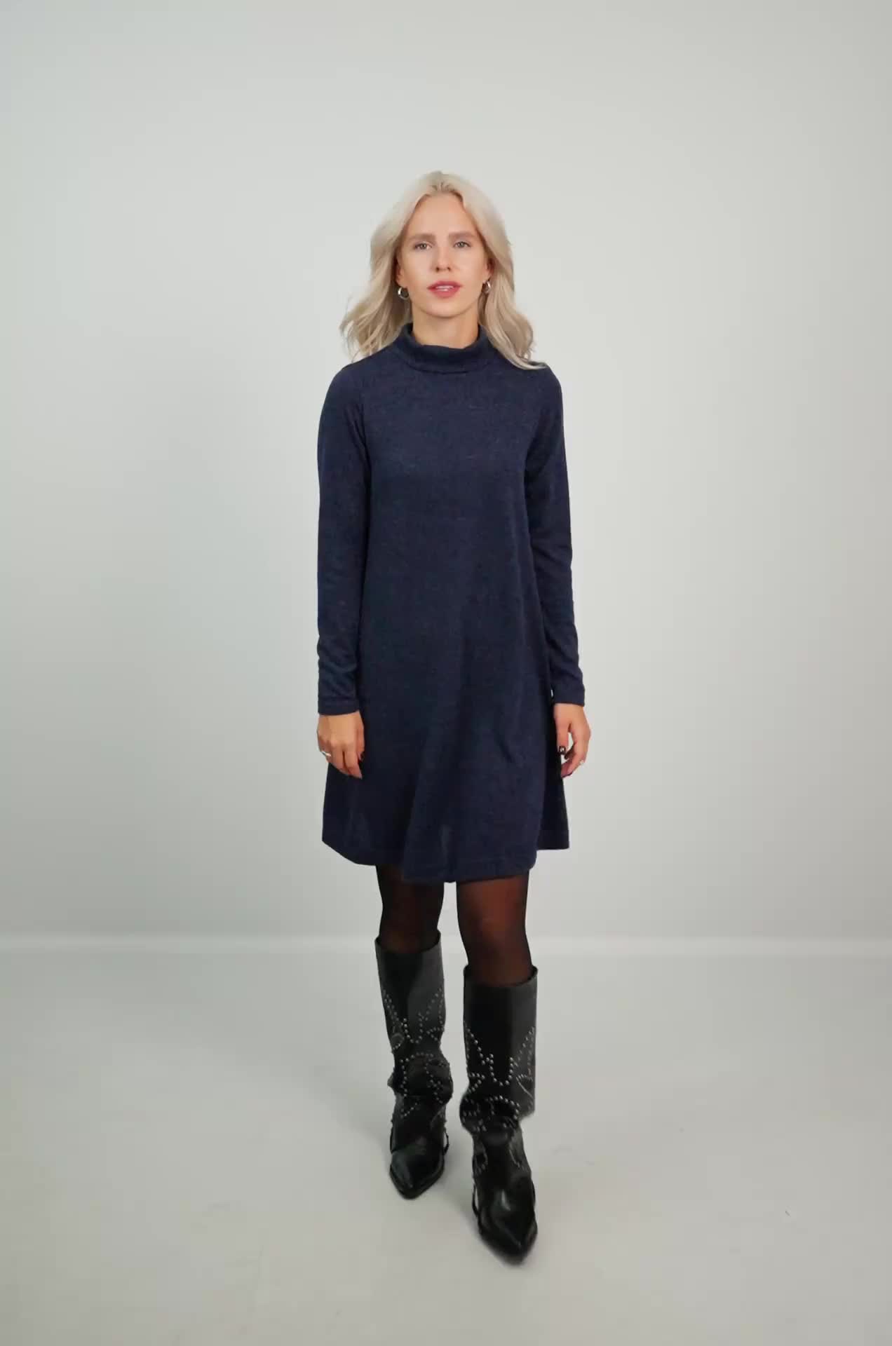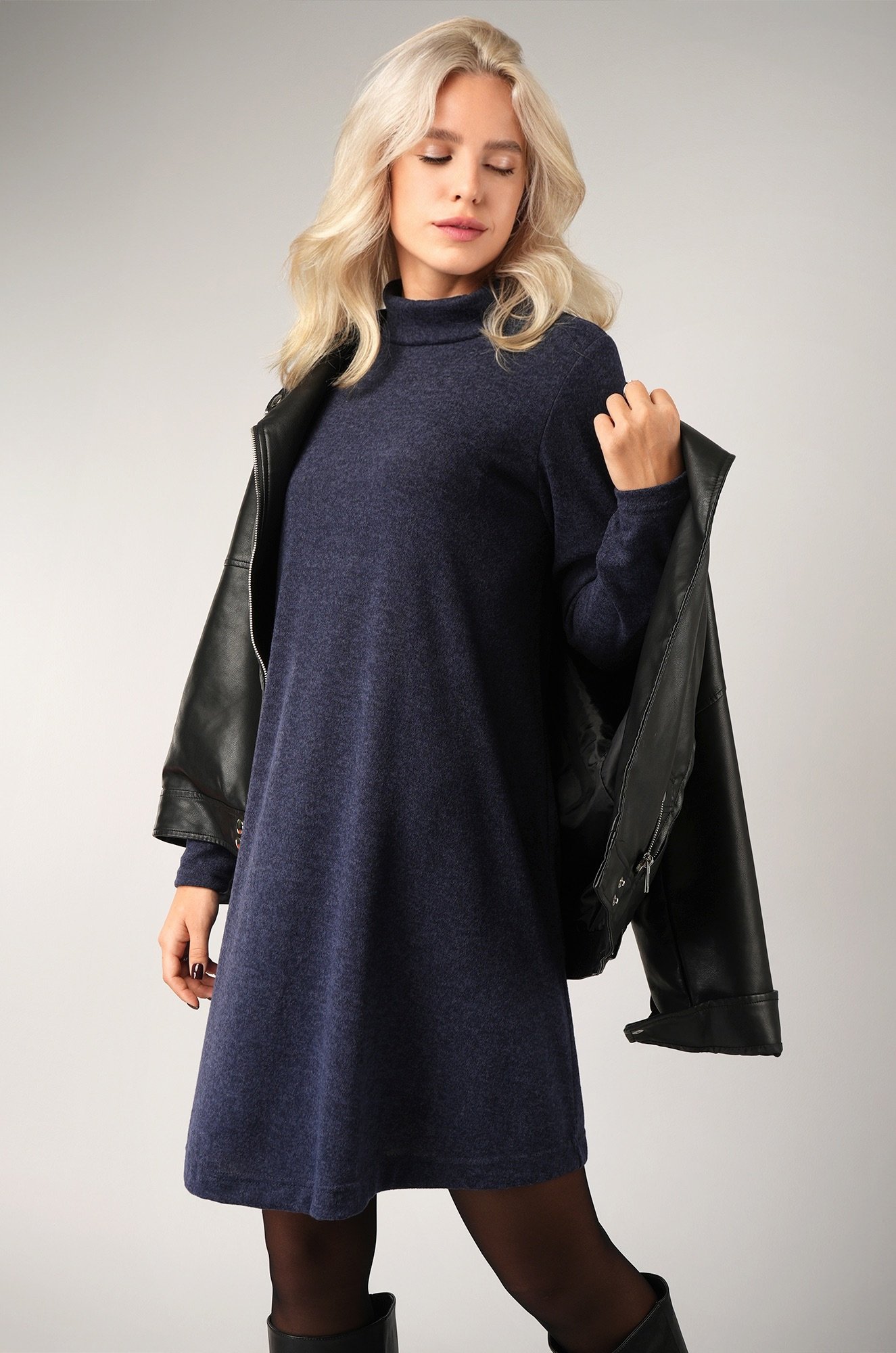 Темно-синее платье-водолазка станет универсальной основой для стильных образов осенью и весной.