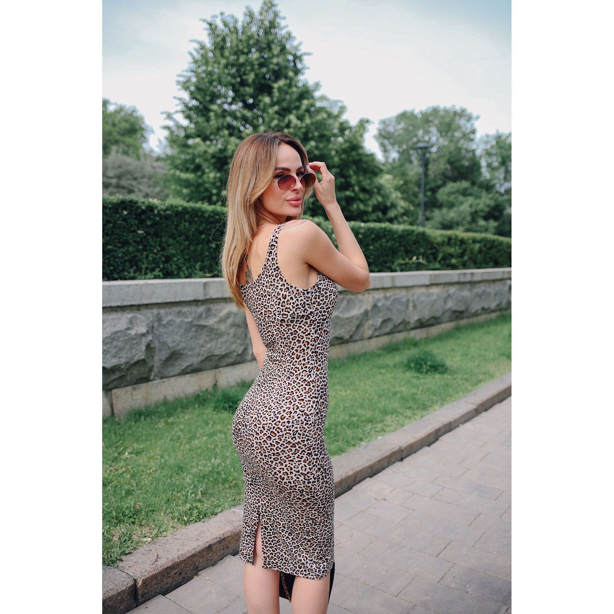 Элегантное леопардовое платье – магнит для восхищенных взглядов! Женское платье-майка без рукава выполнено из легкого, воздушного и эластичного трикотажа вискоза. Облегающий силуэт подчеркнет достоинства фигуры, глубокий вырез откроет зону декольте, сзади предусмотрен деликатный разрез.
