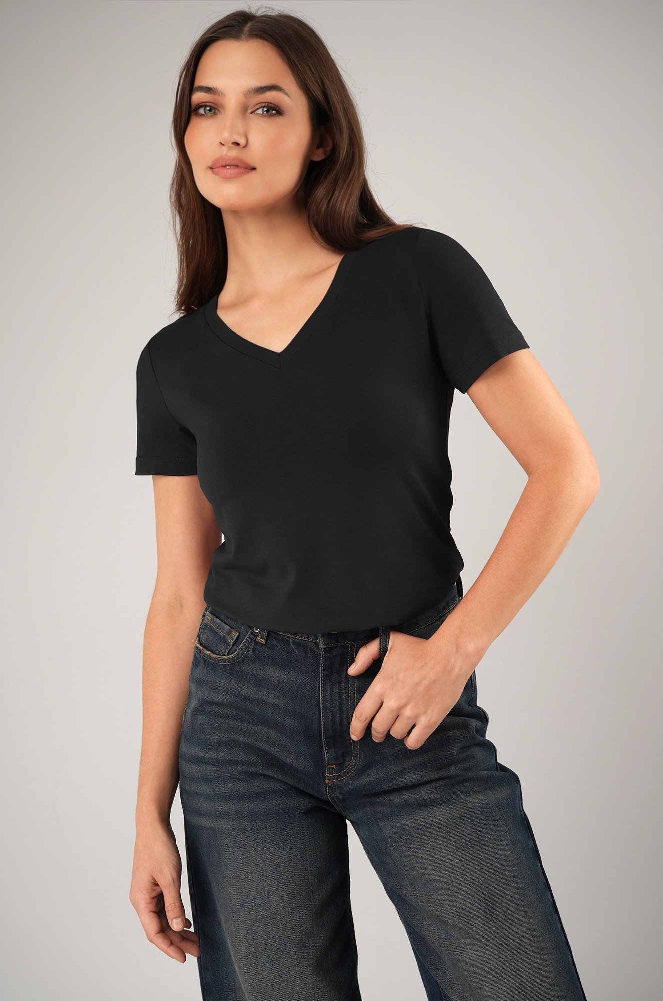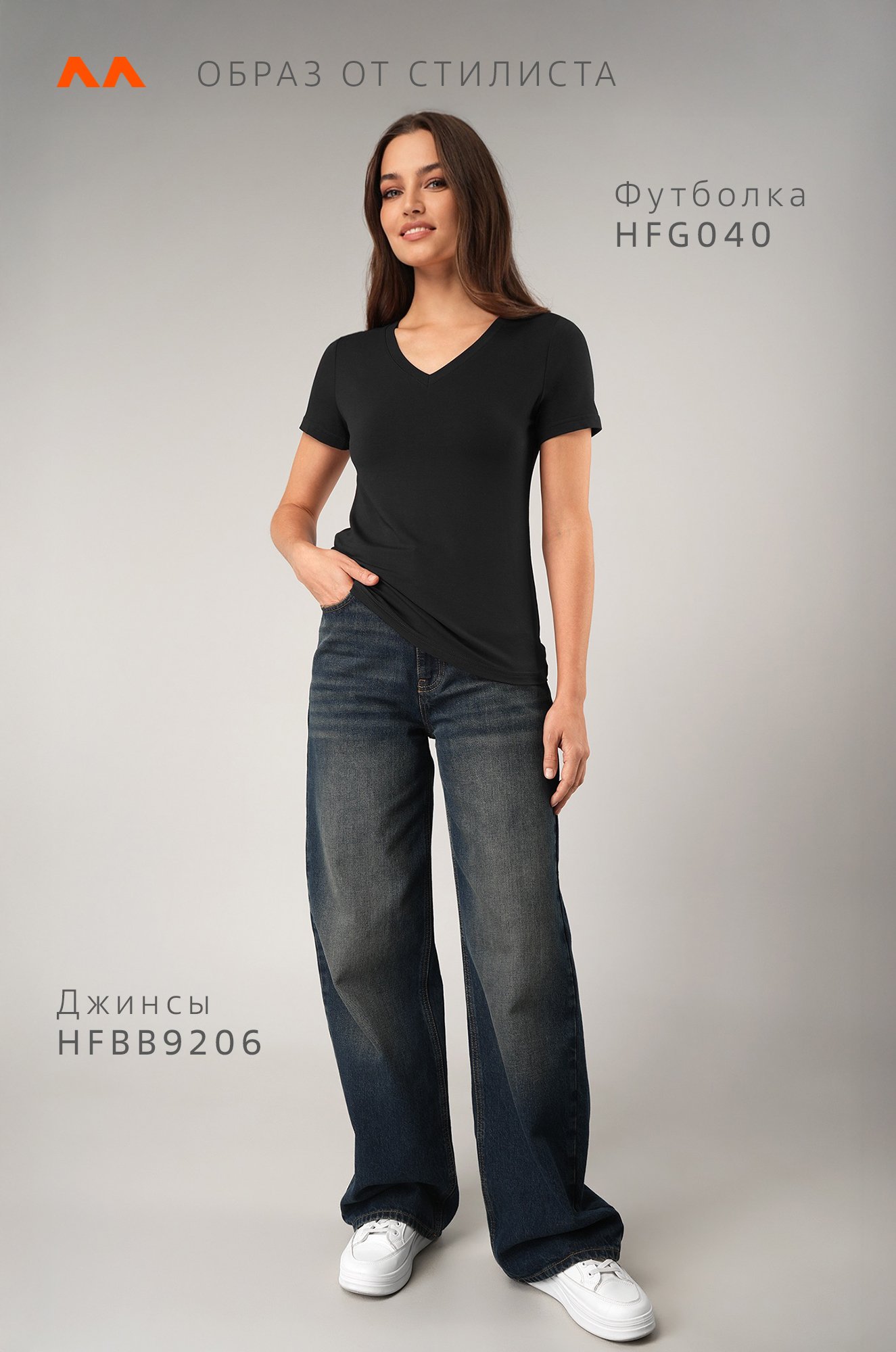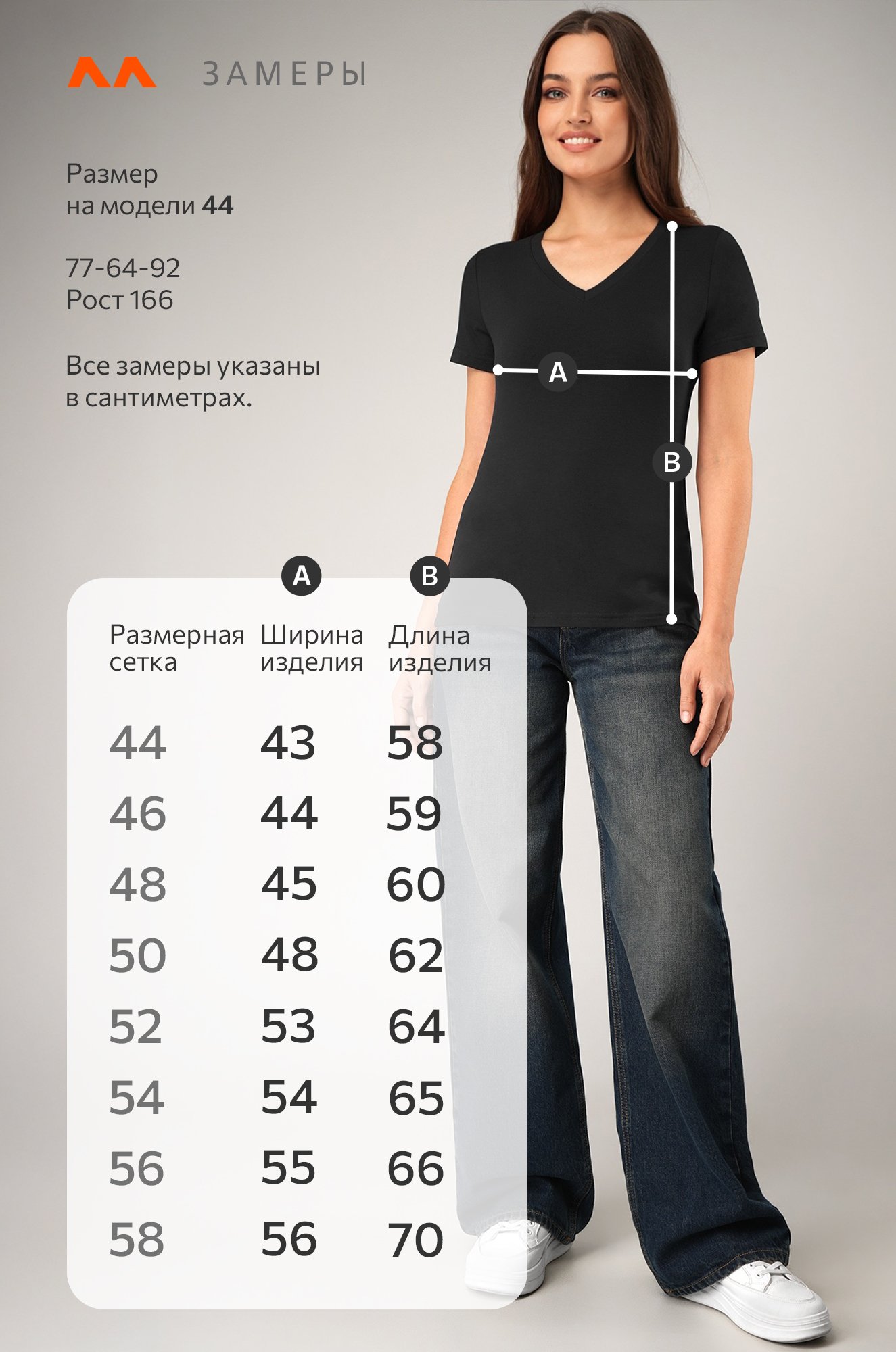 Базовая женская футболка из вискозы – настоящая находка для любителей приталенного силуэта. Модель с V-образным вырезом подчеркивает шею и зону декольте и выглядит очень женственно.