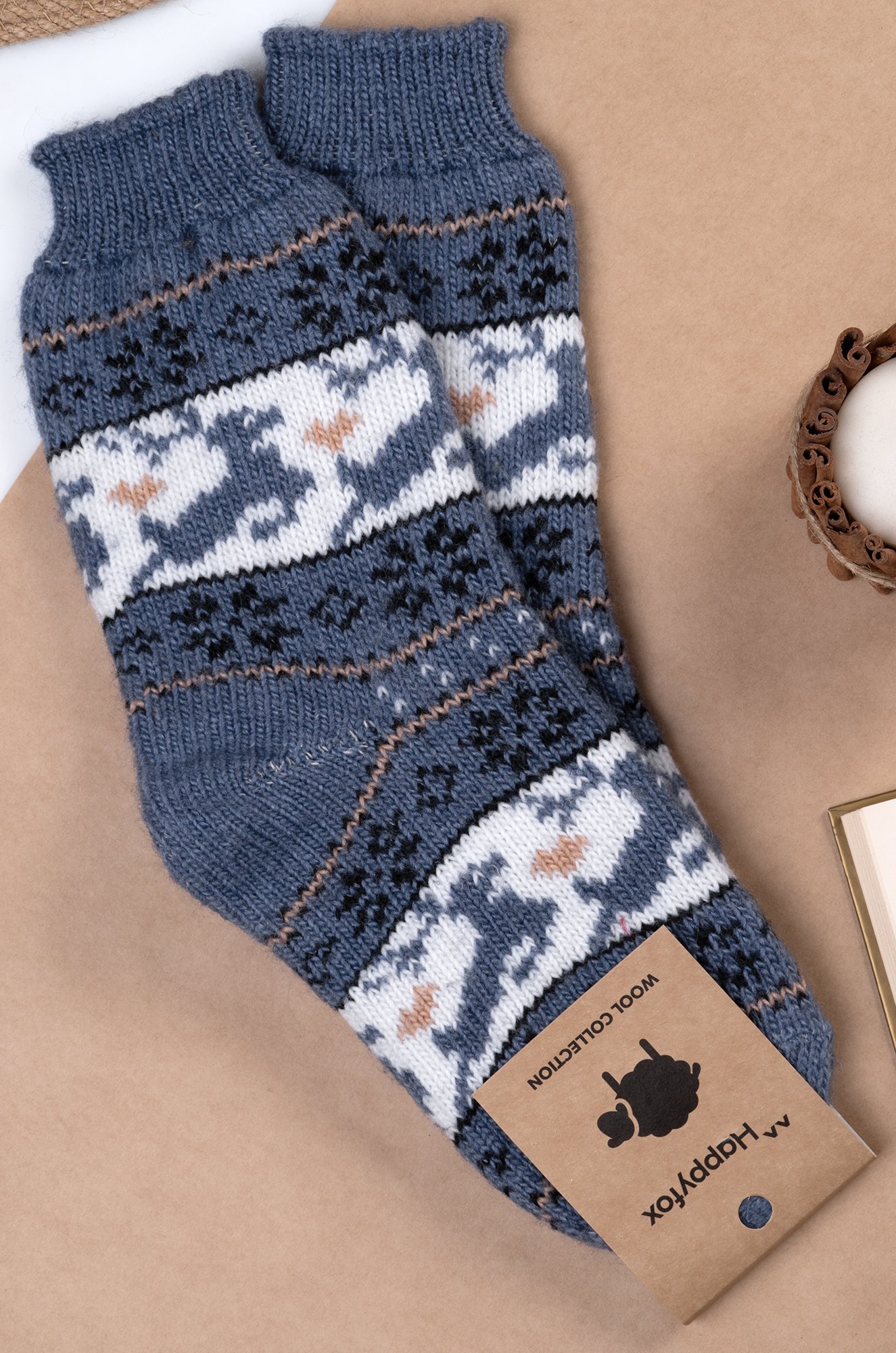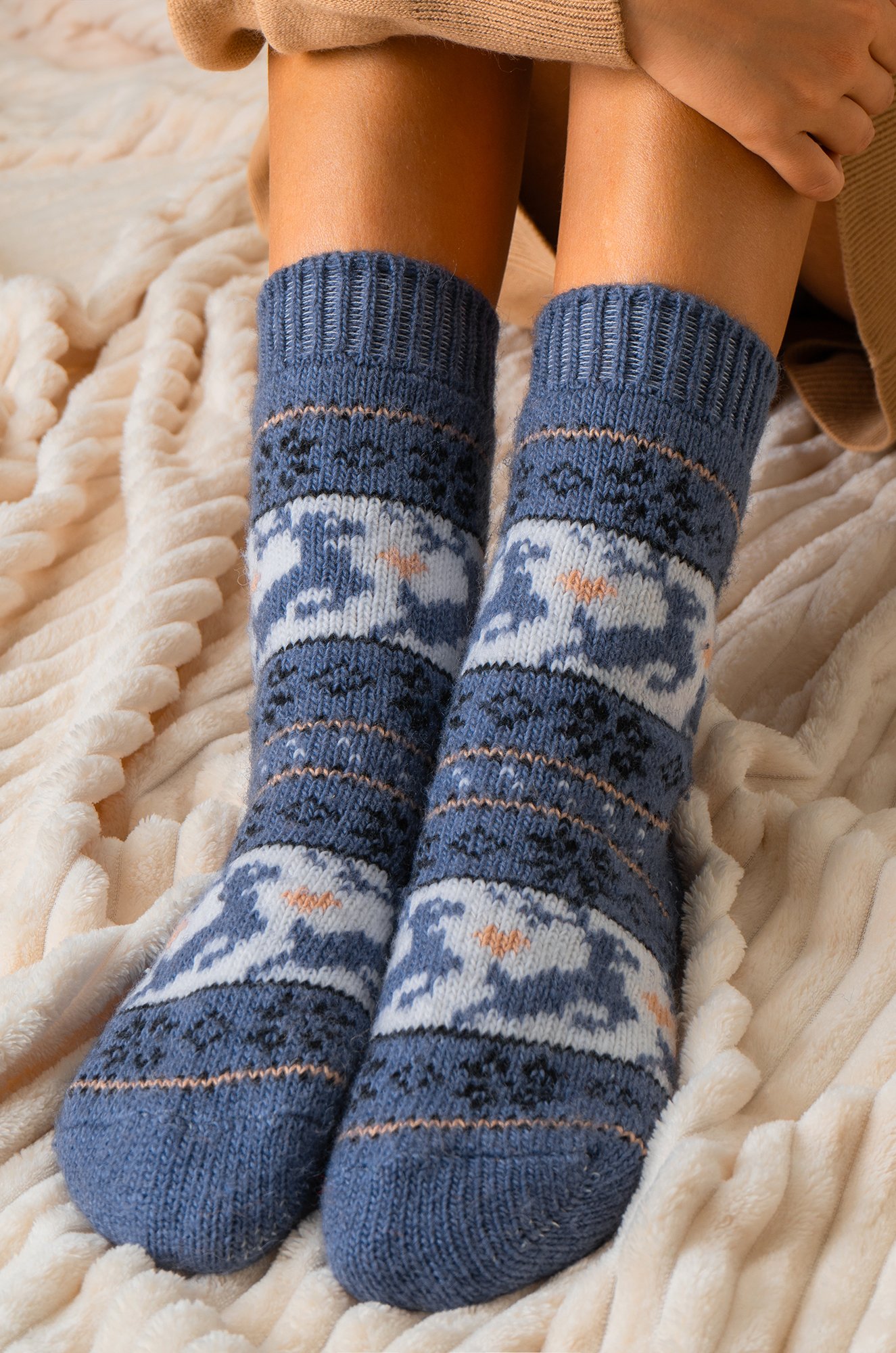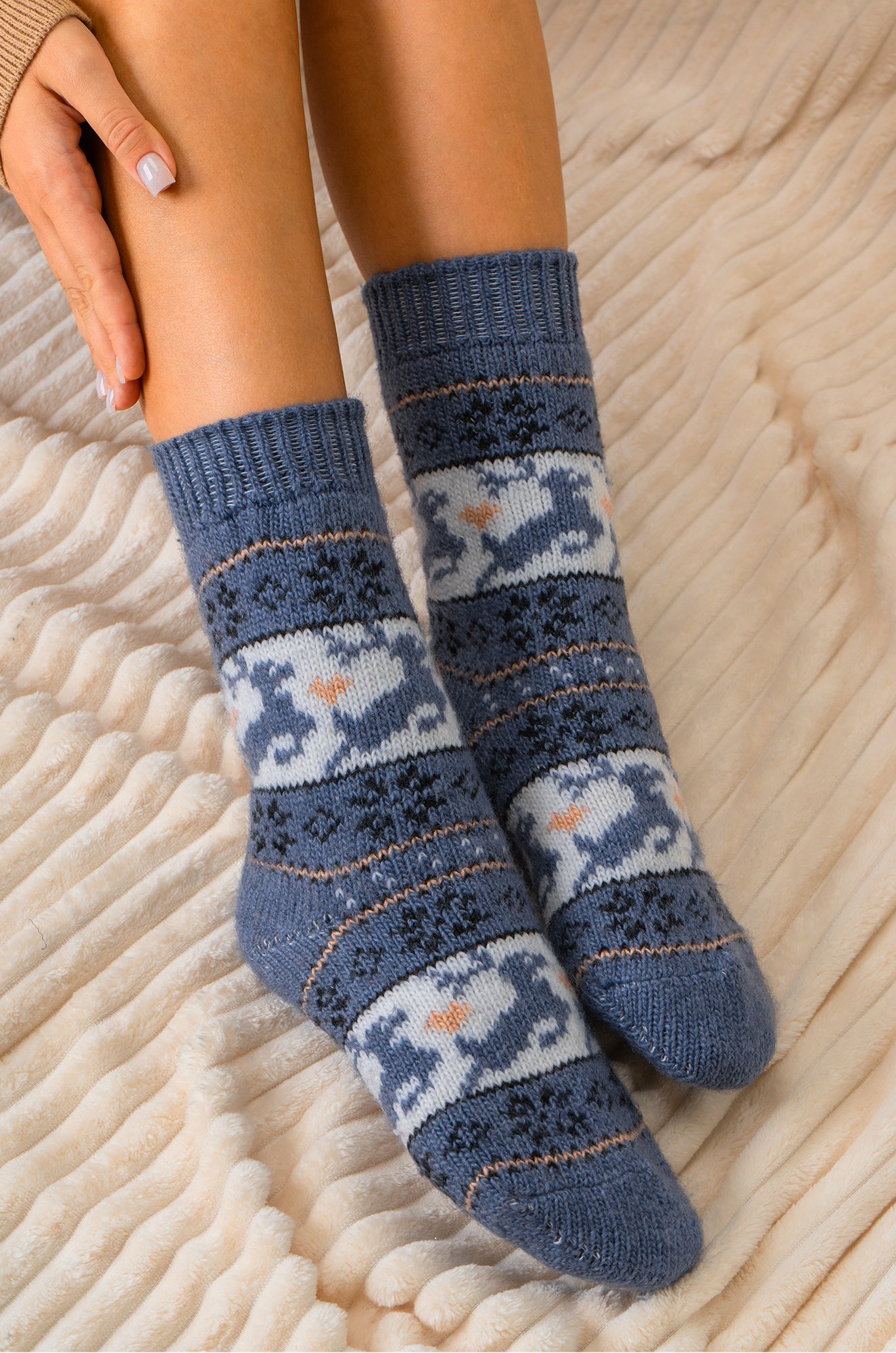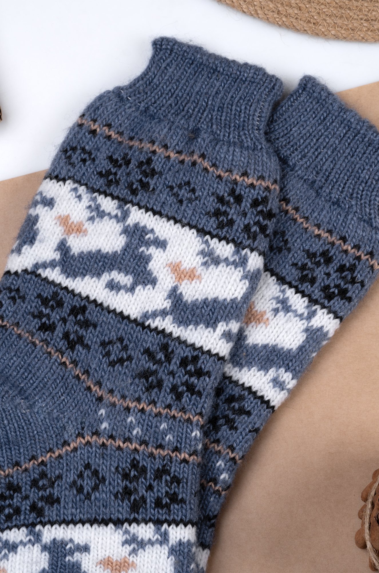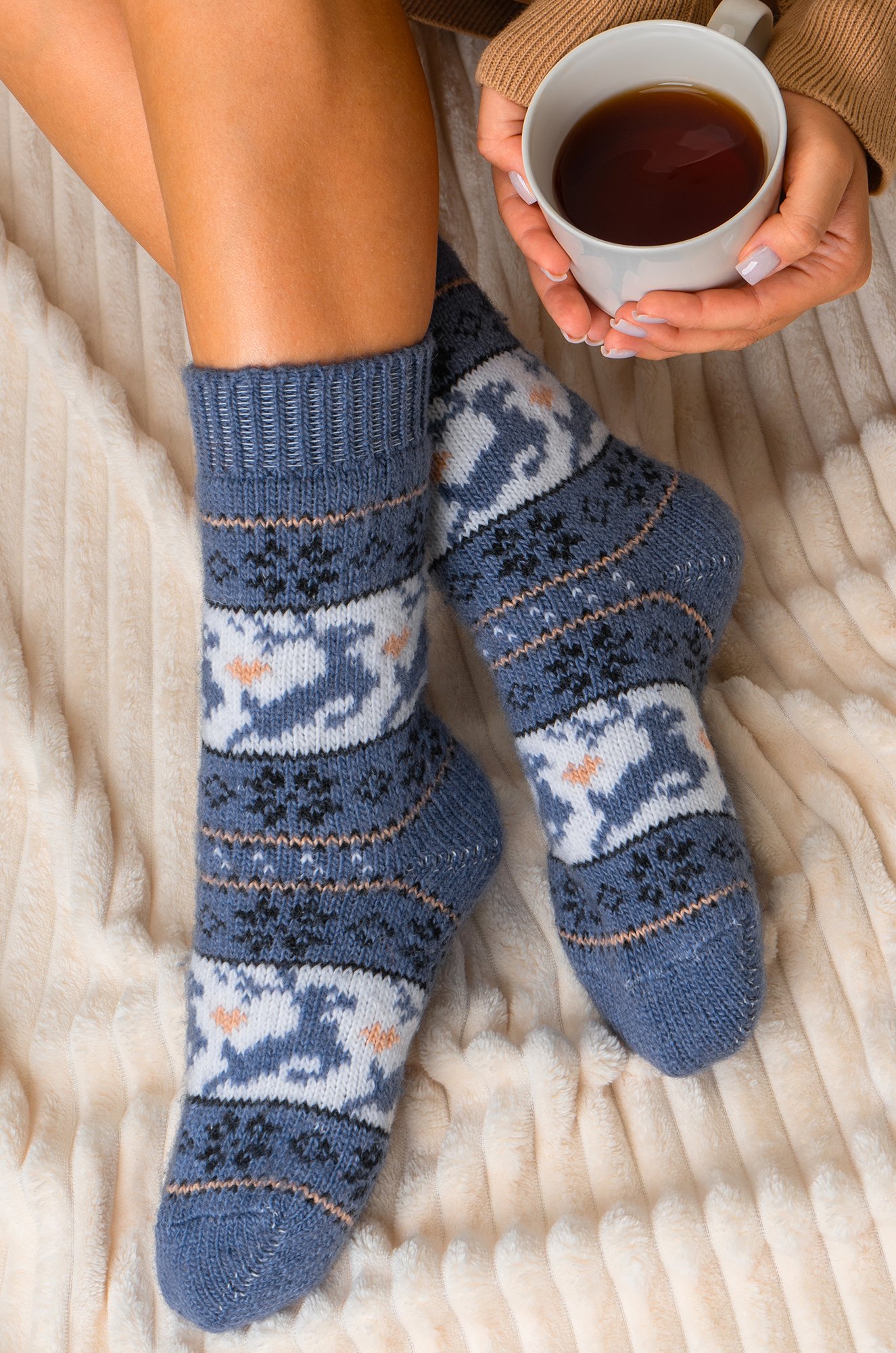 Женские носки выполнены из мягкой и приятной к телу шерстяной пряжи. Красивый орнамент с рисунком Олени делают вязаные носки синего цвета стильным и практичным аксессуаром для холодной осени и зимы.
