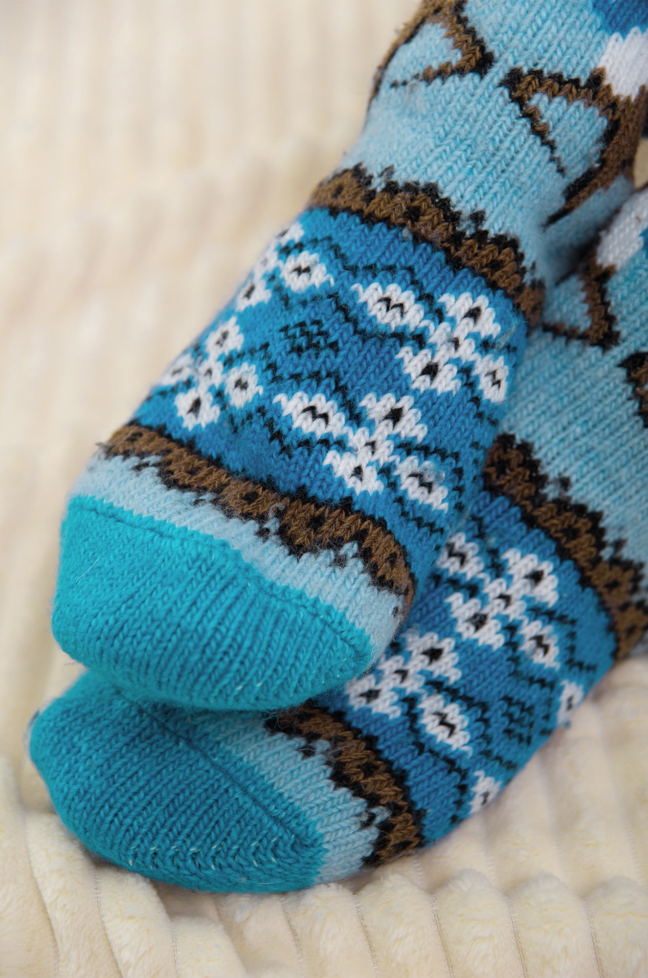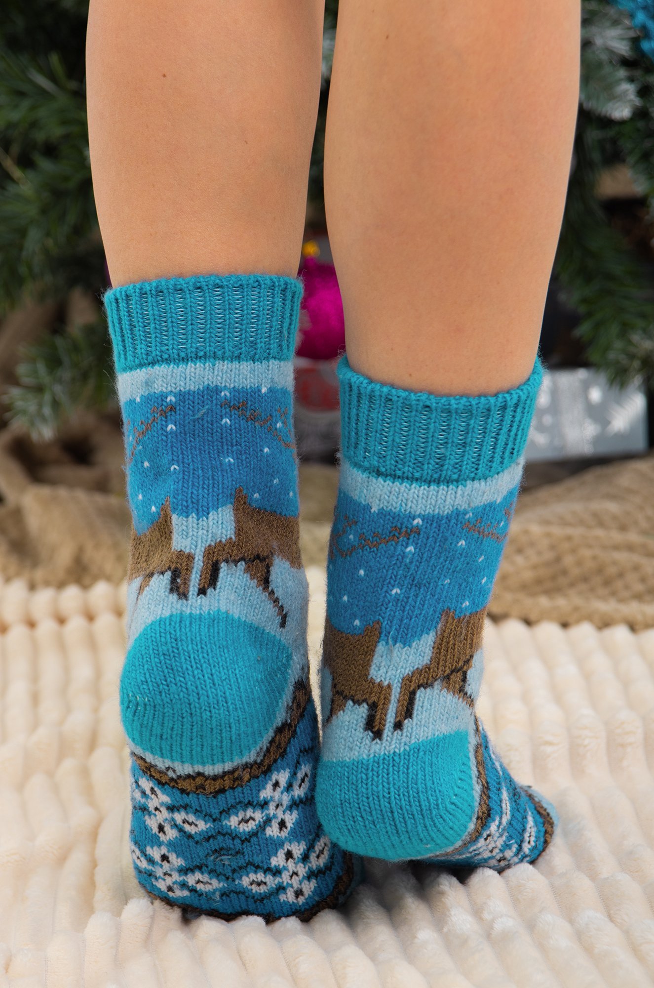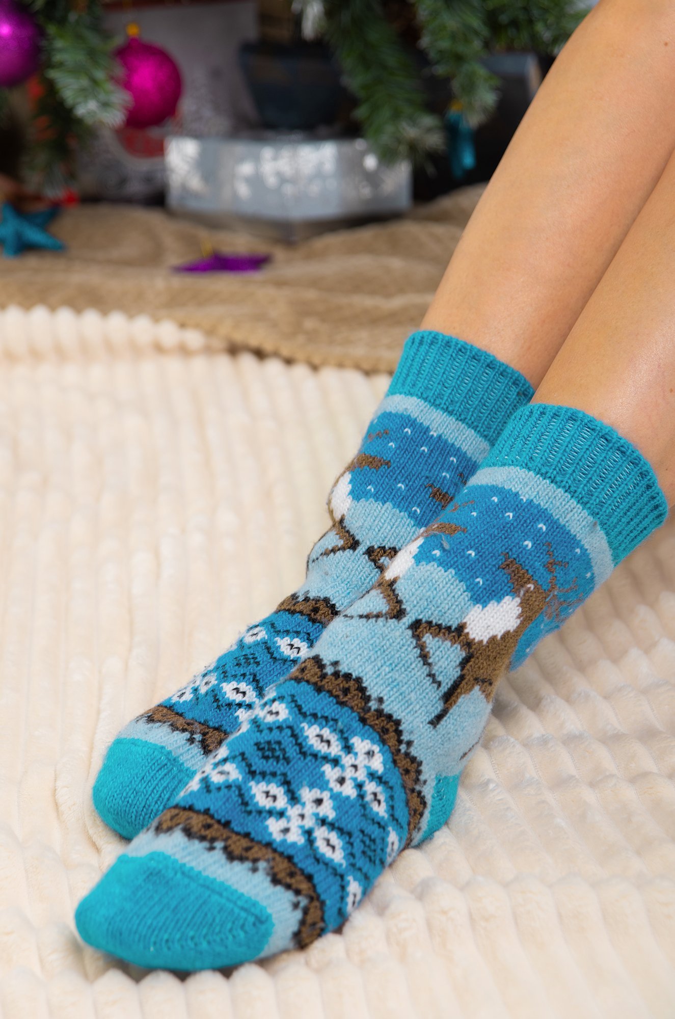 Тёплые вязаные носки из шерсти подойдут женщинам, которые ценят уют и тепло зимних вечеров. Голубые новогодние носки идеальны для дома, отдыха и создания праздничной атмосферы каждый день.