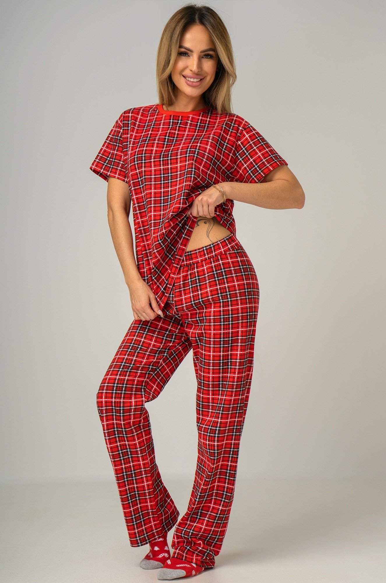 Женская трикотажная пижама со штанами в шотландскую клетку станет твоим любимым спутником для отдыха, сна и расслабленных вечеров дома или в путешествии.