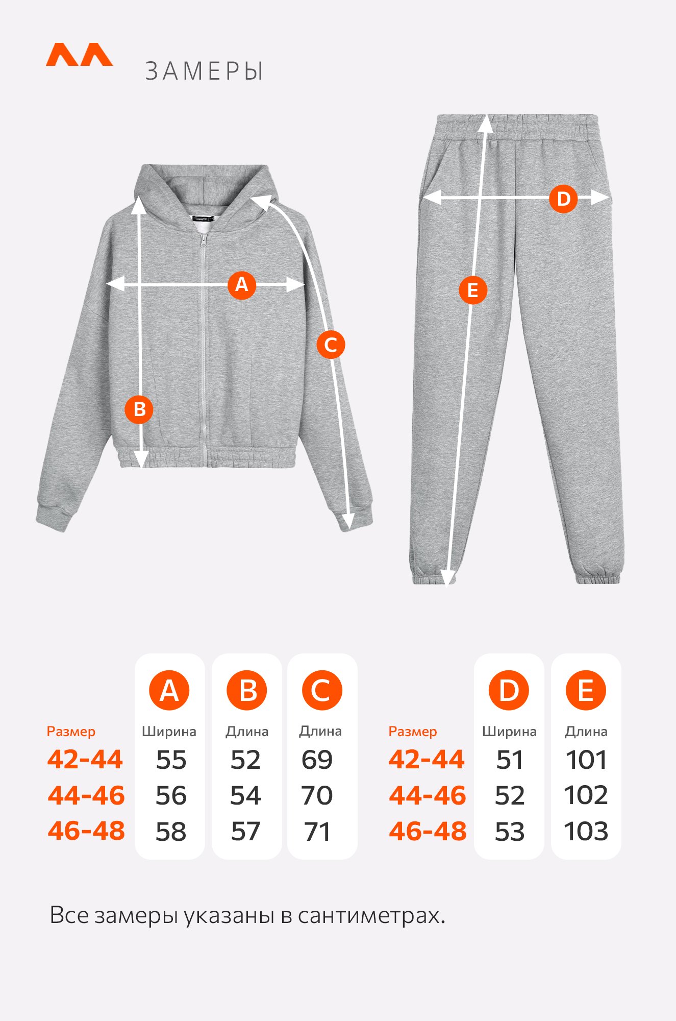 Размер 42-44: толстовка: длина:52 см; ширина:55 см; длина рукава внешняя:69 см; длина рукава внутренняя:43 см.