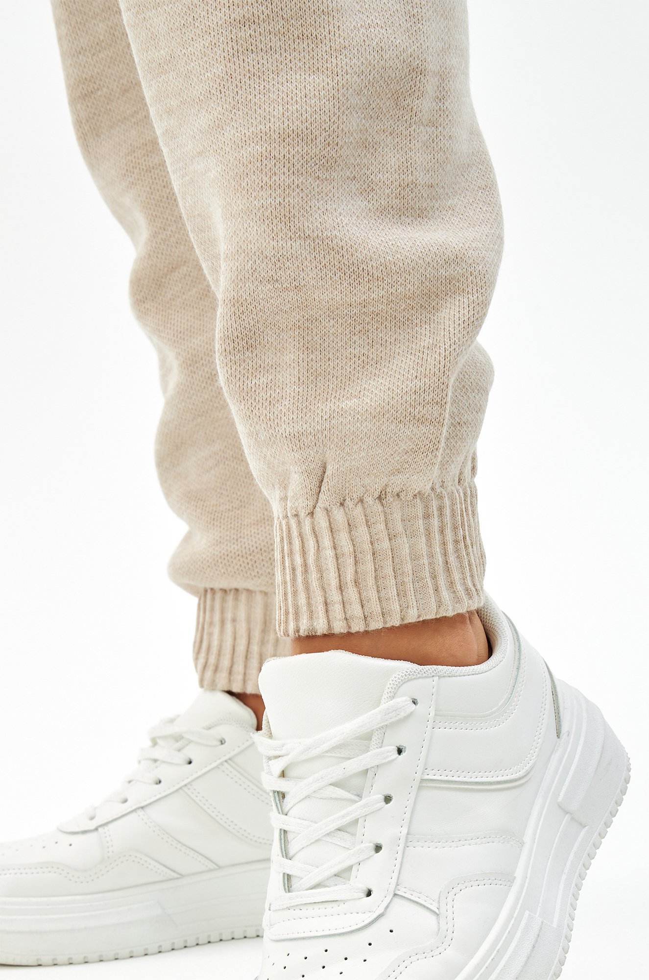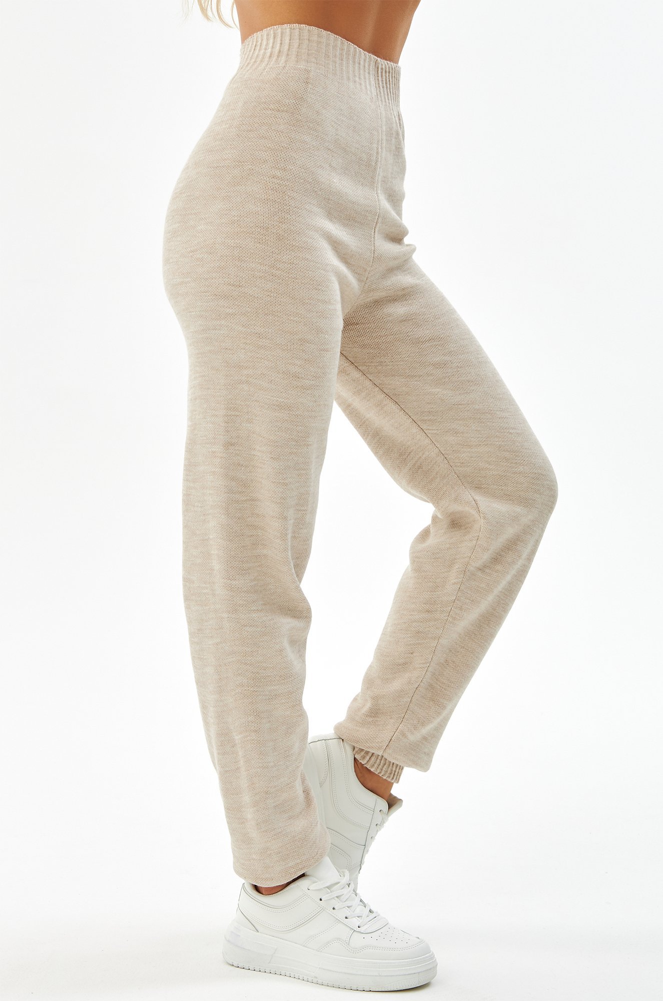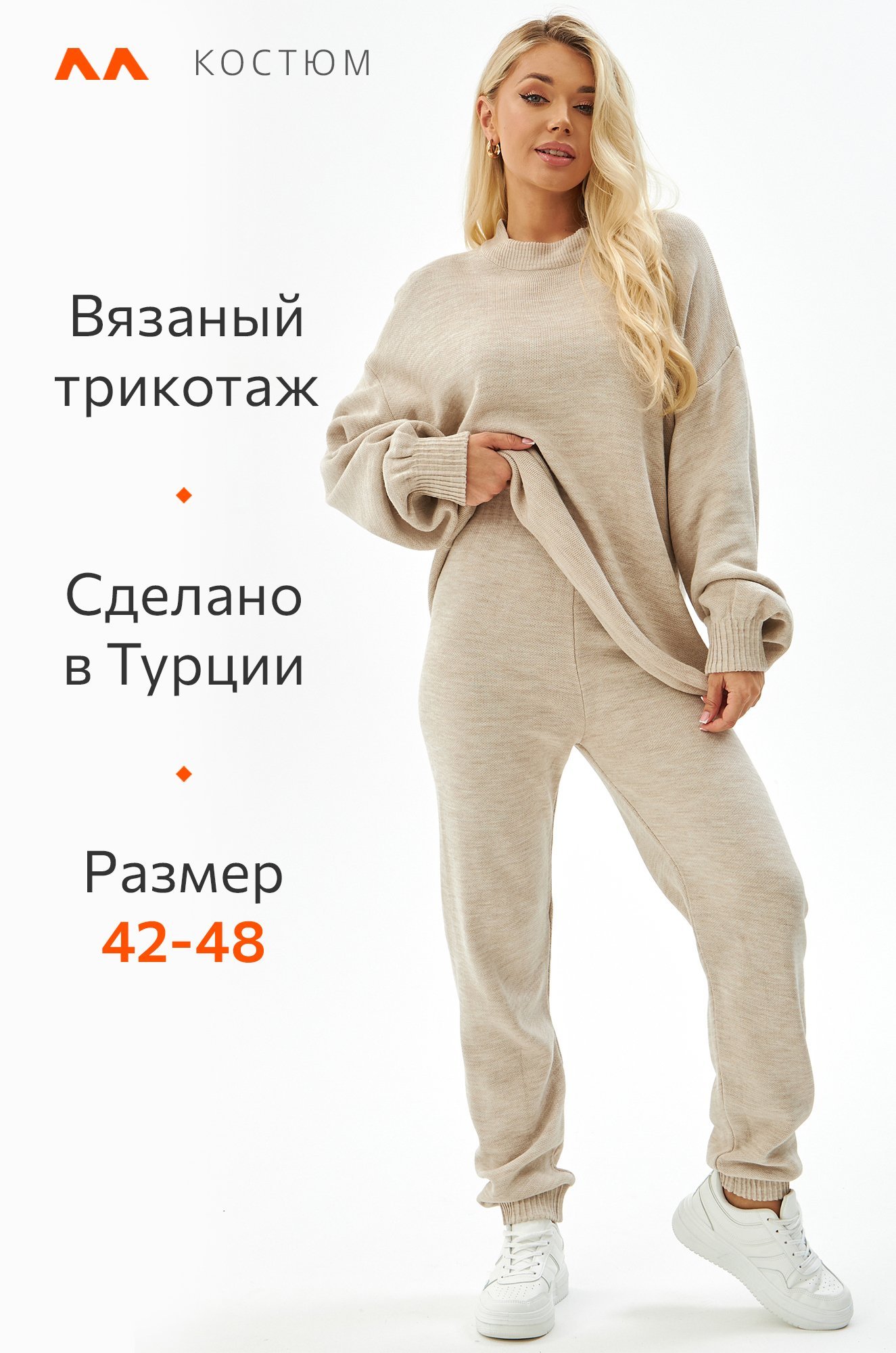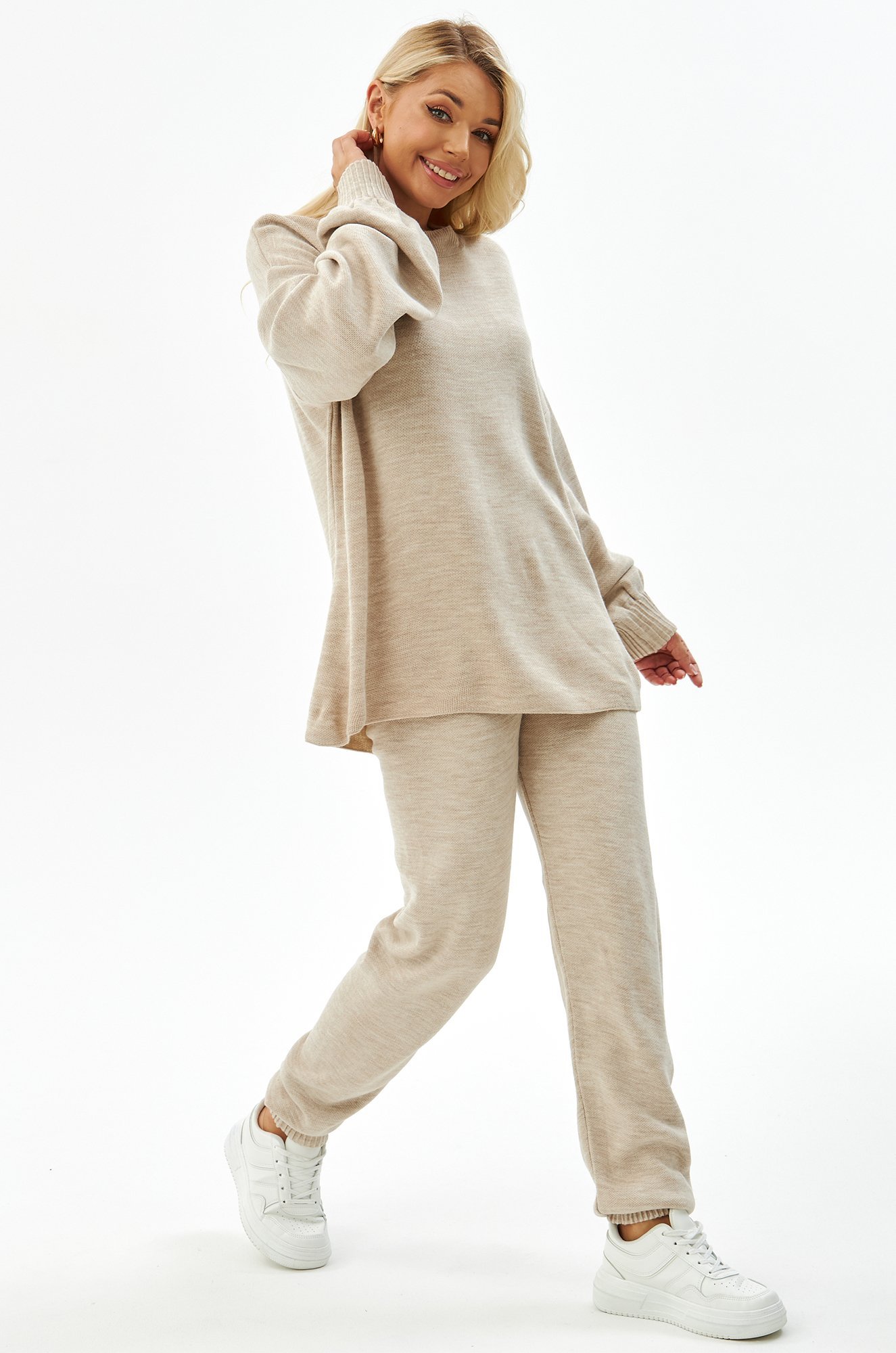 Женский костюм из вязаного трикотажа в бежевом цвете – идеальный выбор для стильных и уверенных в себе леди. В комплекте джемпер оверсайз и брюки джоггеры на резинке.
