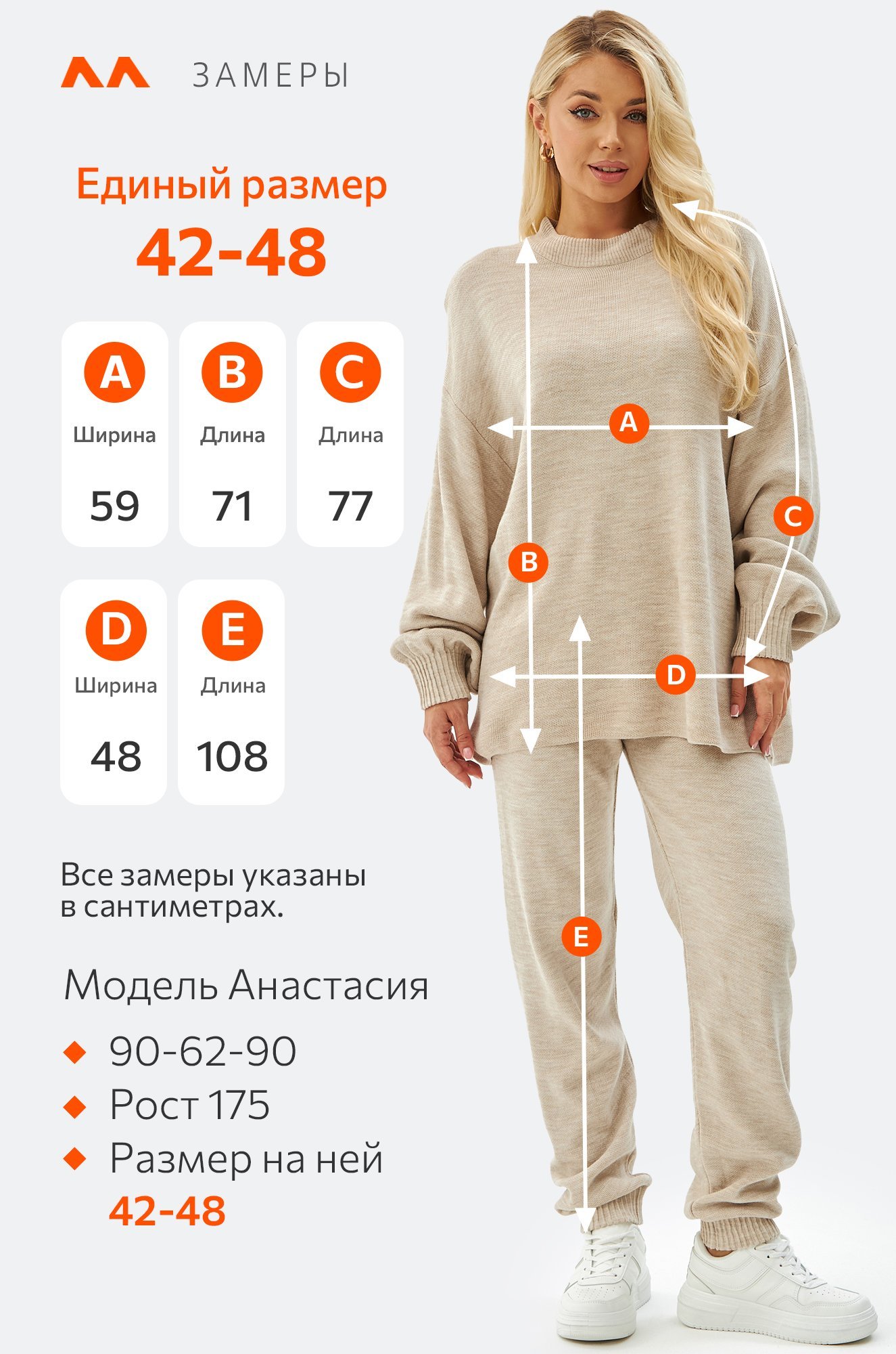 Размер 42-48: джемпер: длина:71 см; ширина:59 см; длина рукава внешняя:77 см; длина рукава внутренняя:56 см.