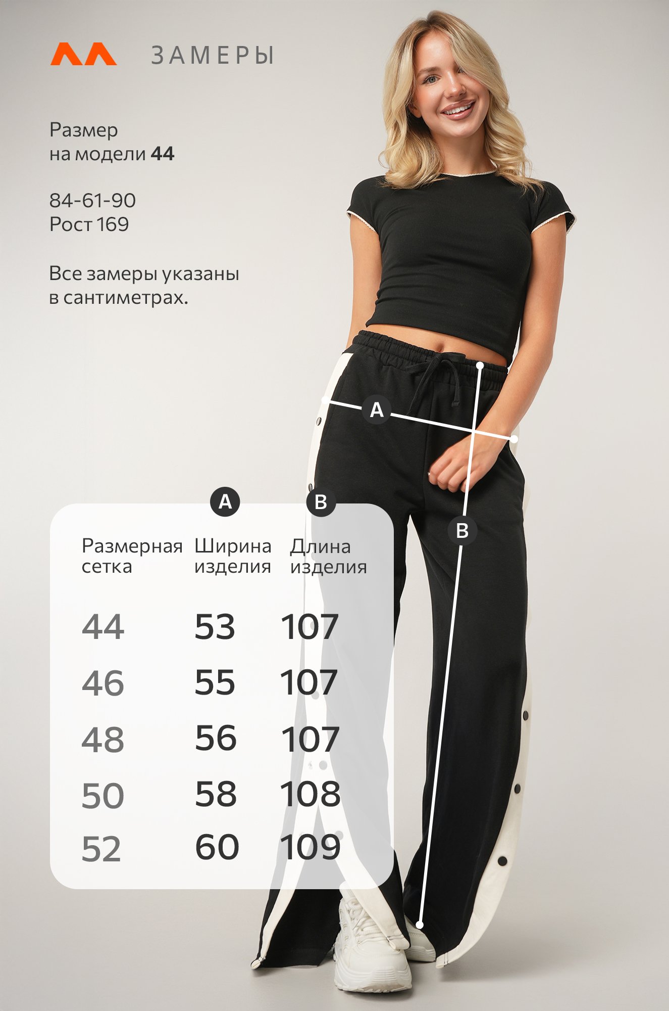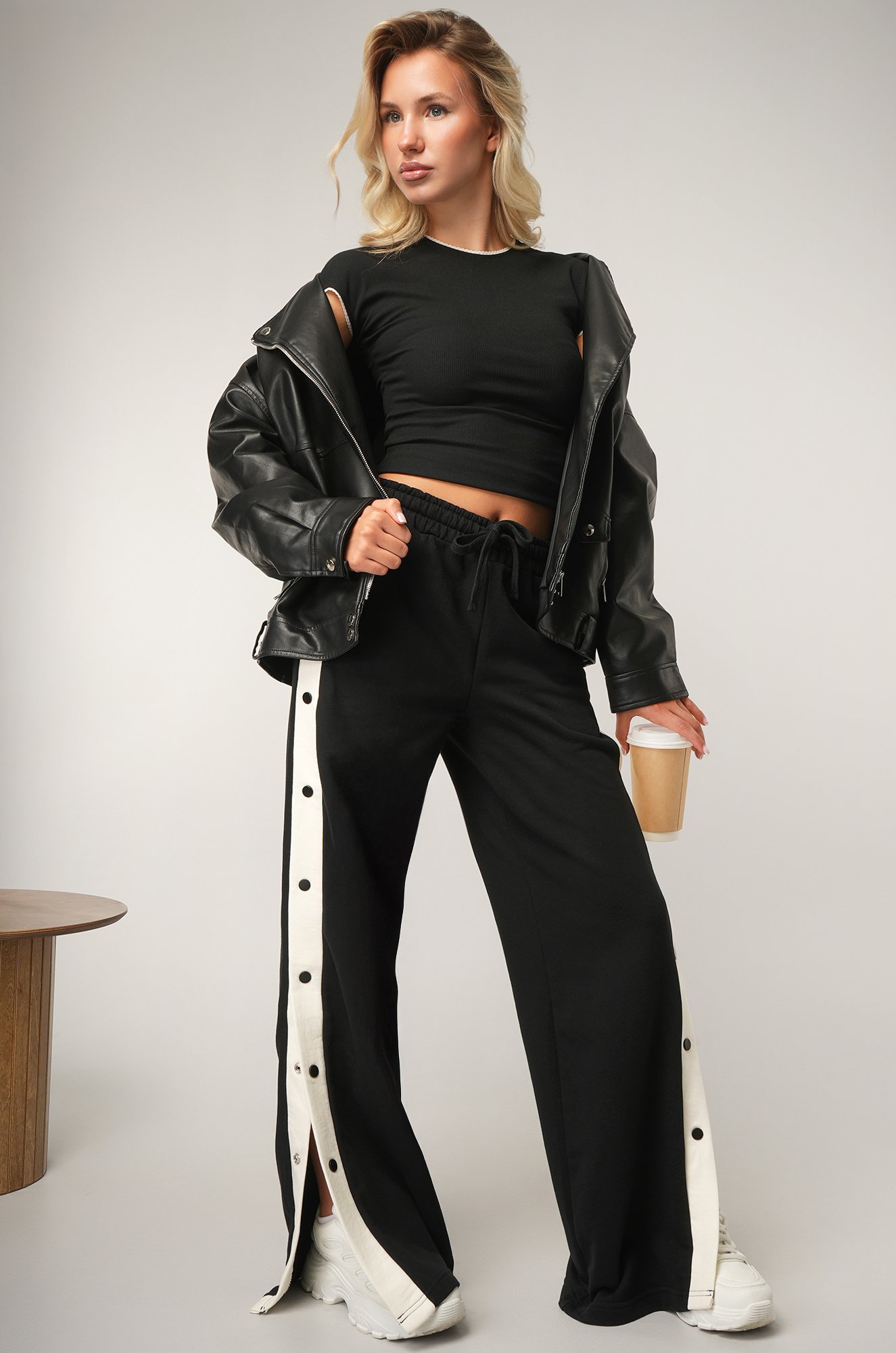 Эффектные женские брюки и выразительный спортивный стиль! Черные трикотажные штаны с контрастной отделкой и застежкой на кнопки сбоку сразу привлекают внимание — это идеальный вариант на каждый день в демисезонные месяцы весны и осени.