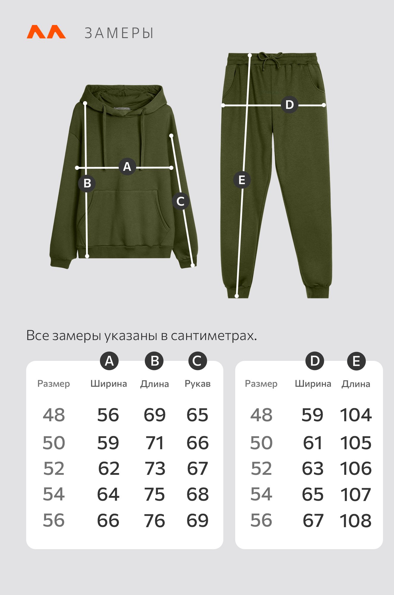 Толстовка: длина: 69 см; ширина: 56 см; длина рукава внешняя: 65 см; длина рукава внутренняя: 52 см.