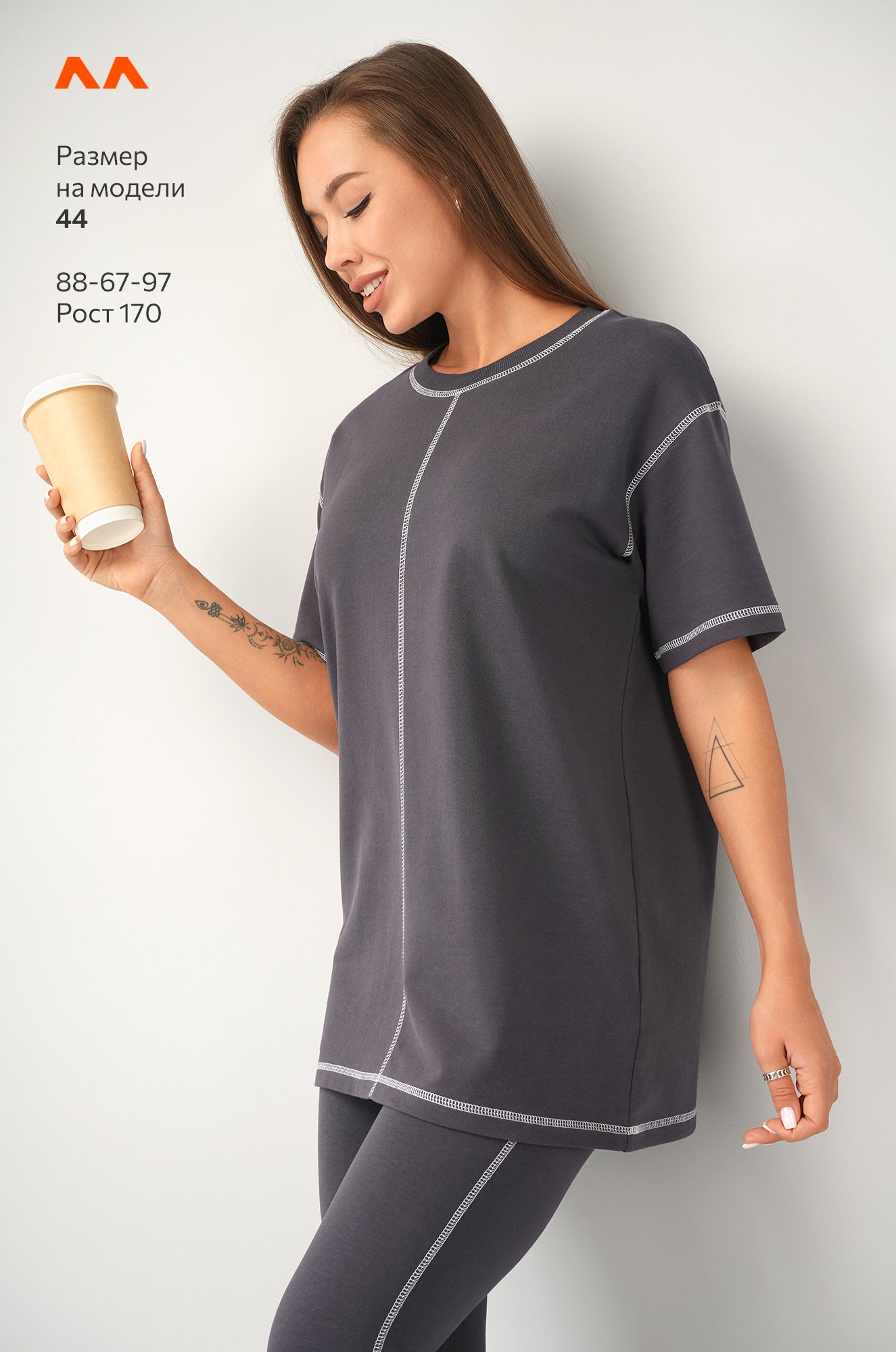 Футболка с круглым вырезом и спущенным плечом создаёт расслабленный силуэт, а лосины подчёркивают фигуру и добавляют динамики образу. Трикотажный костюм для женщин — универсальный выбор: он отлично подойдёт для спортивных занятий в зале и станет удобным домашним комплектом на каждый день.