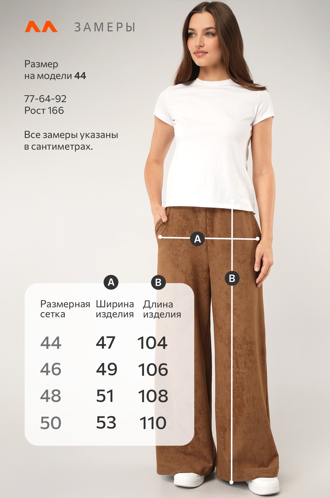 Размер 50: длина внешн.шва:110 см; длина внутр.шва:75 см; ширина по бедрам:53 см.