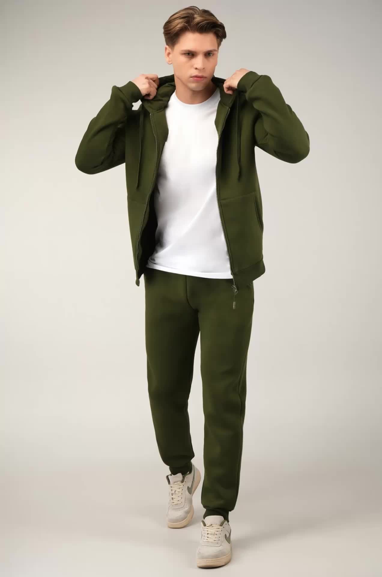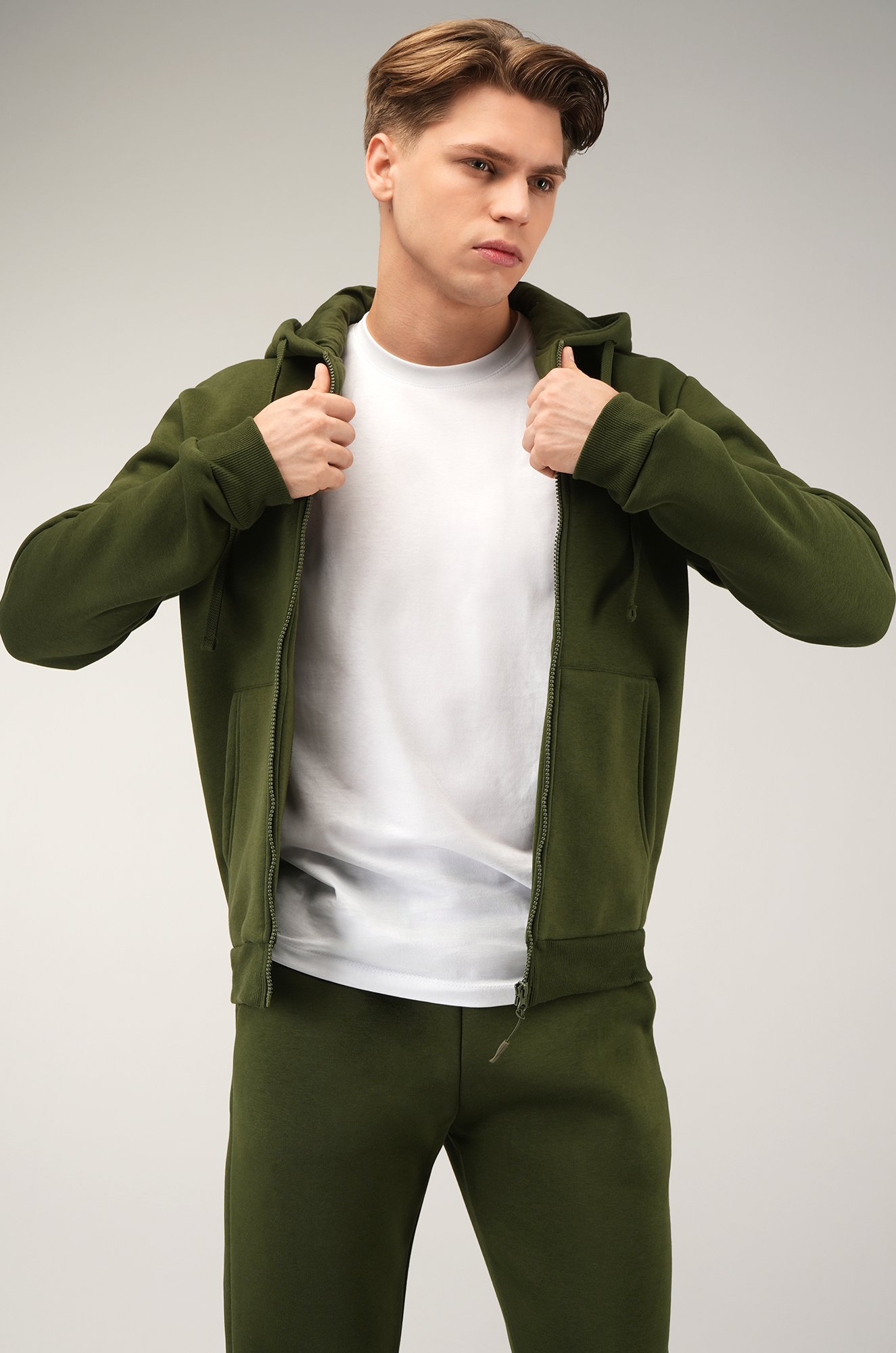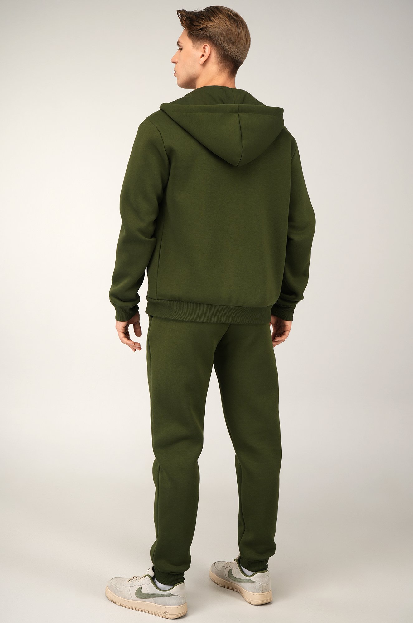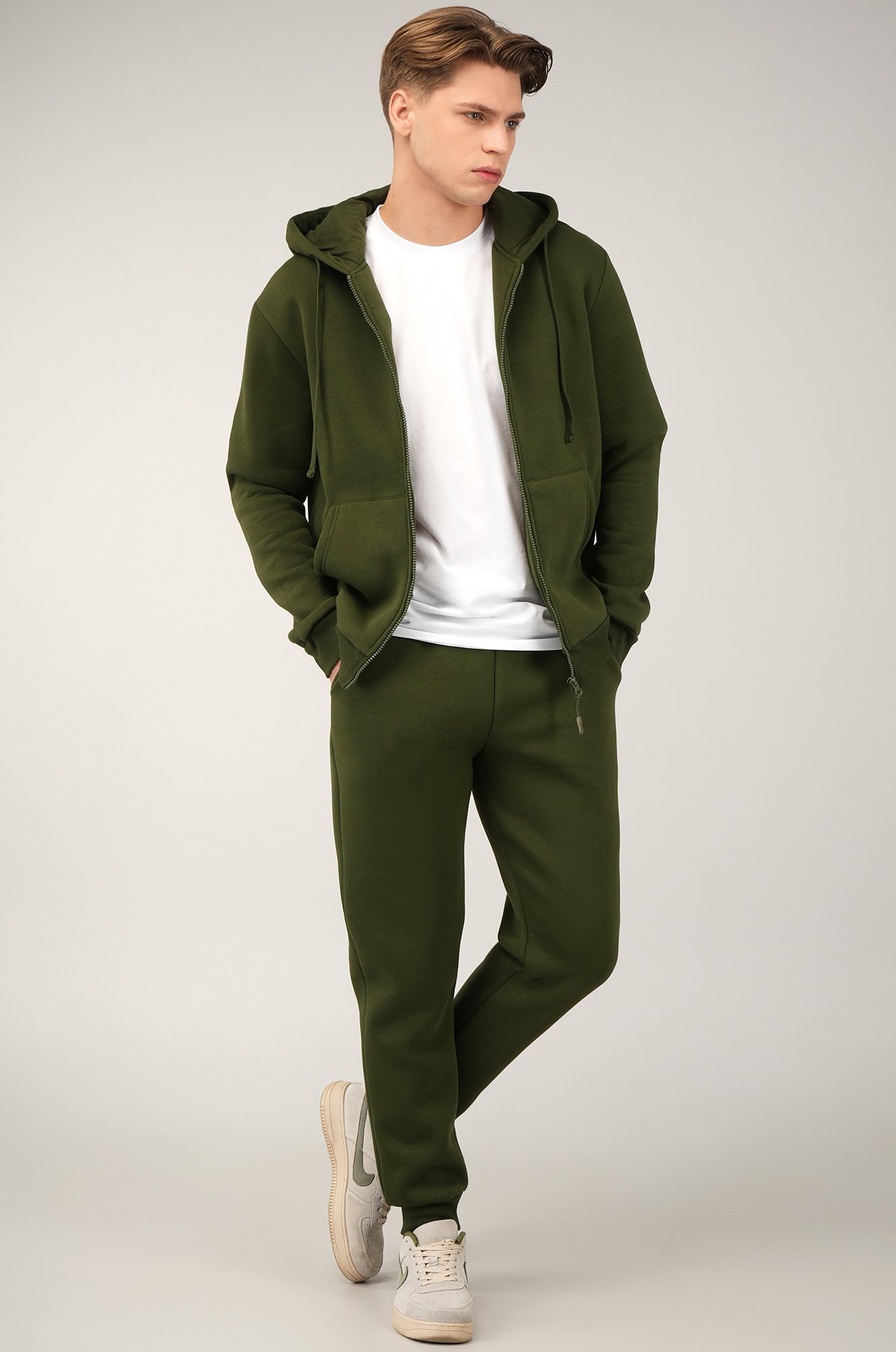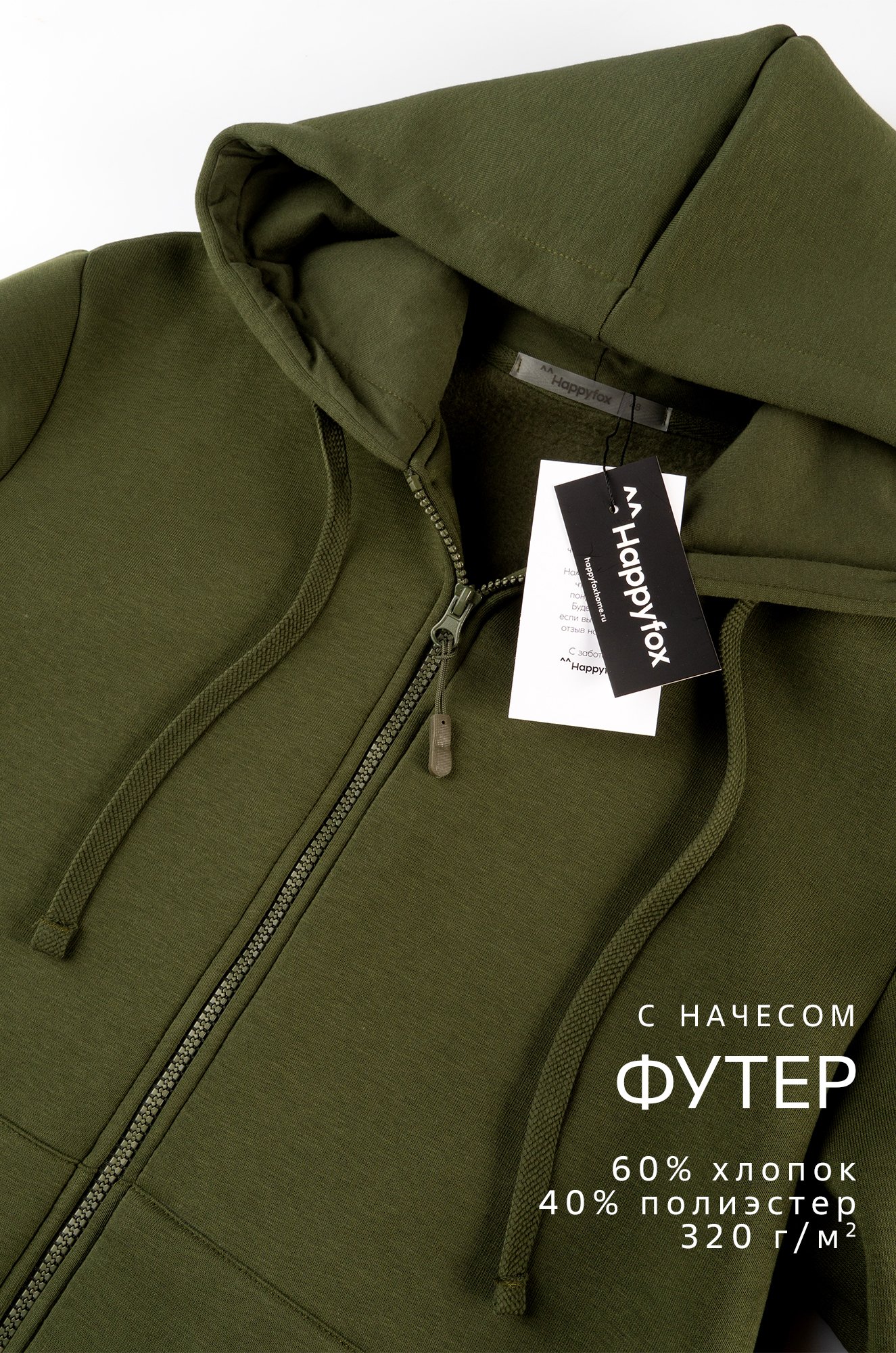 Теплый мужской костюм цвета хаки от бренда Happyfox выполнен из трикотажа футер с начесом. В комплект входят толстовка с капюшоном и брюки-джоггеры, созданные для максимального комфорта и свободы движений.