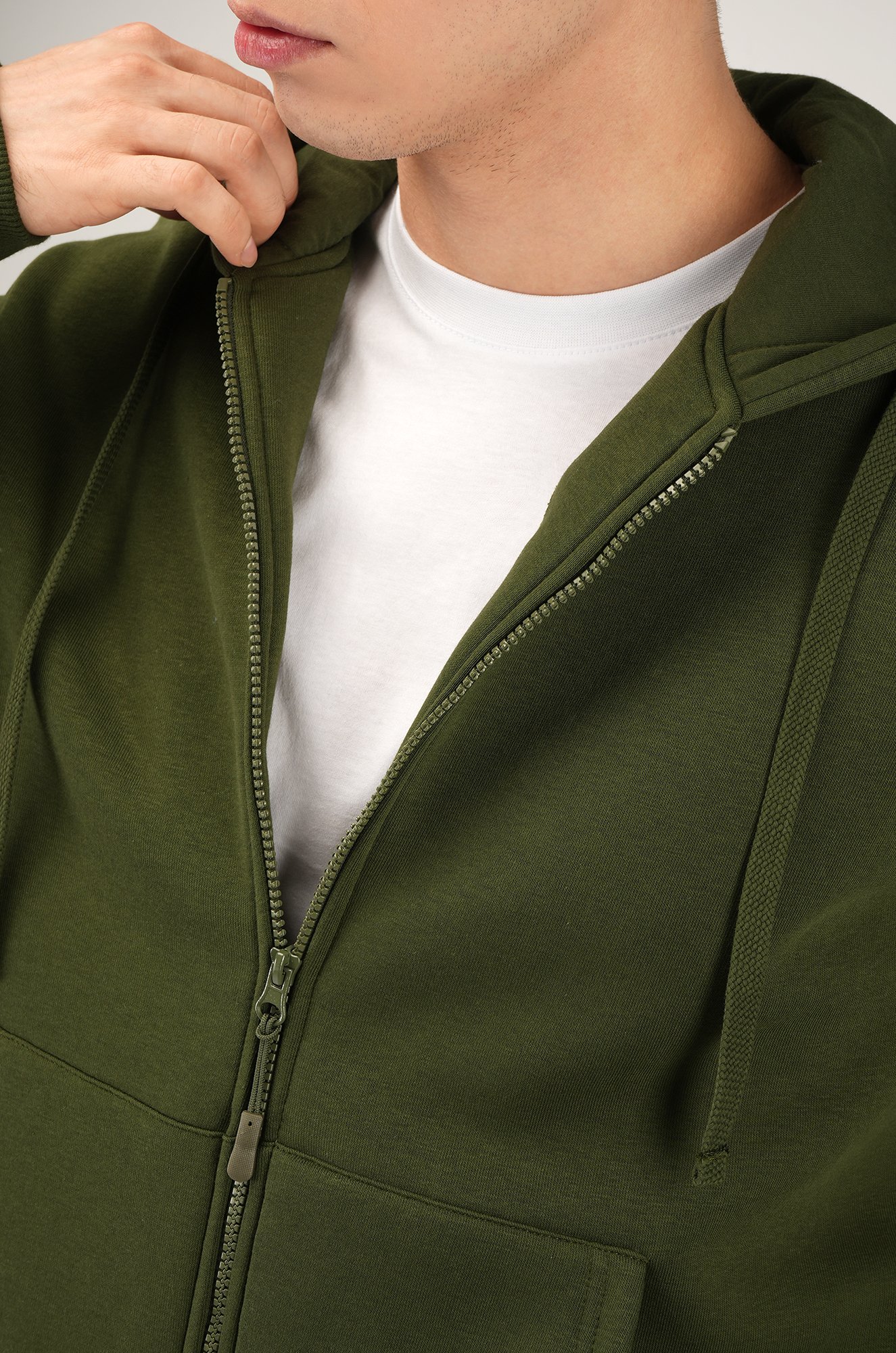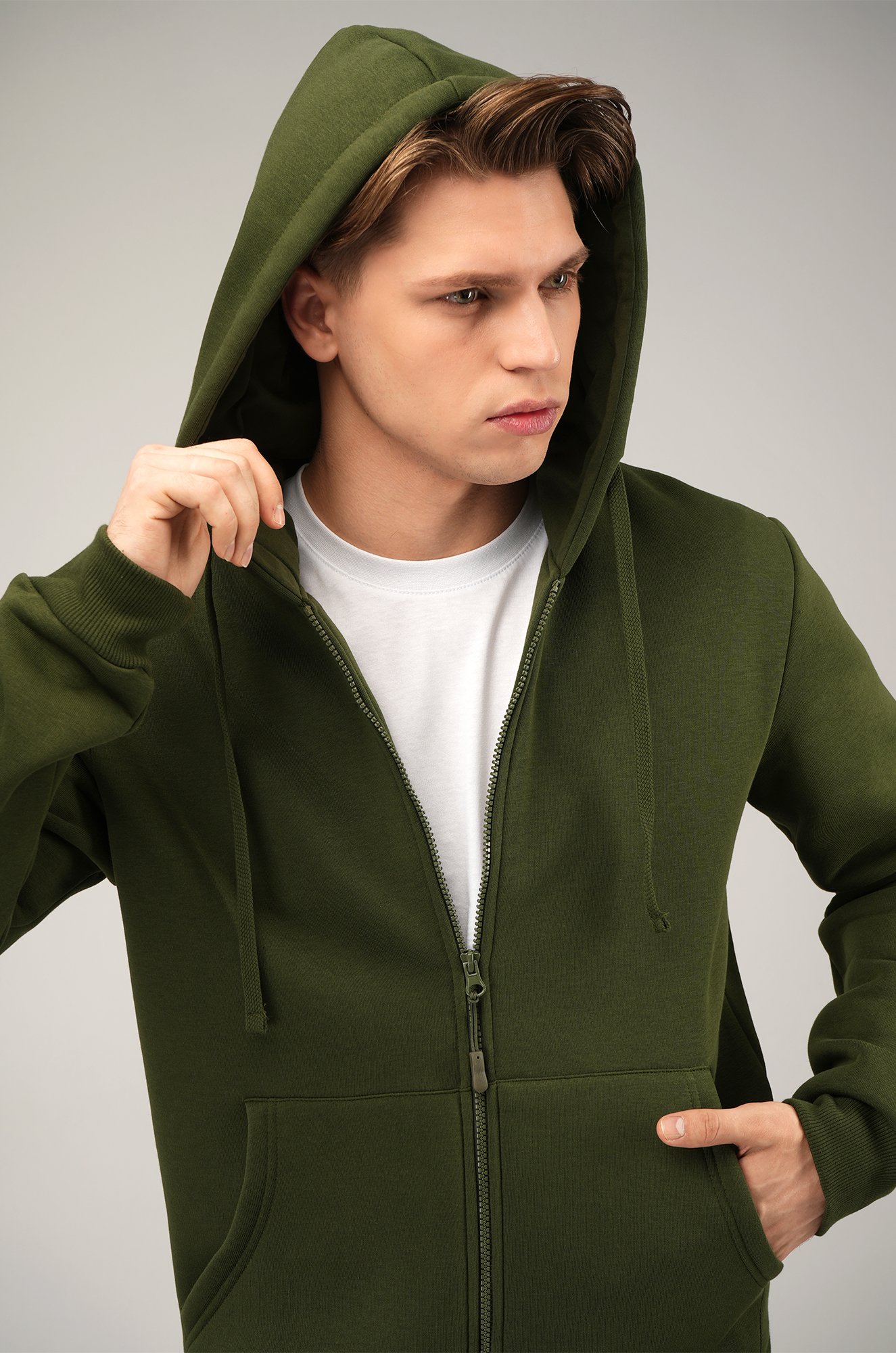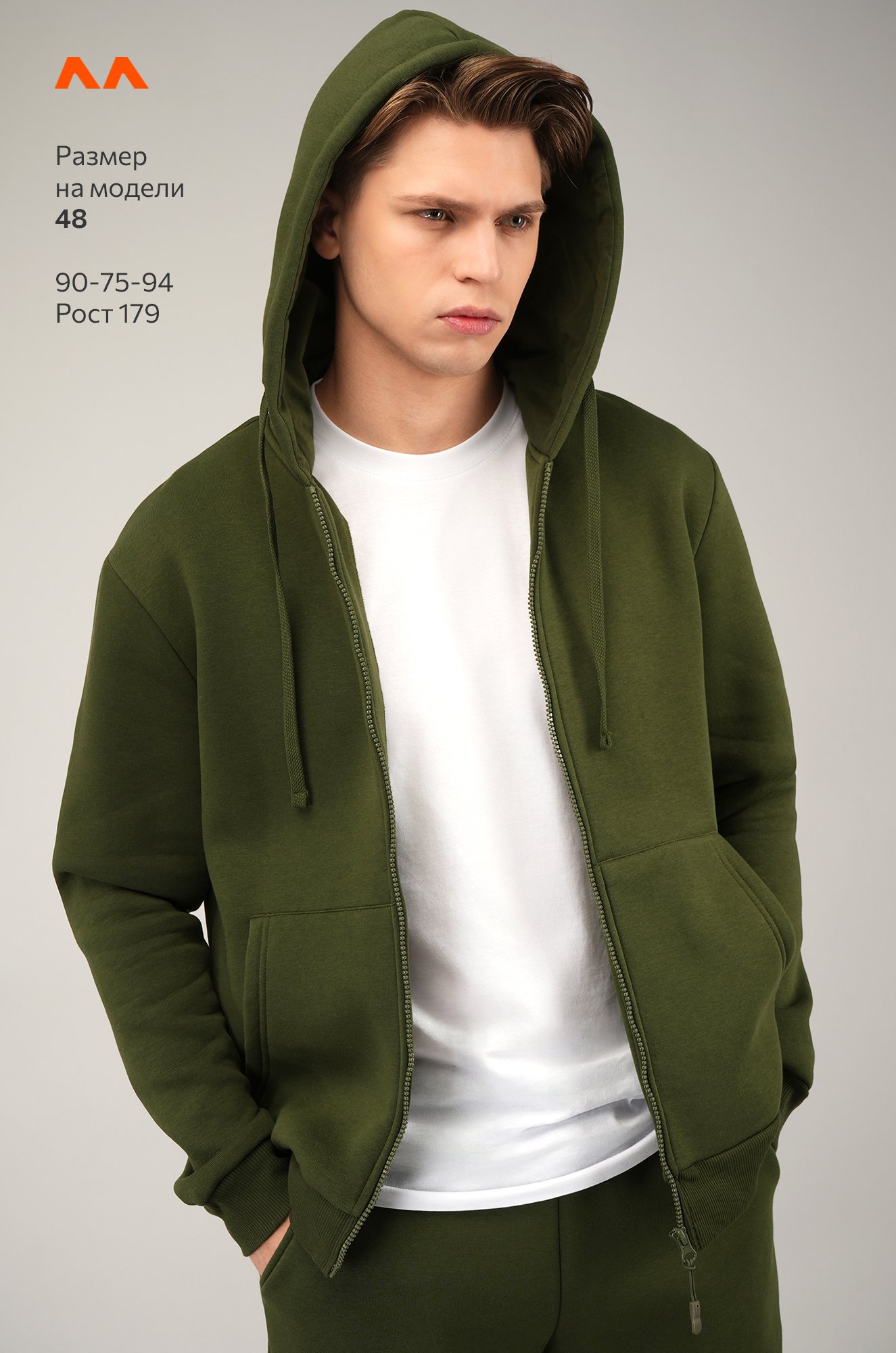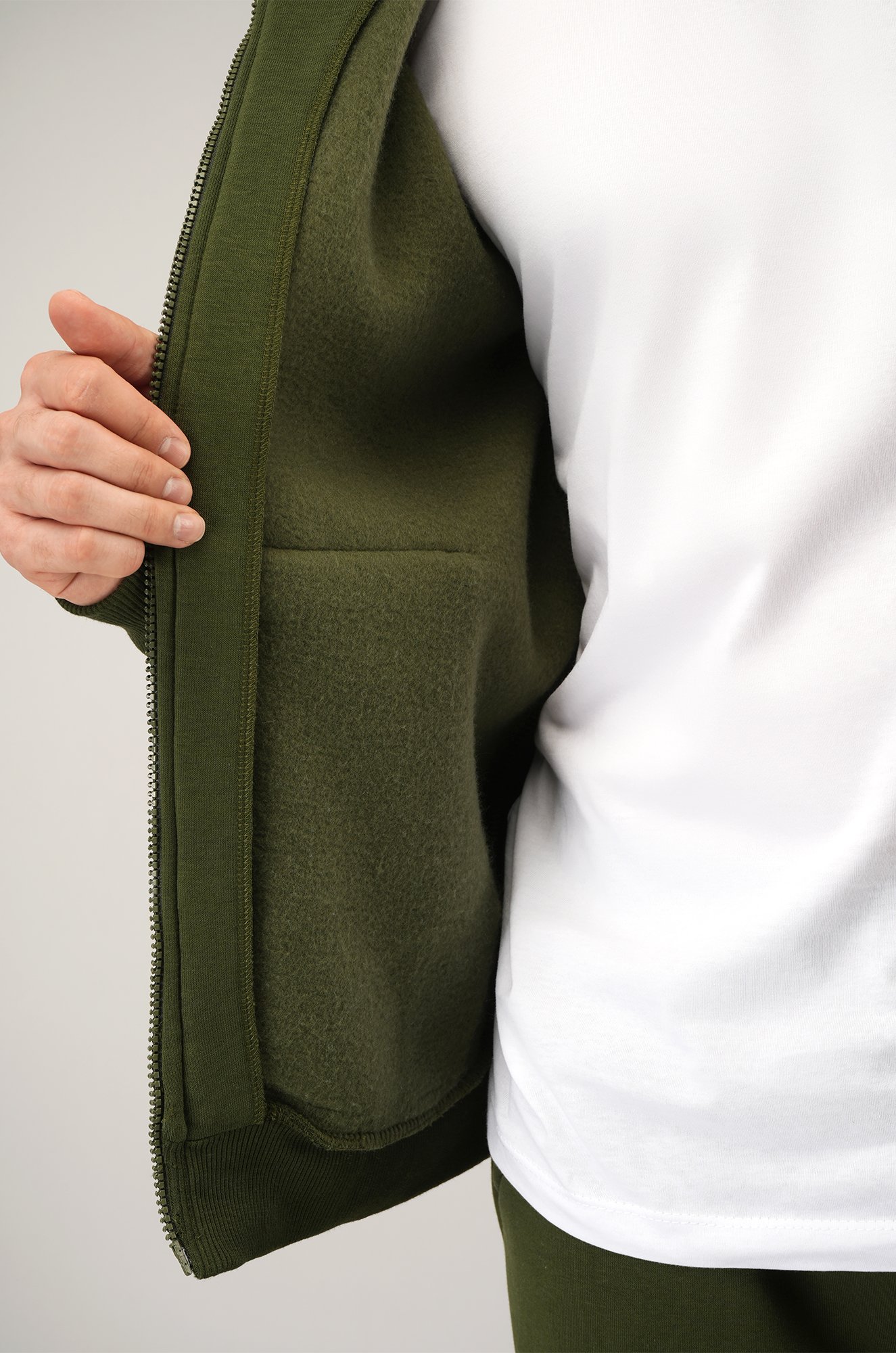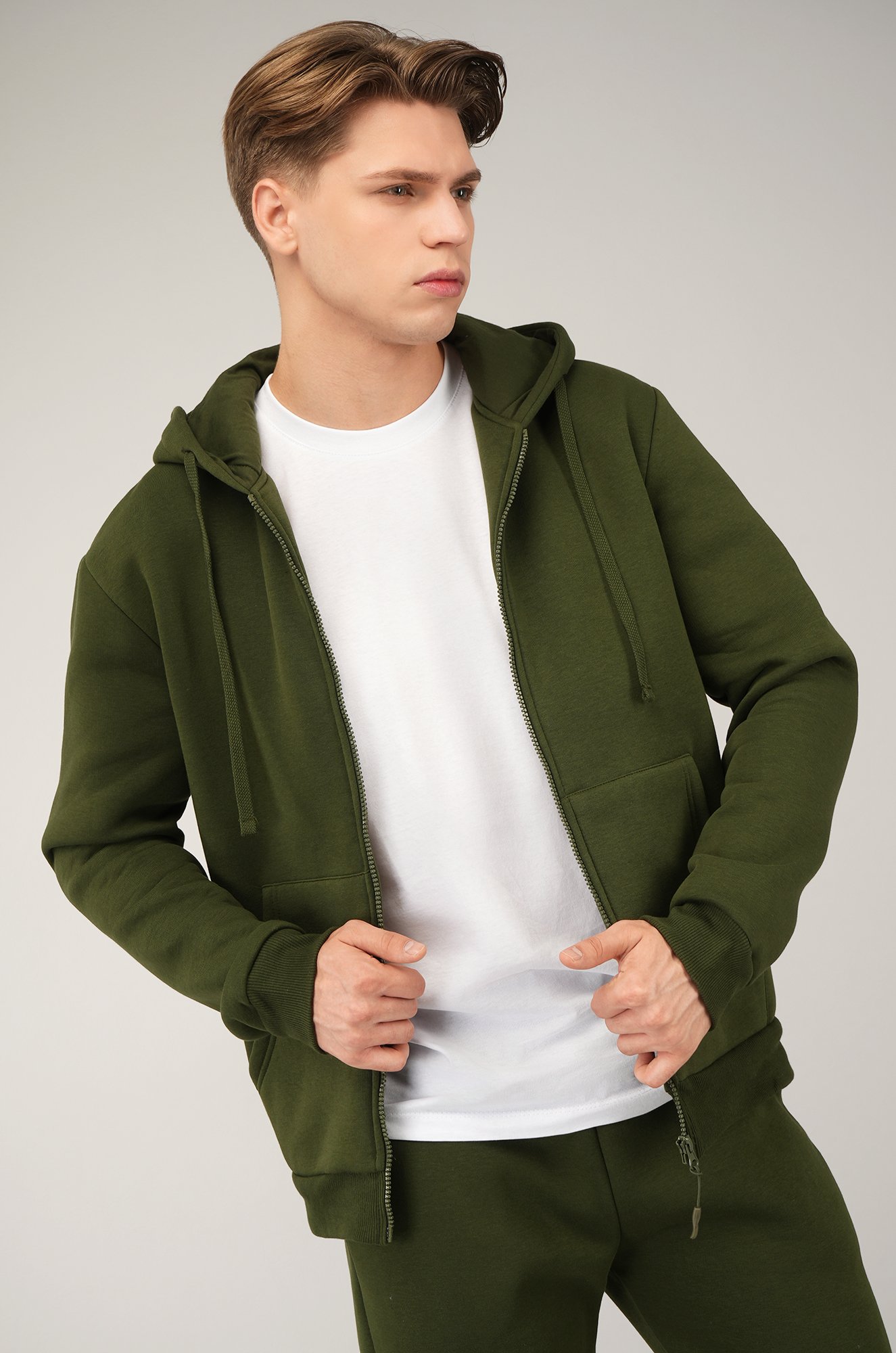 Теплый мужской костюм цвета хаки от бренда Happyfox выполнен из трикотажа футер с начесом. В комплект входят толстовка с капюшоном и брюки-джоггеры, созданные для максимального комфорта и свободы движений.