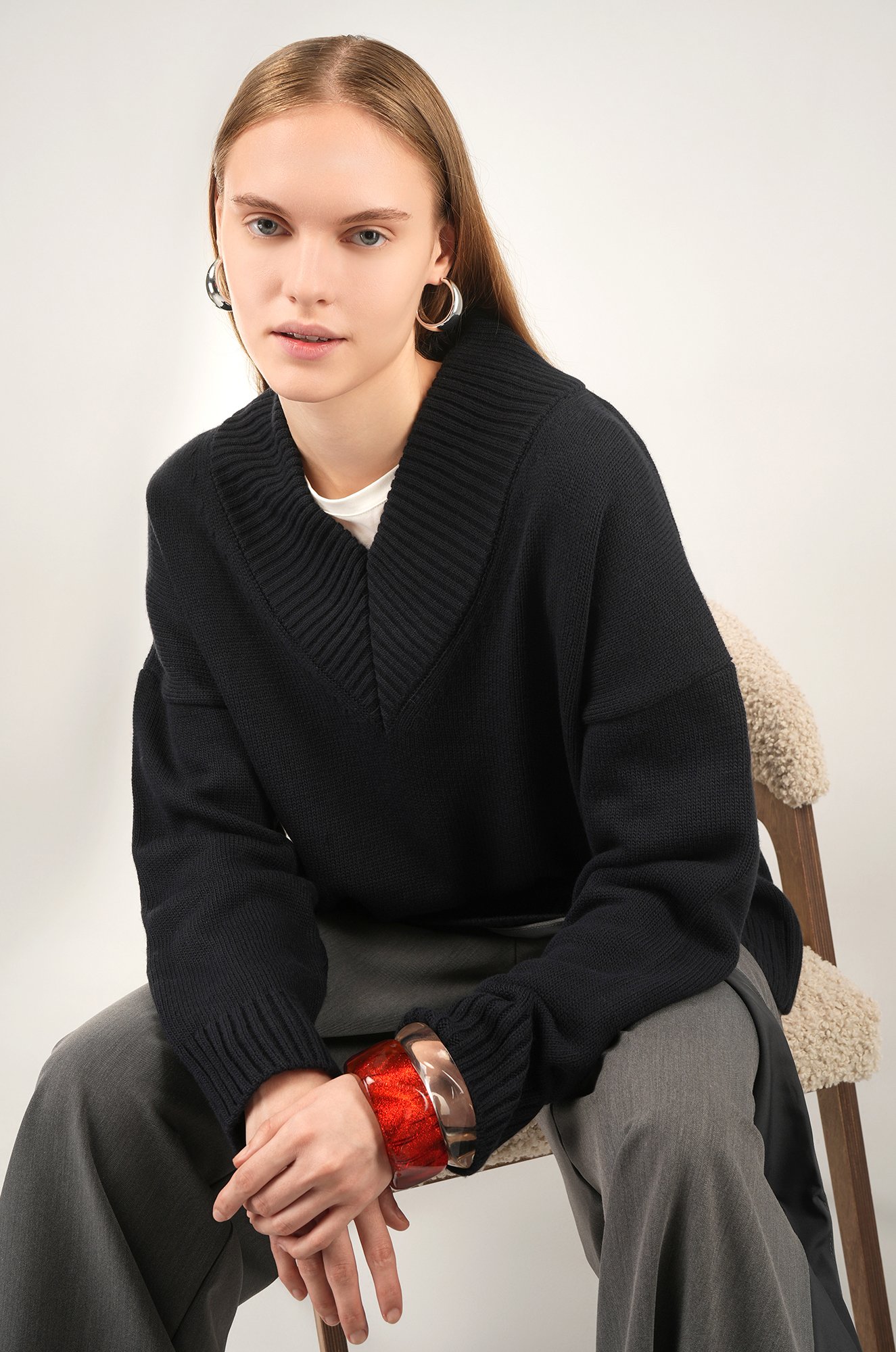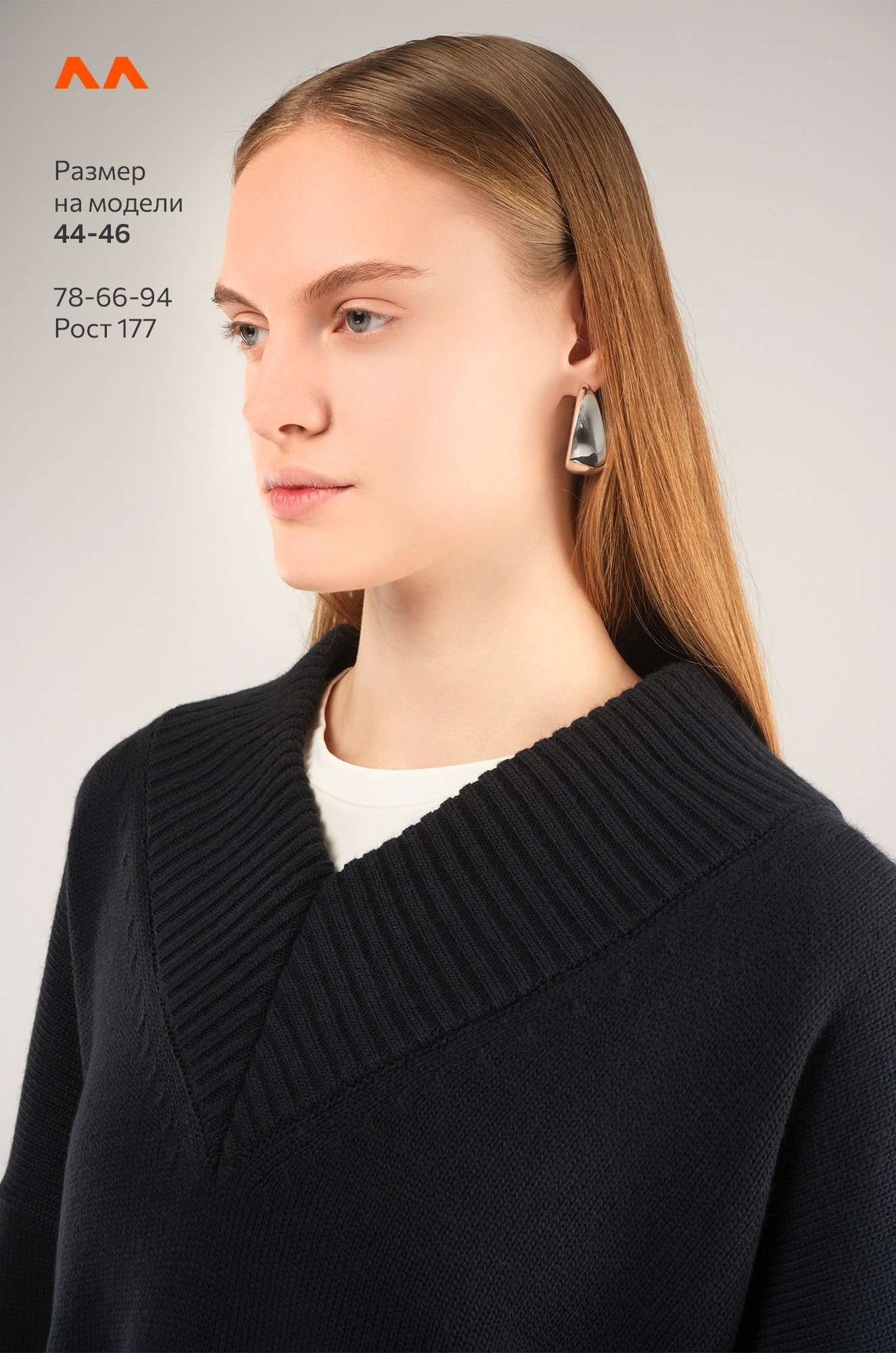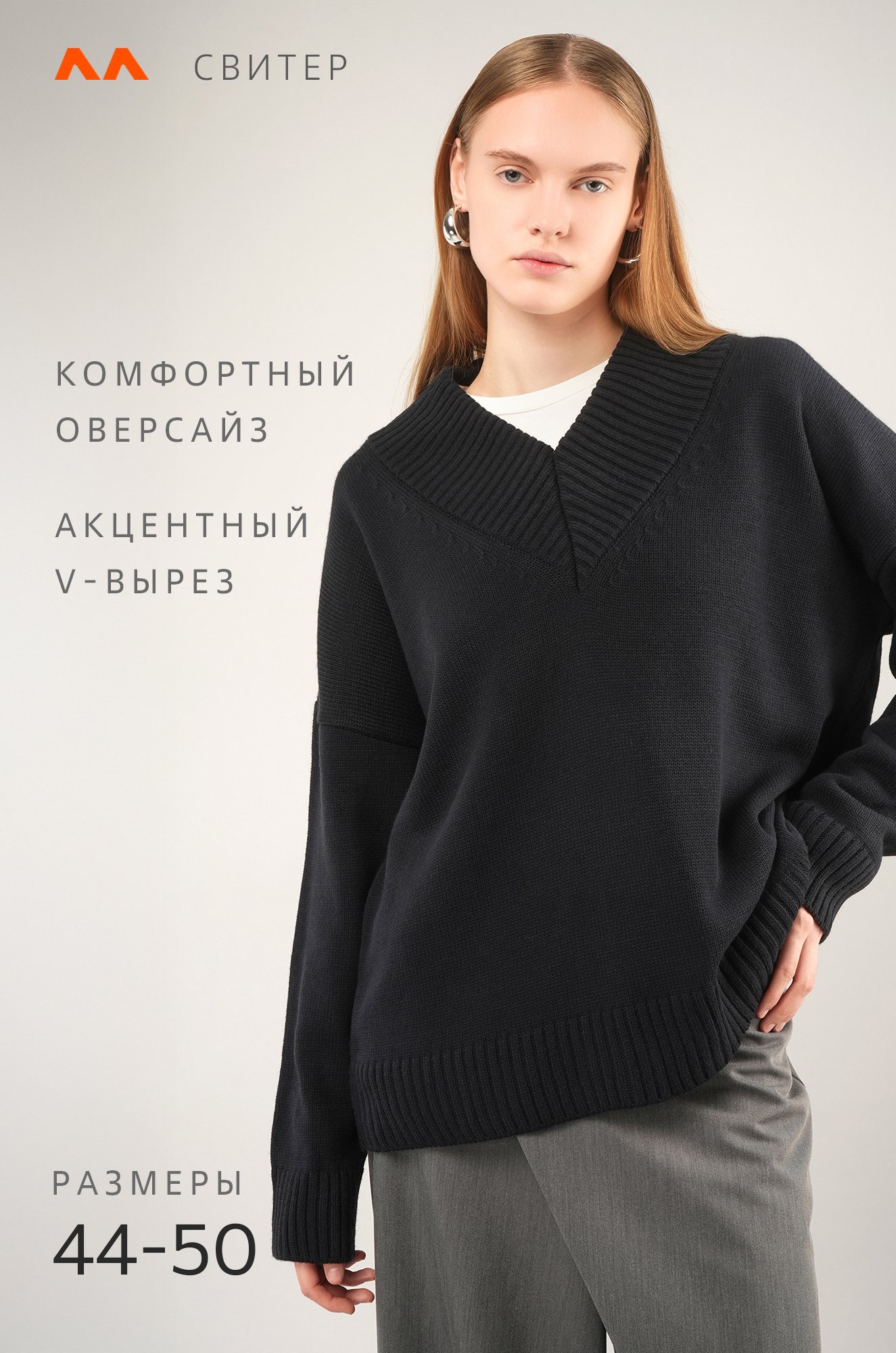 Женский вязаный свитер с V-образным вырезом – универсальный вариант для прохладной осени и зимы. Благодаря спущенной линии плеч создаётся расслабленный силуэт.