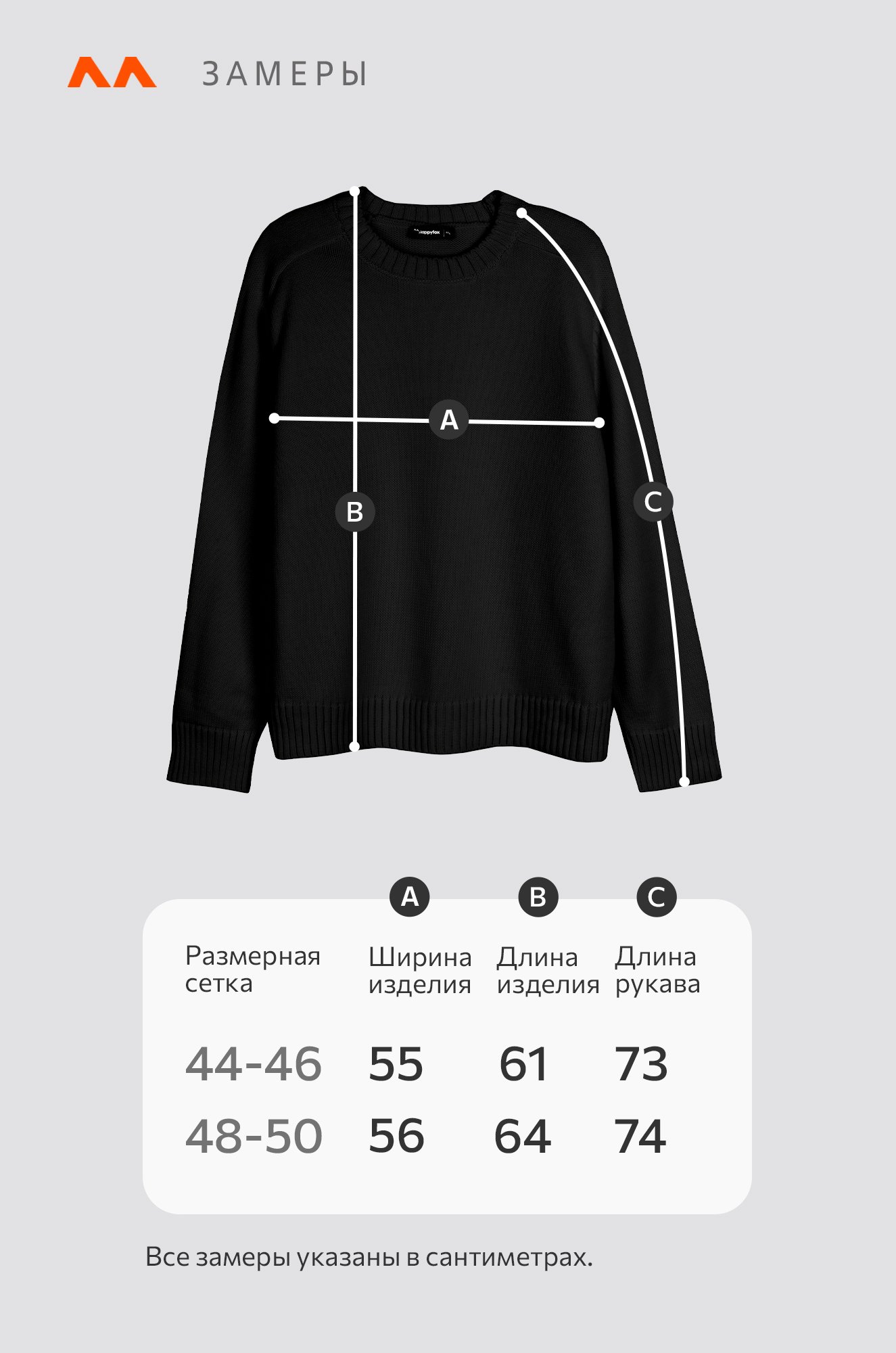 Размер 48-50: длина:64 см; ширина:56 см; длина рукава внешняя:74 см; длина рукава внутренняя:45 см.