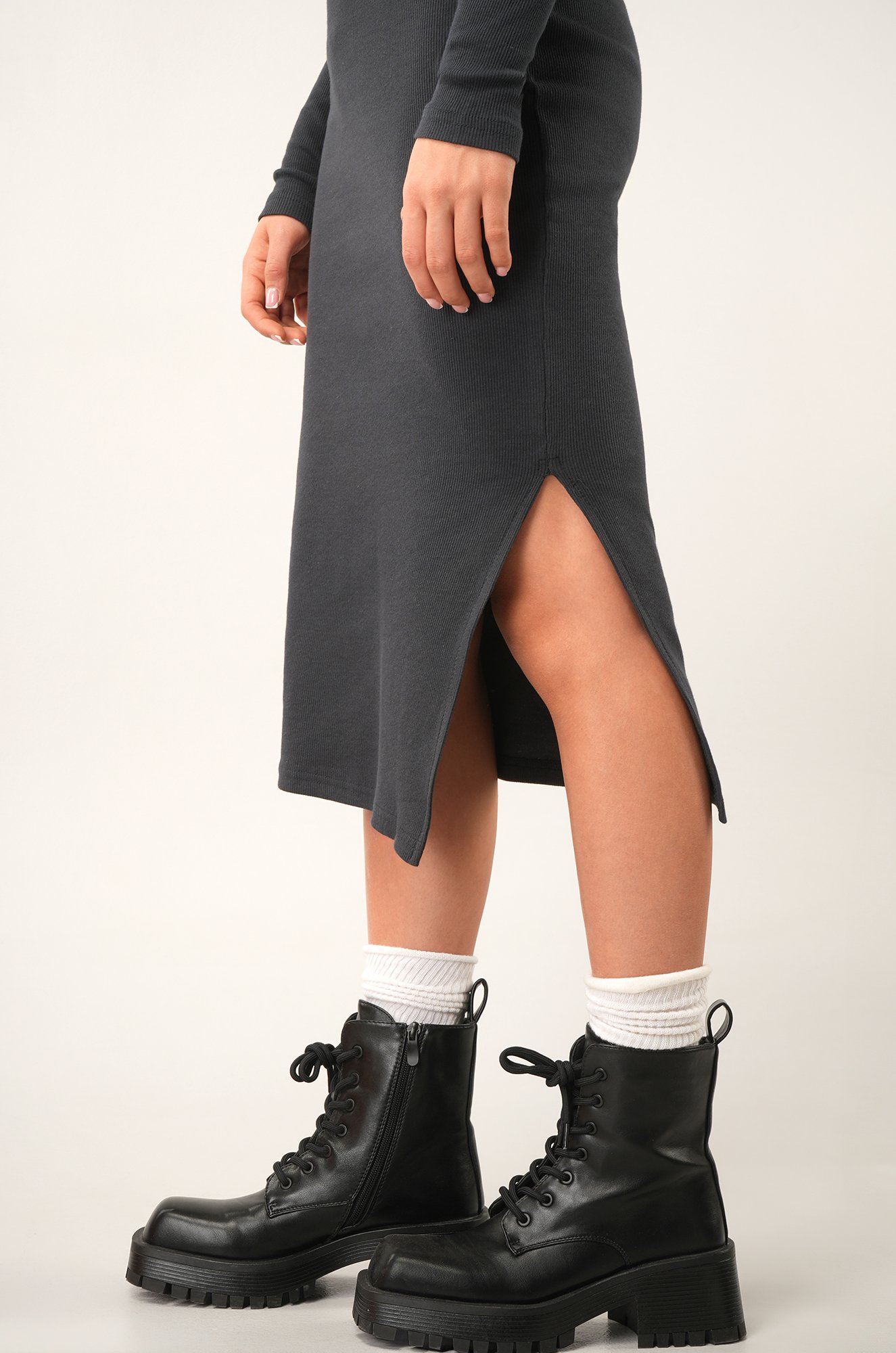 — однотонное черное платье в рубчик выполнено из трикотажа кашкорсе с добавлением эластана для идеальной посадки по фигуре;