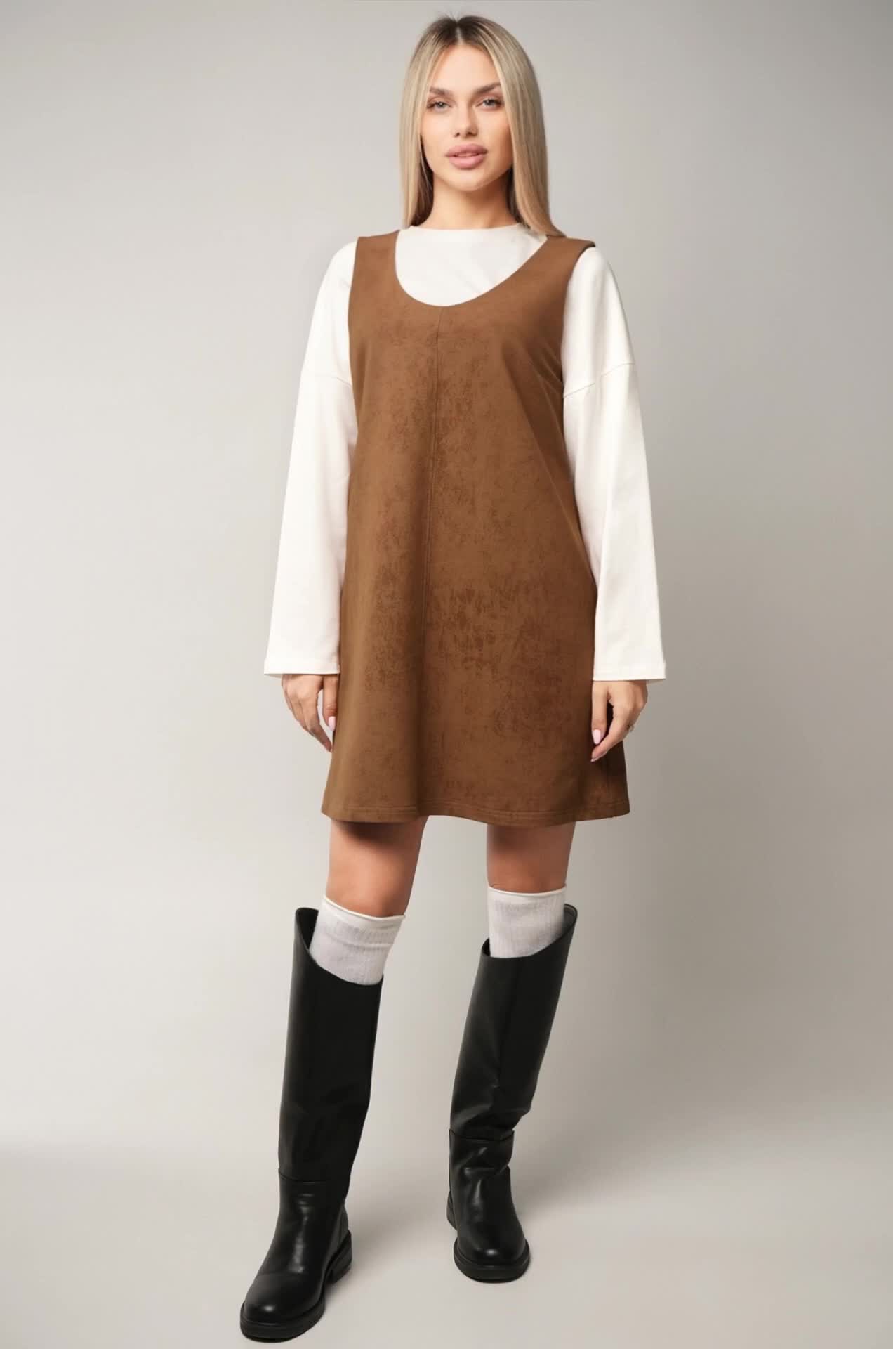 Свободный силуэт, глубокий круглый вырез делают трикотажный сарафан мини воплощением современного минимализма. Демисезонный сарафан варенка для женщин подойдет для осенних и весенних образов.