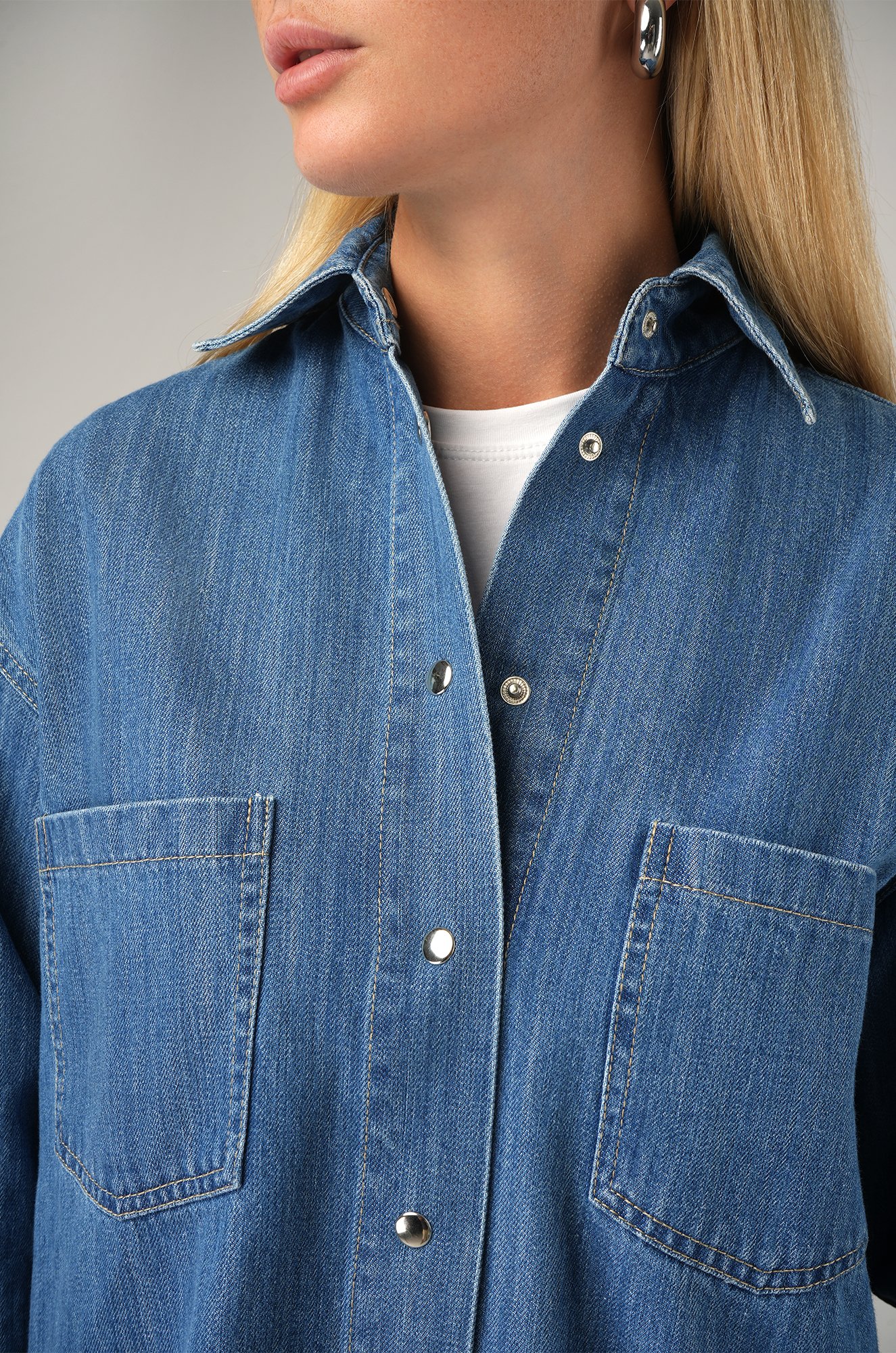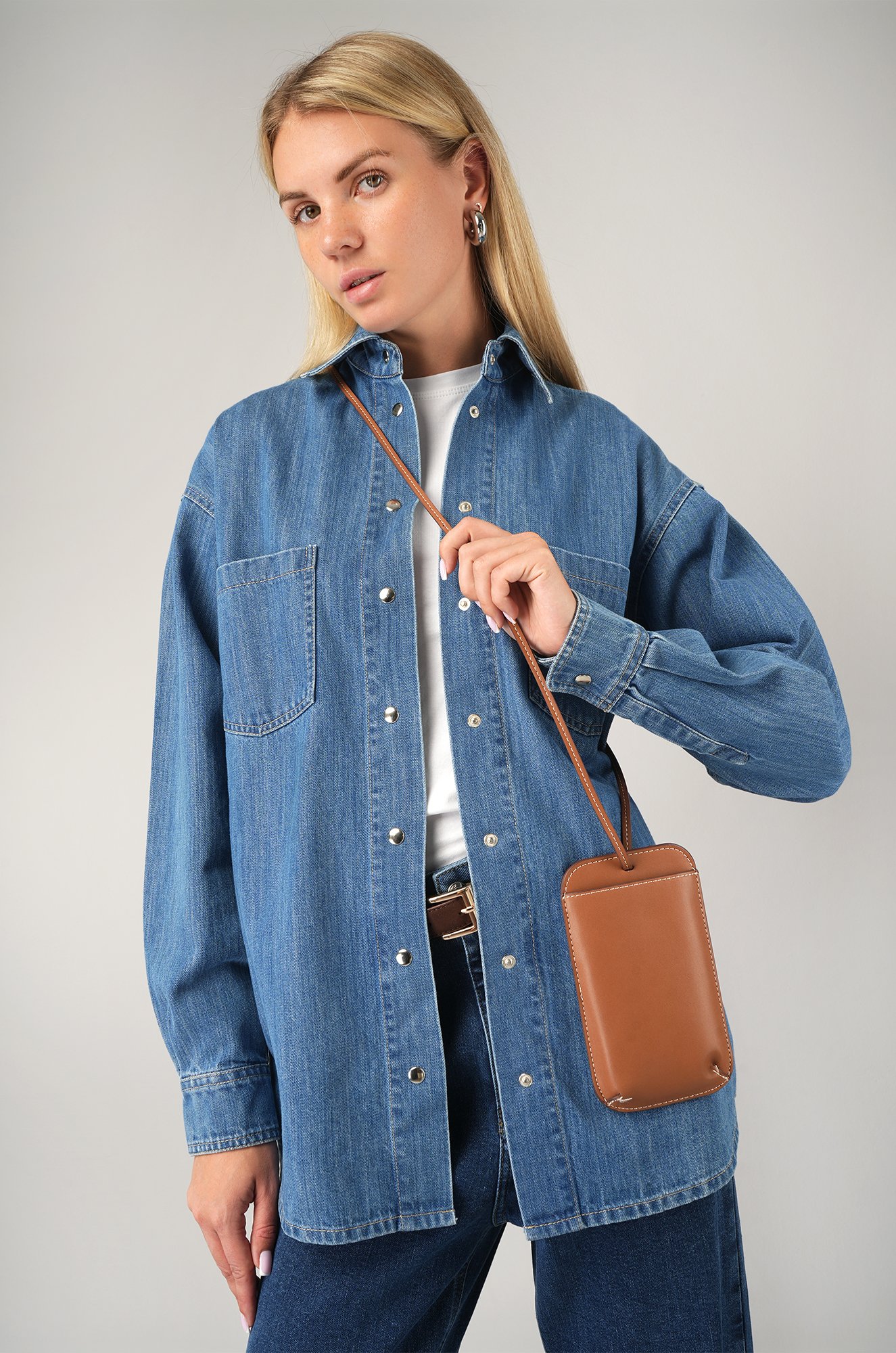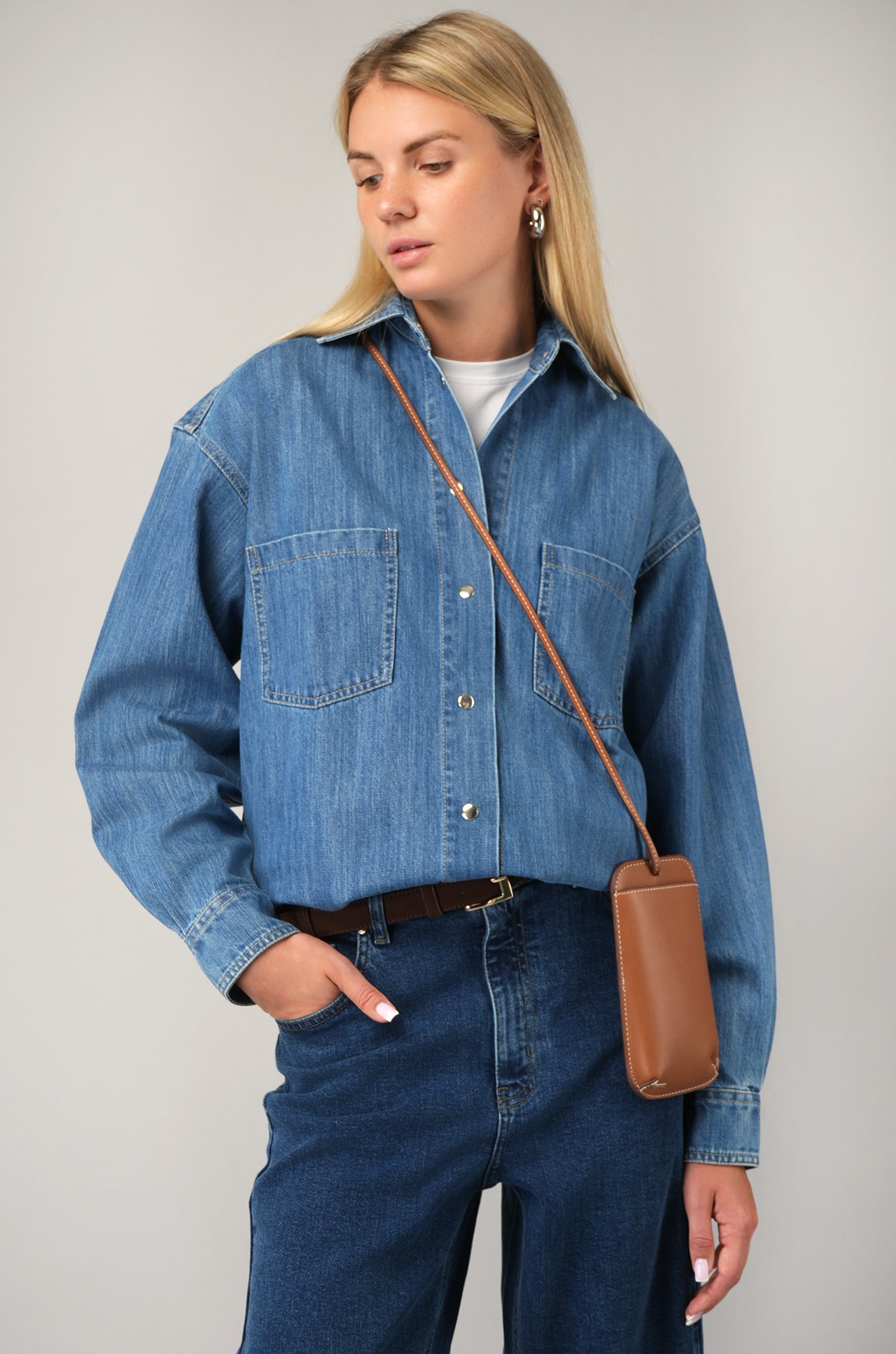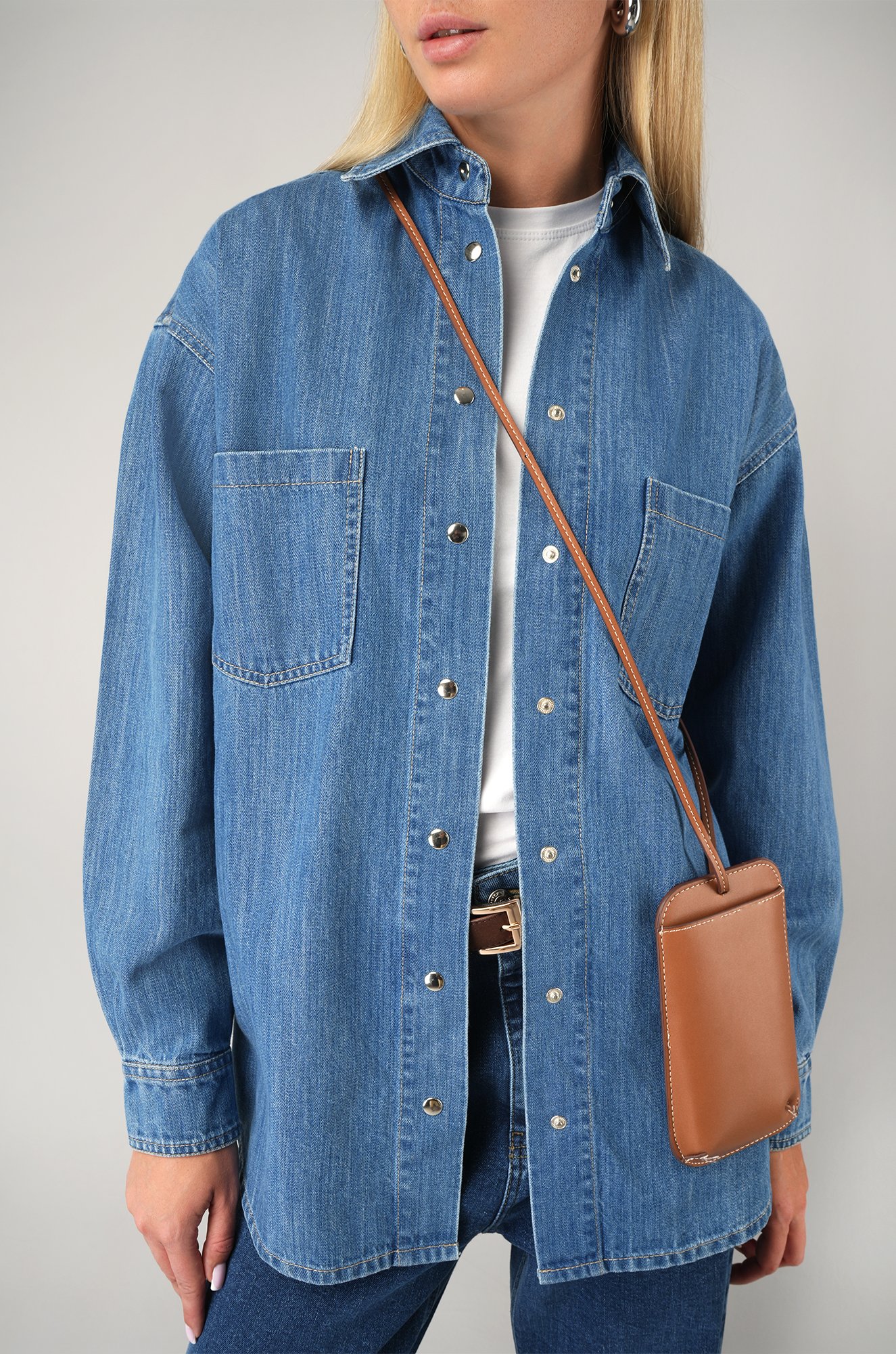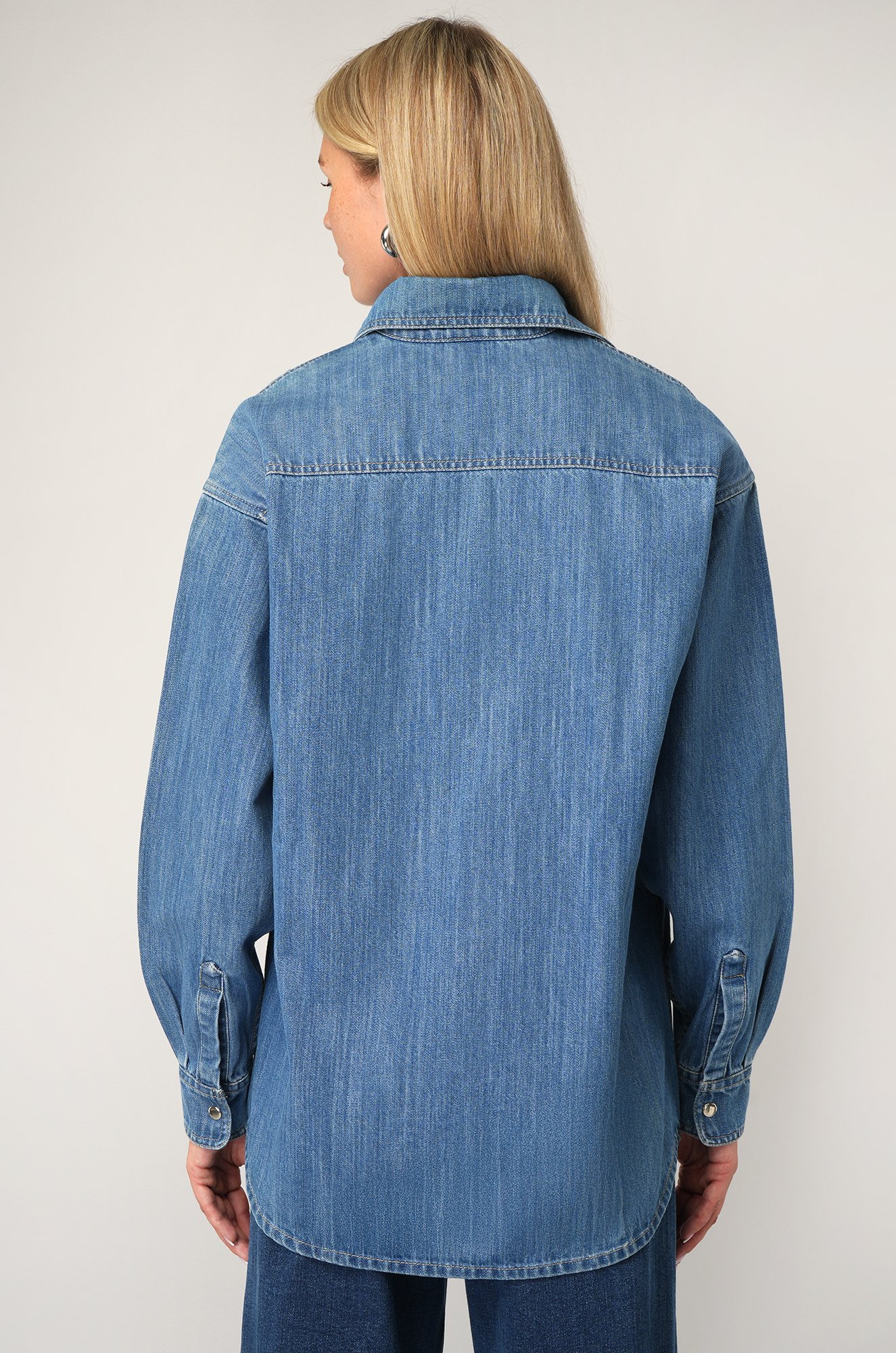 Женская джинсовая рубашка оверсайз — идеальный выбор для стильной осенней капсулы. Синяя рубашка выполнена из плотного хлопкового денима, который дарит комфорт и долговечность.