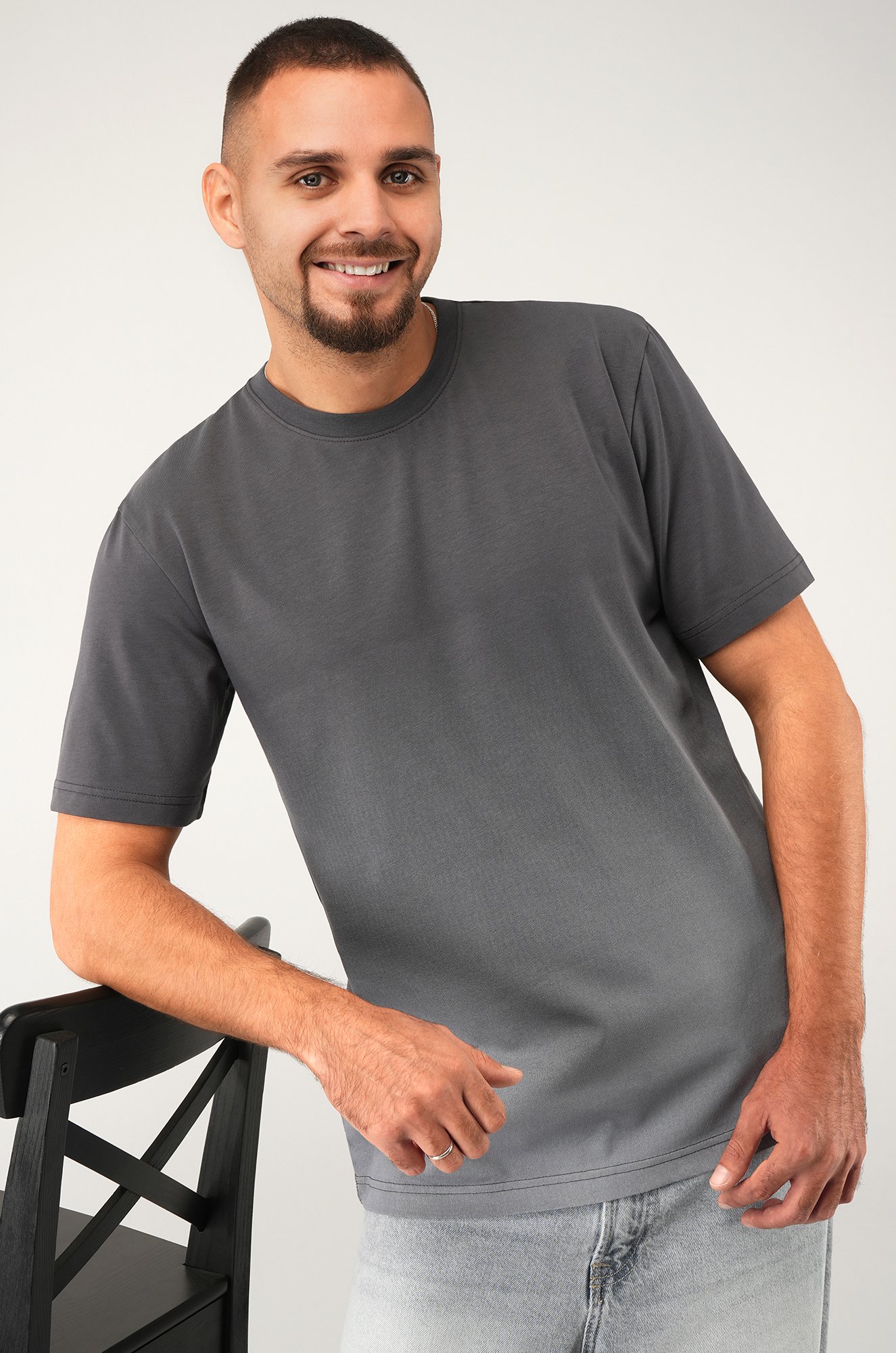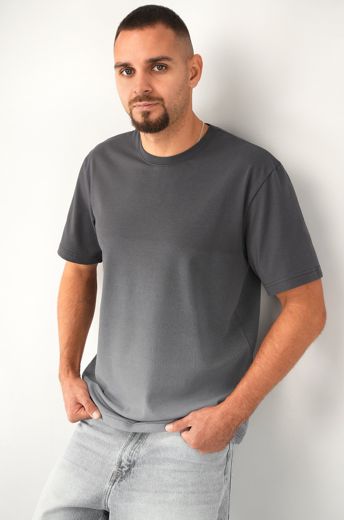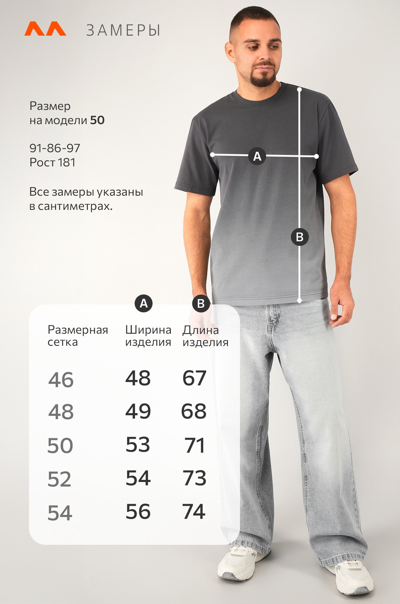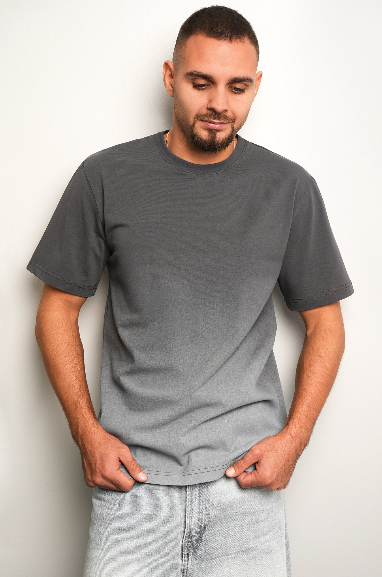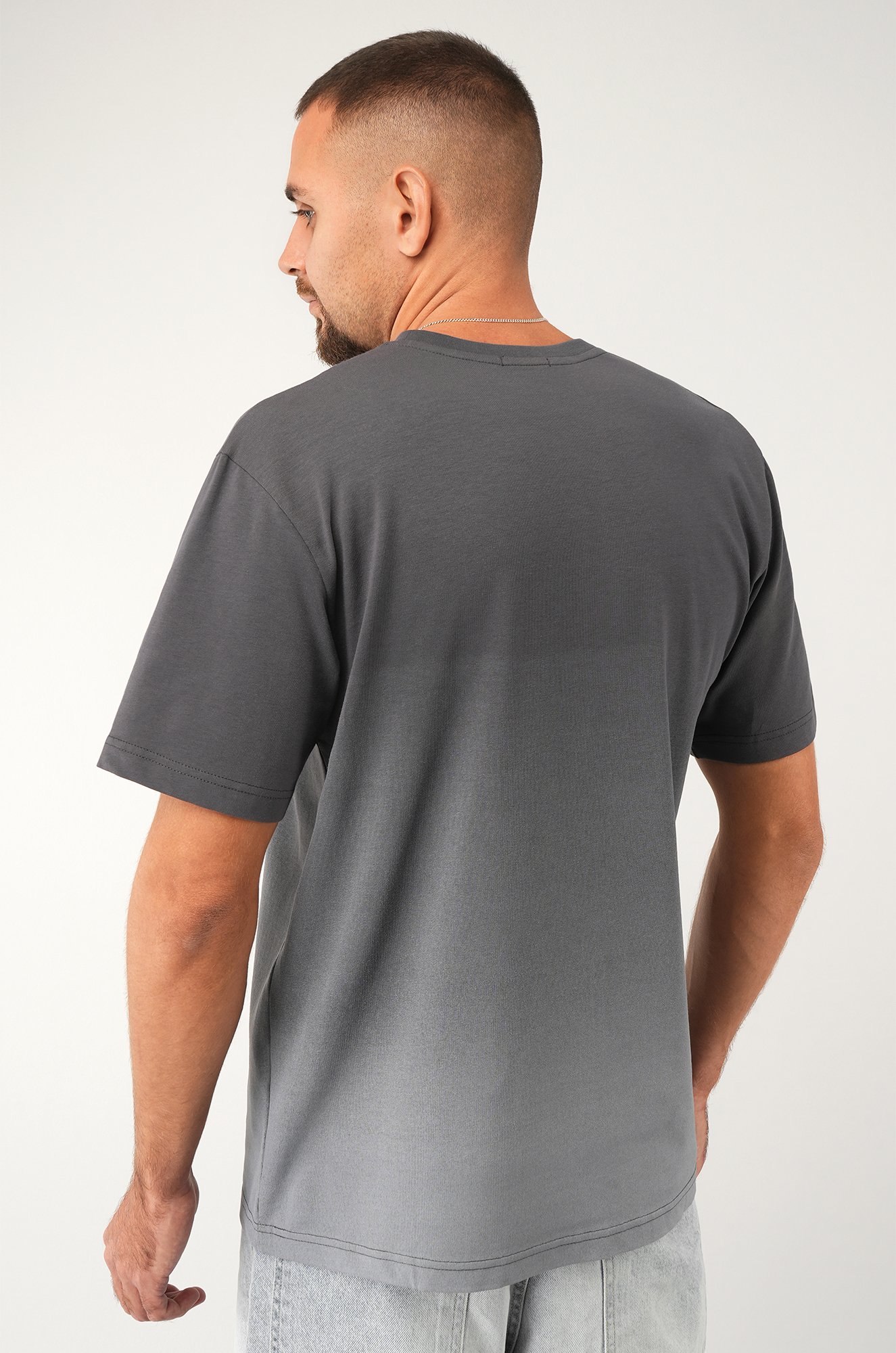 Мужская футболка с градиентным принтом выполнена из хлопка с добавлением лайкры. Футболка с эффектом омбре идеальна для создания стильных и расслабленных образов. Плавный переход от графитового к светло-серому добавляет динамики.