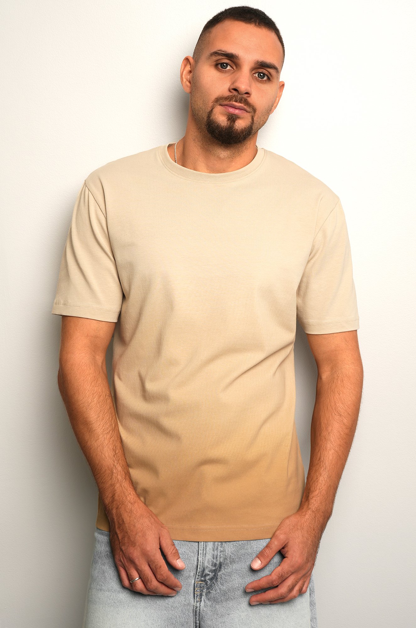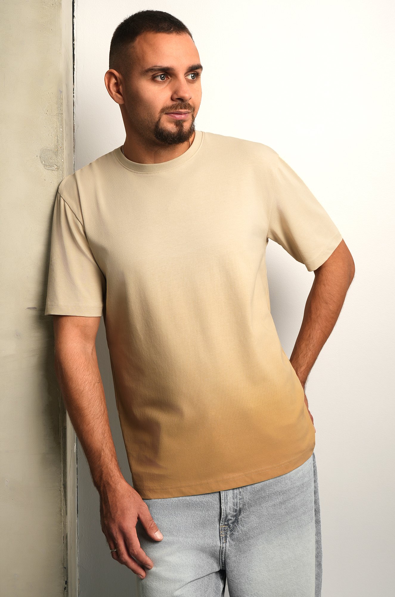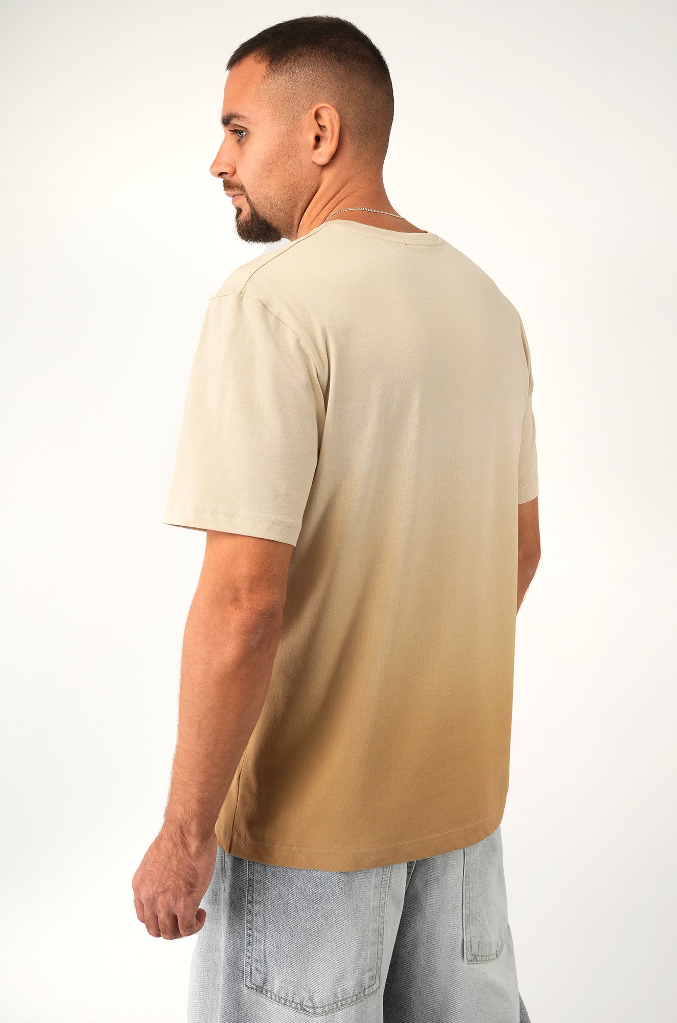 Мужская футболка с градиентным принтом выполнена из хлопка с добавлением лайкры. Футболка с эффектом омбре идеальна для создания стильных и расслабленных образов. Плавный переход от светлого песочного к тёмному добавляет динамики.