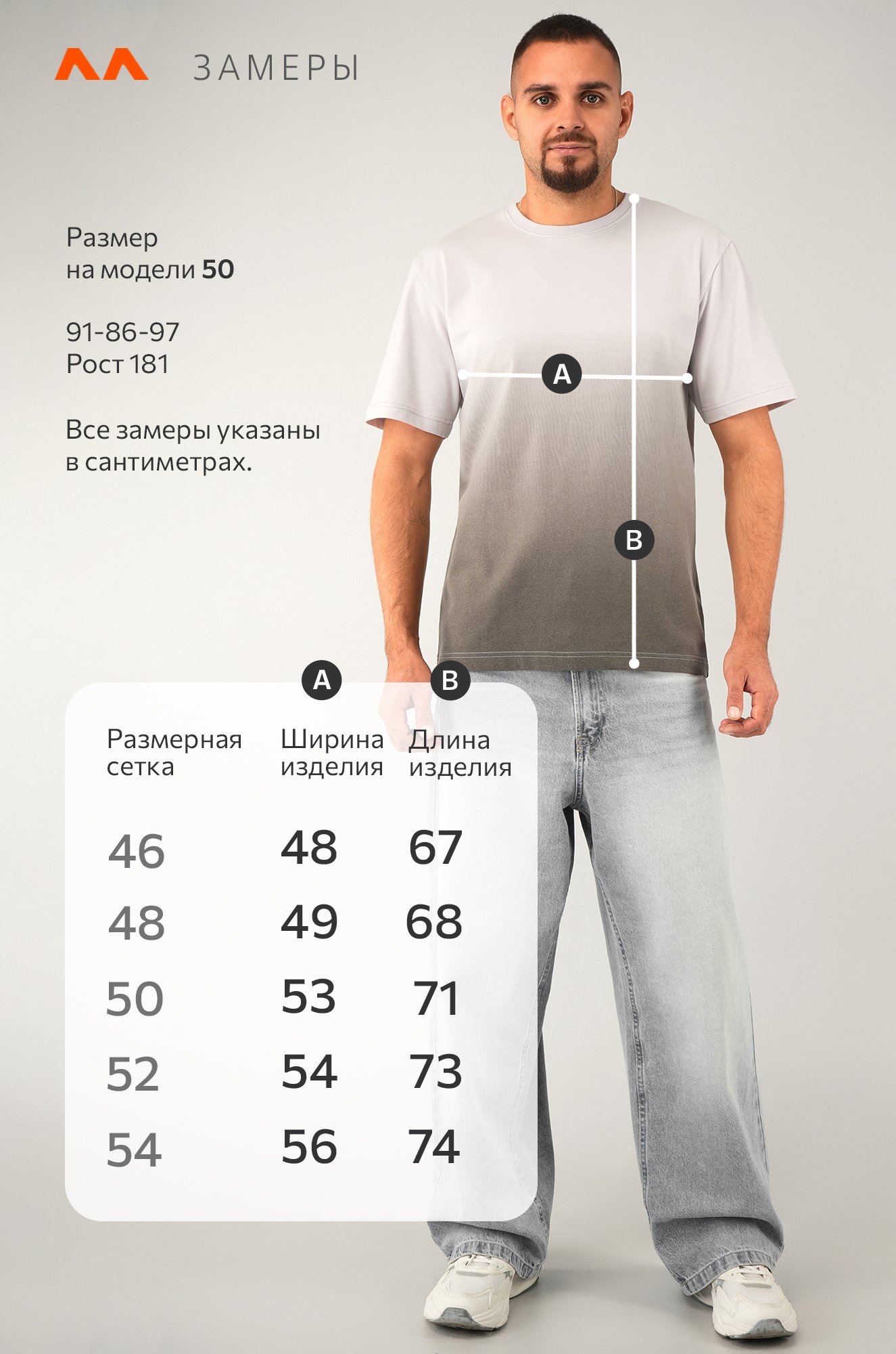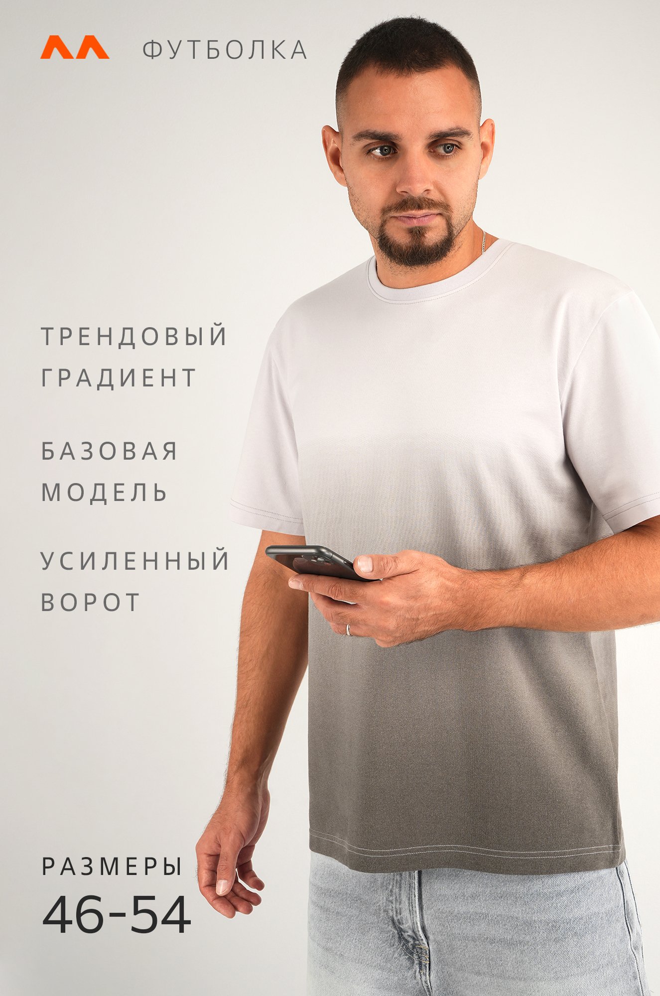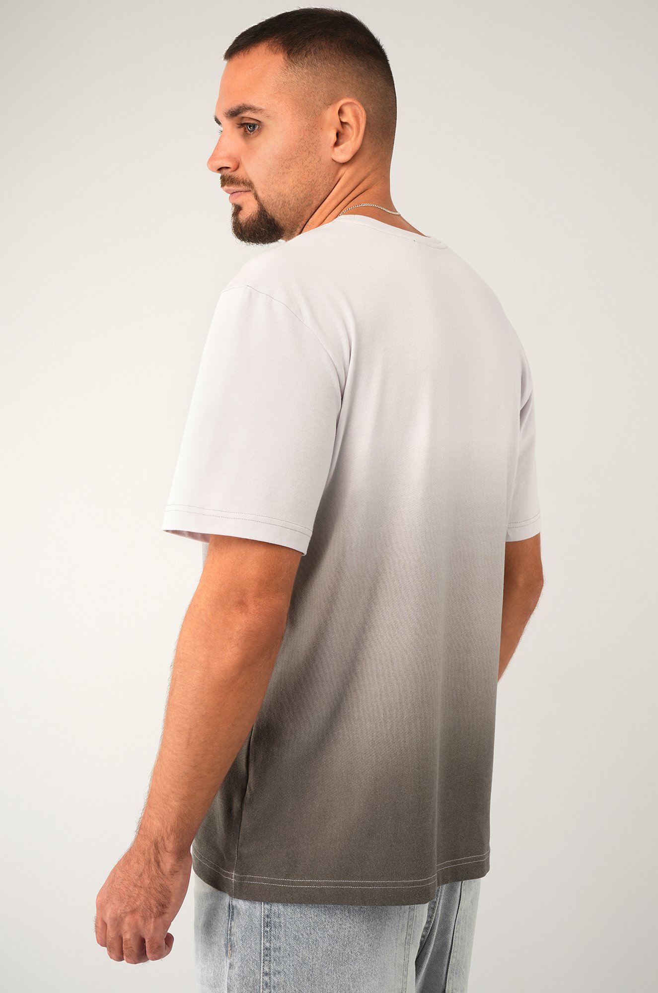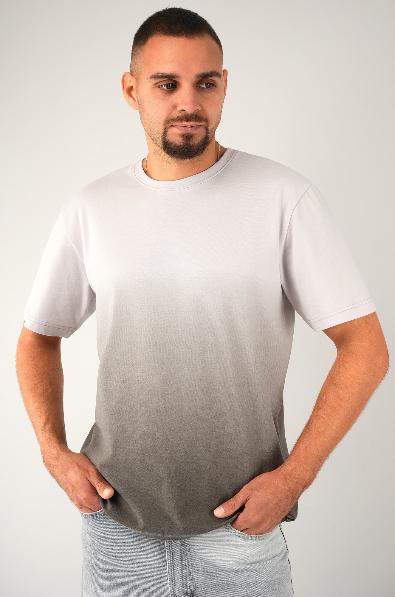 Мужская футболка с градиентным принтом выполнена из хлопка с добавлением лайкры. Футболка с эффектом омбре идеальна для создания стильных и расслабленных образов. Плавный переход от светло-серого до тёмного добавляет динамики.