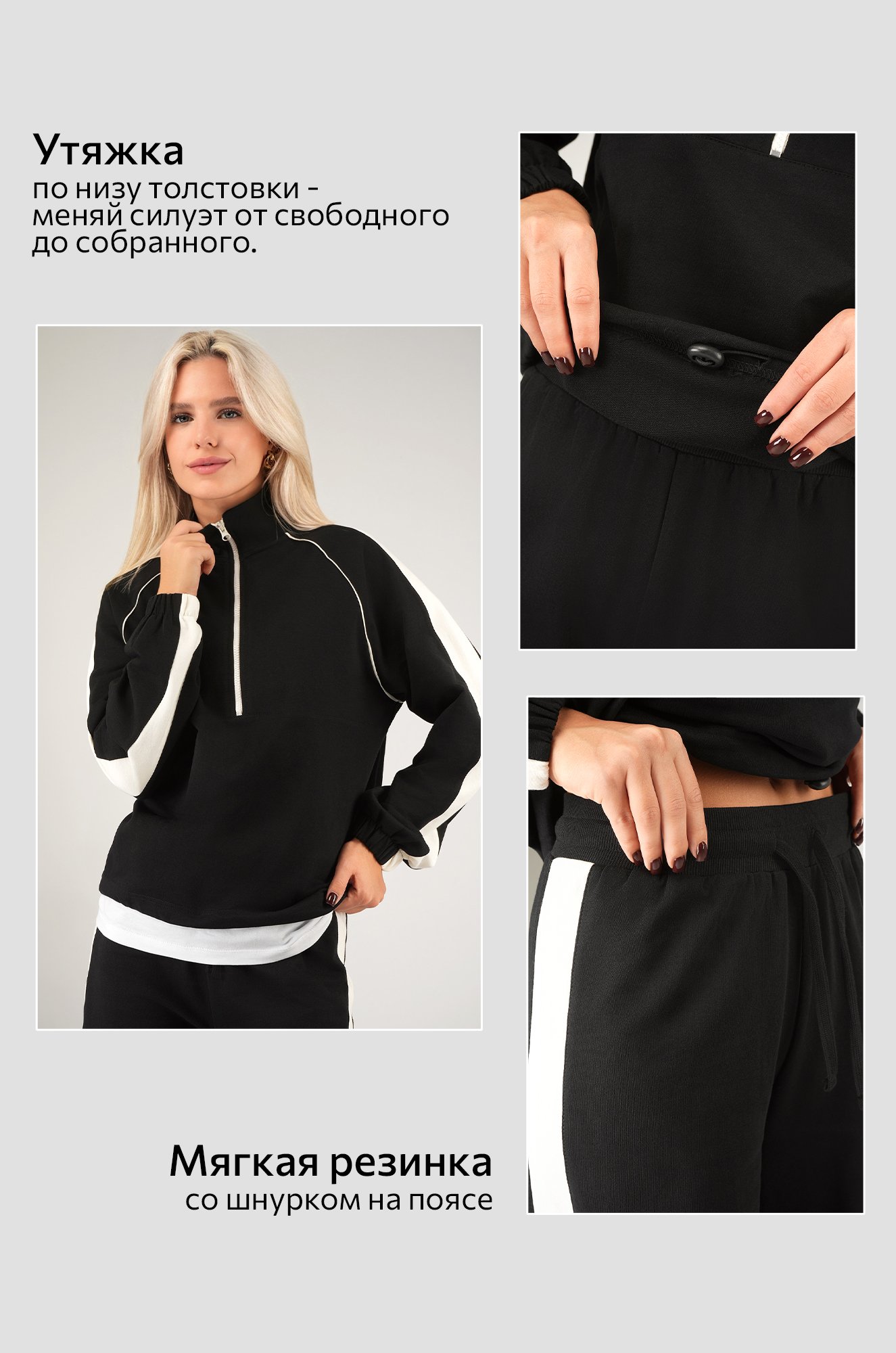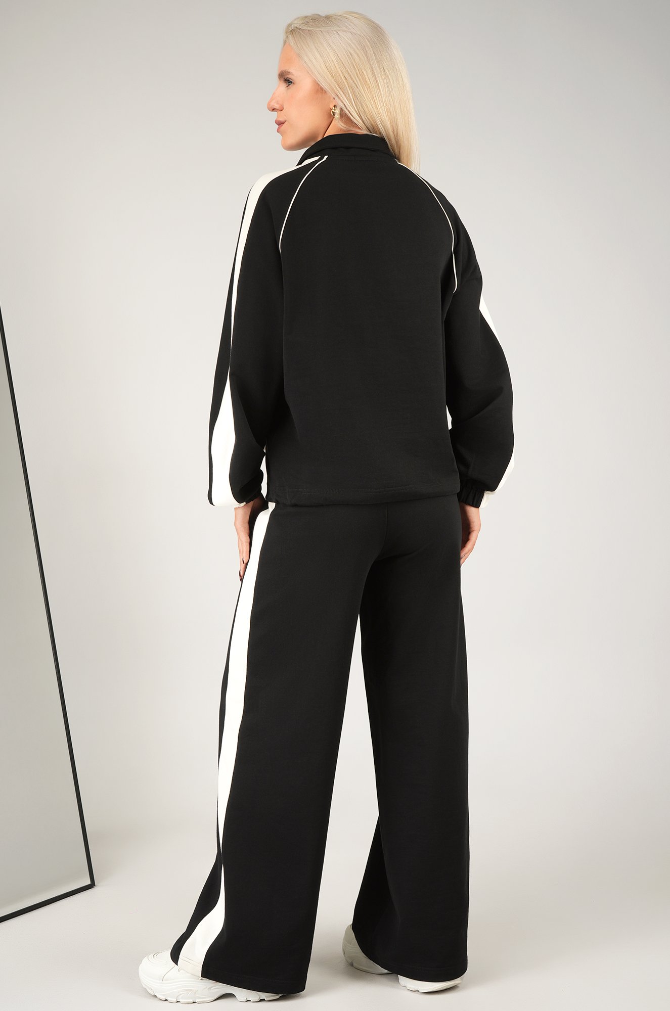 Черный женский костюм с контрастной отделкой выглядит стильно и элегантно. Свободная мастерка с молнией и воротником-стойкой регулируется по объему кулиской. Широкие брюки палаццо с поясом на резинке со шнурком.