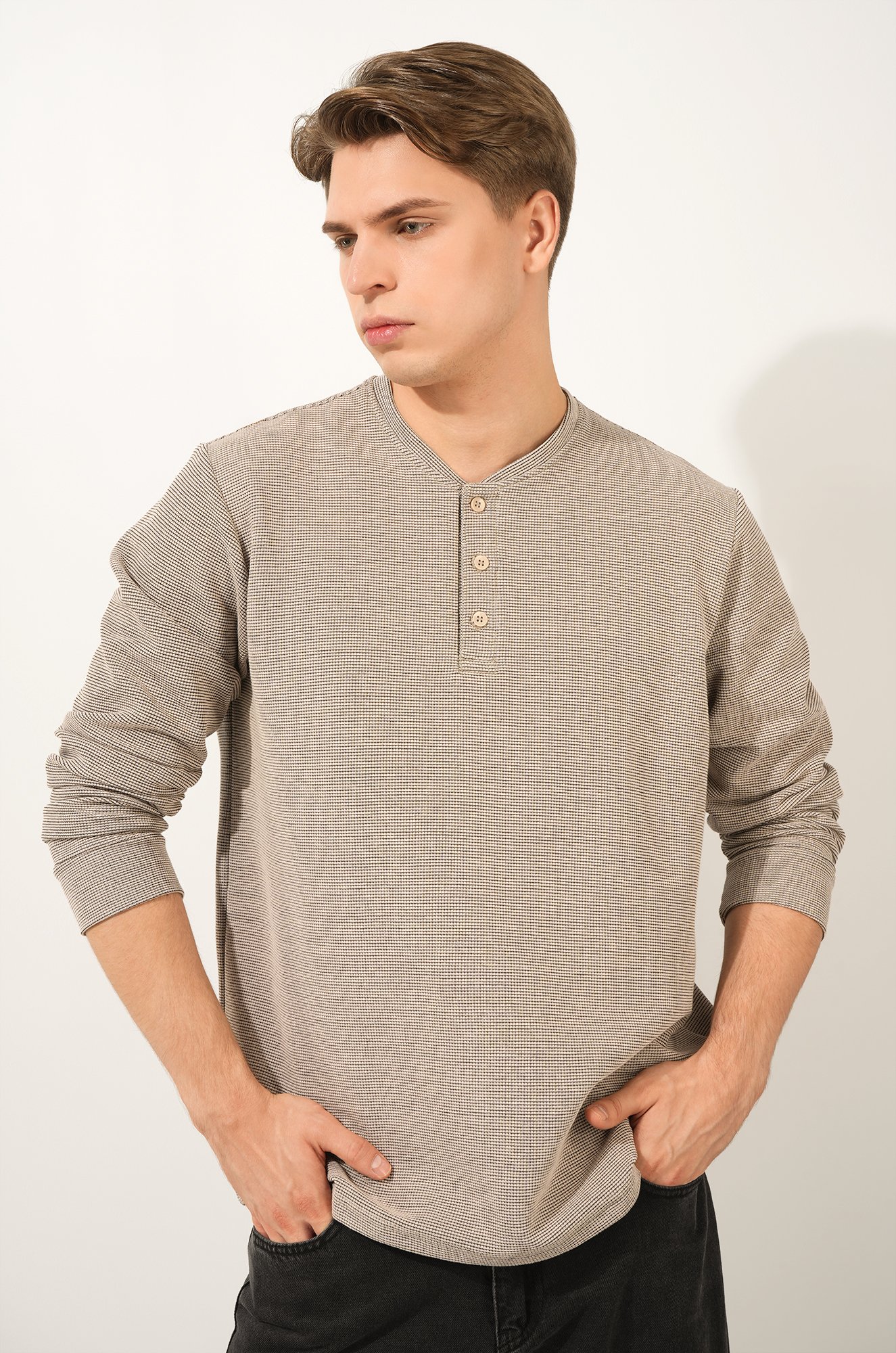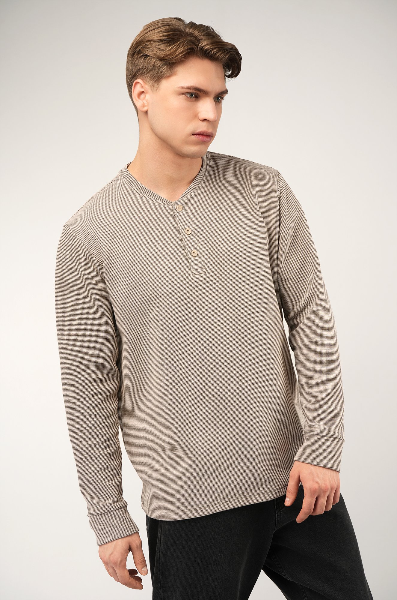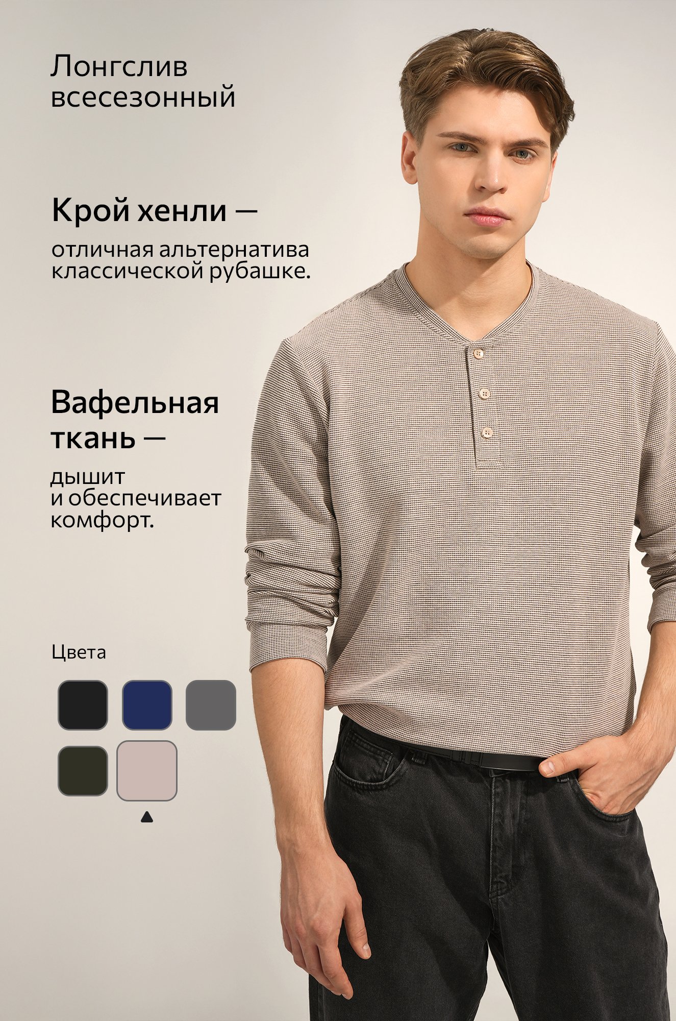 Трикотажный мужской лонгслив — твоя новая базовая классика! Стильная модель с оригинальным вырезом хенли легко заменит рубашку поло с длинным рукавом. Однотонный бежевый цвет и универсальный крой делают лонг идеальным для офиса и повседневных образов.