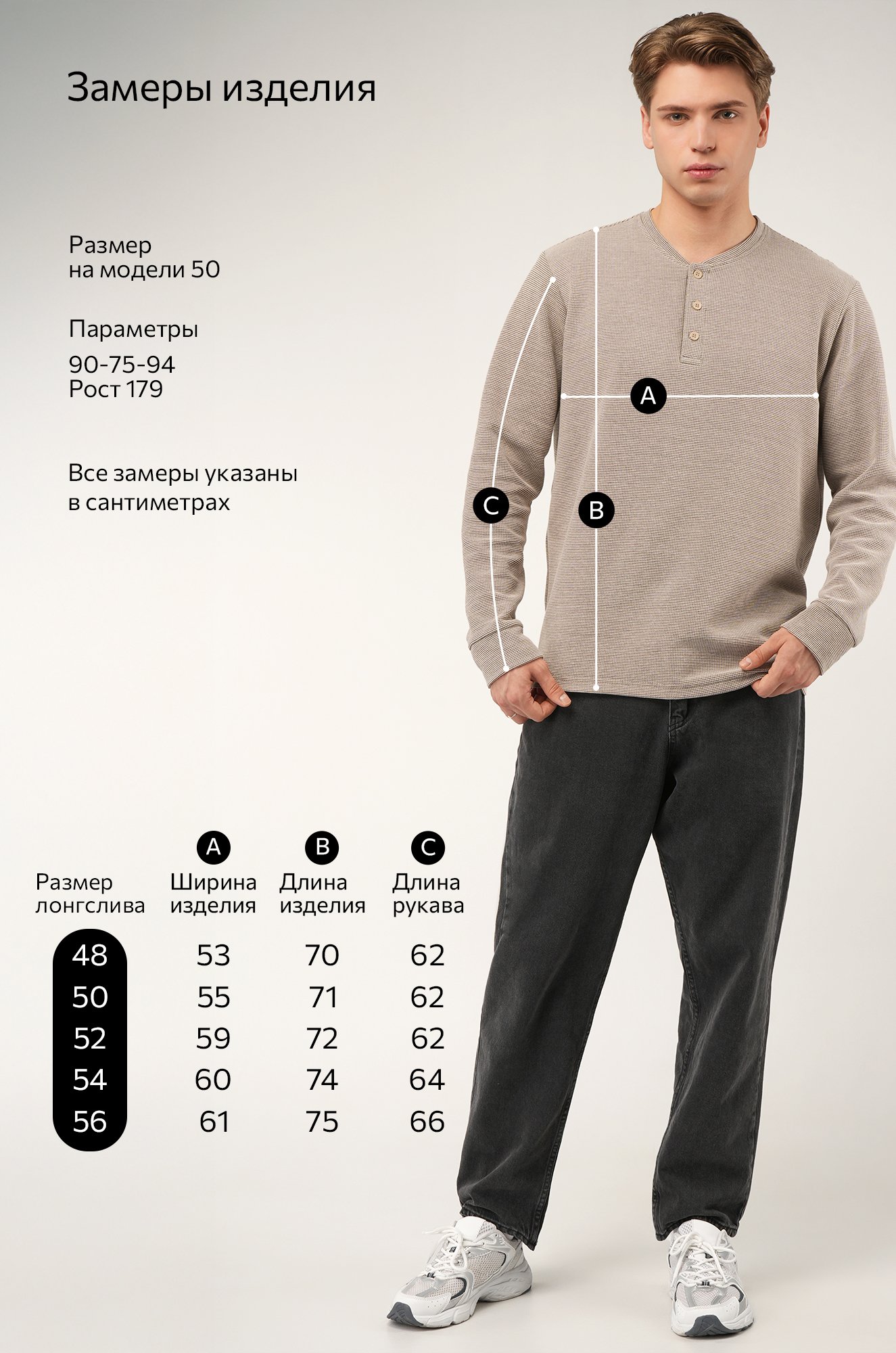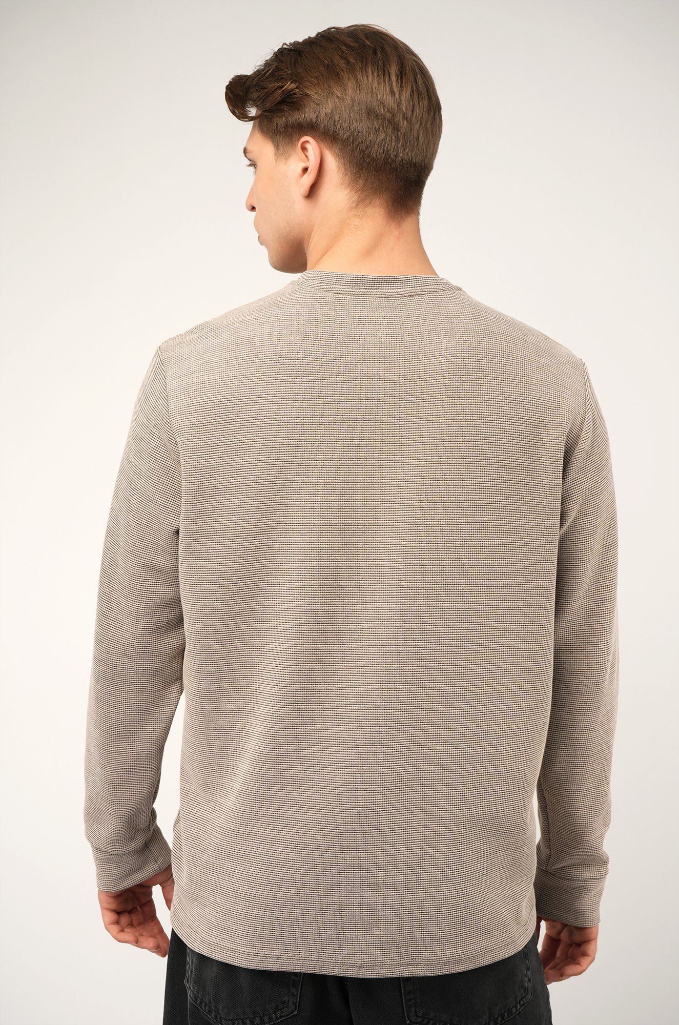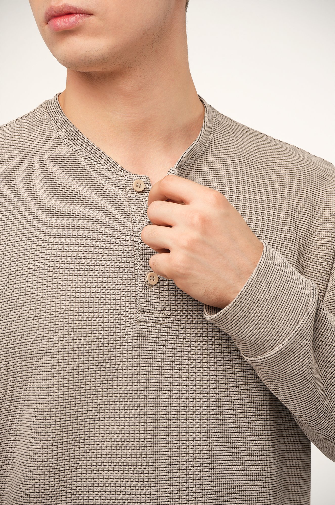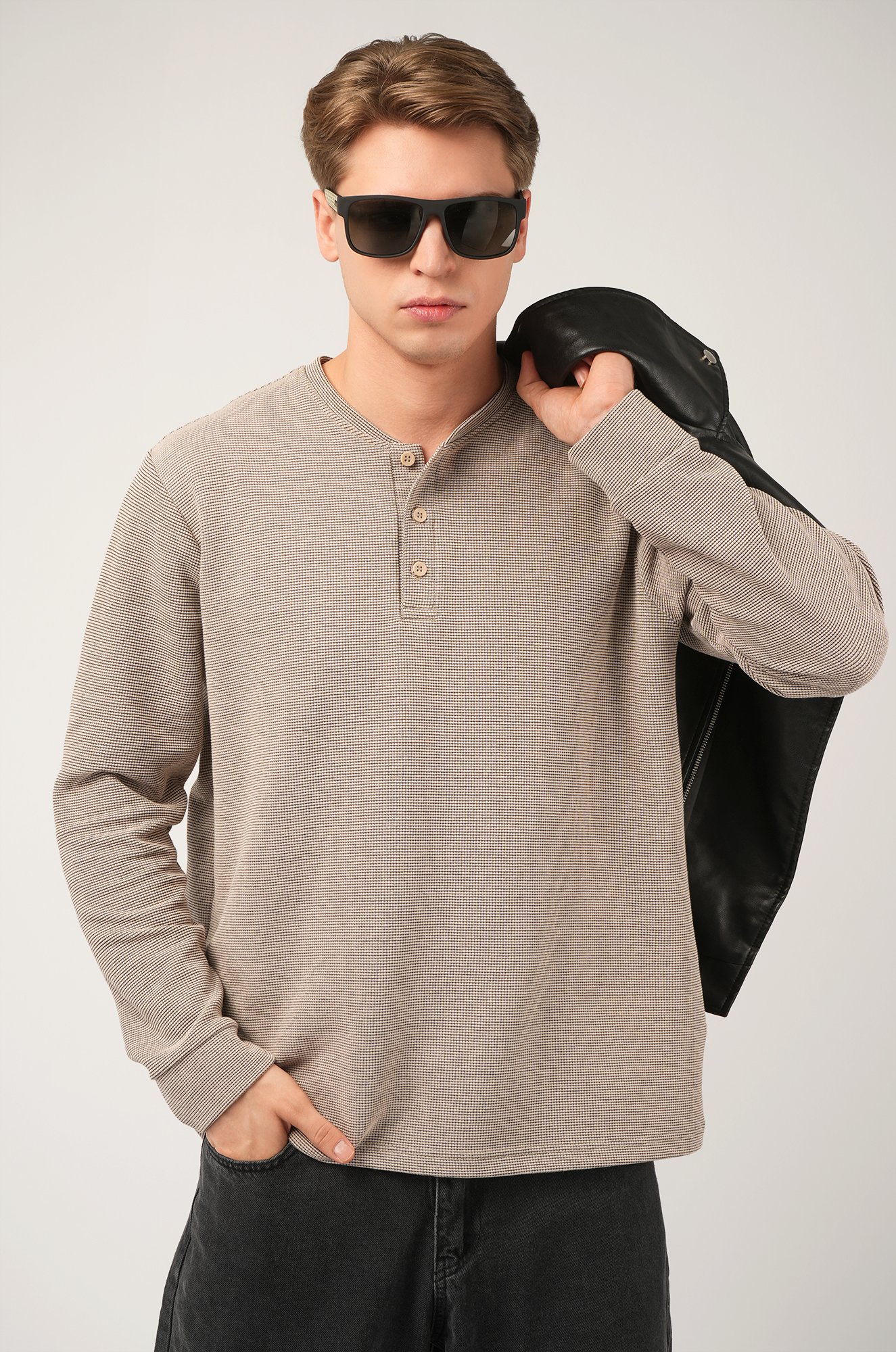 Трикотажный мужской лонгслив — твоя новая базовая классика! Стильная модель с оригинальным вырезом хенли легко заменит рубашку поло с длинным рукавом. Однотонный бежевый цвет и универсальный крой делают лонг идеальным для офиса и повседневных образов.