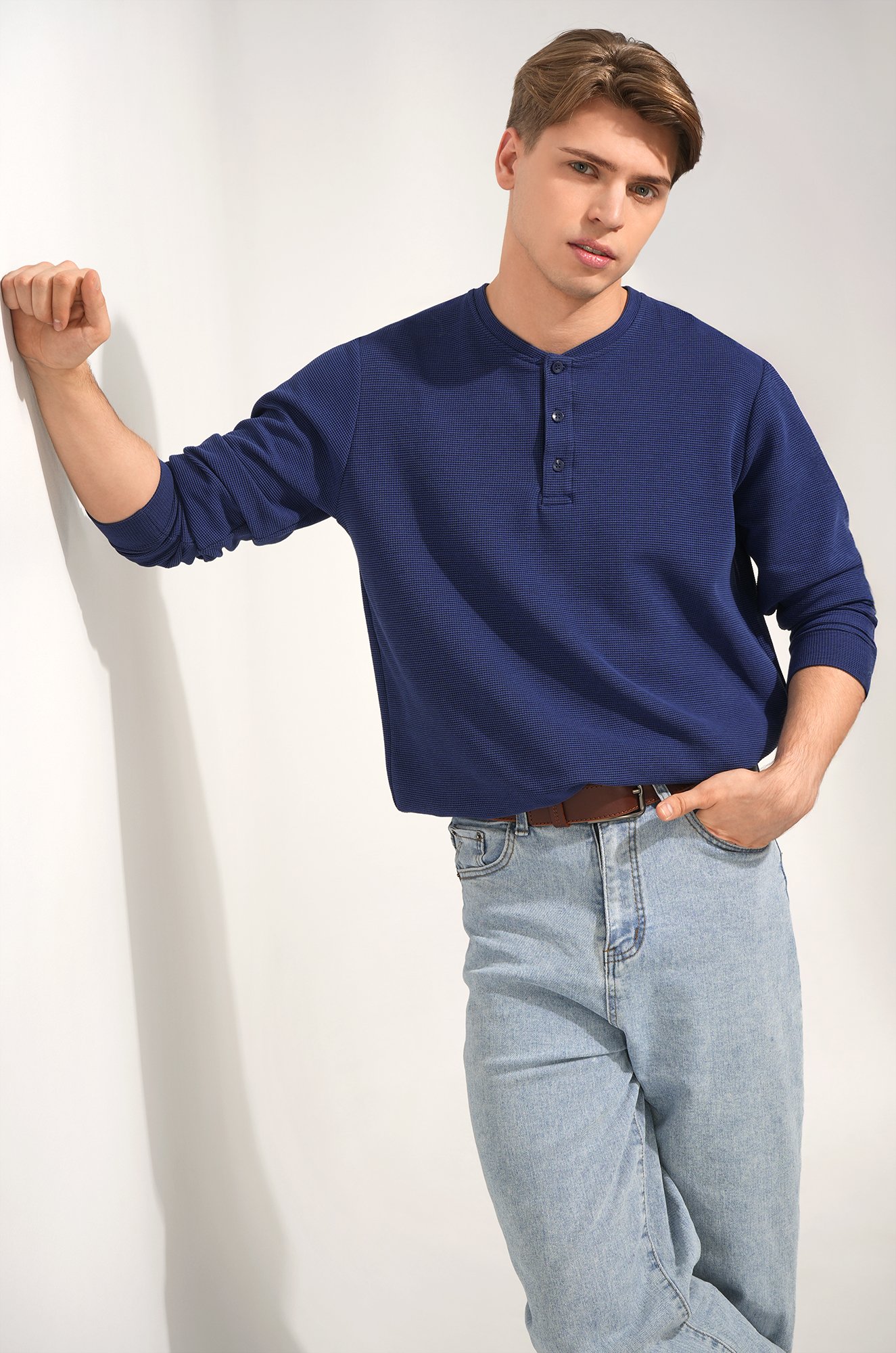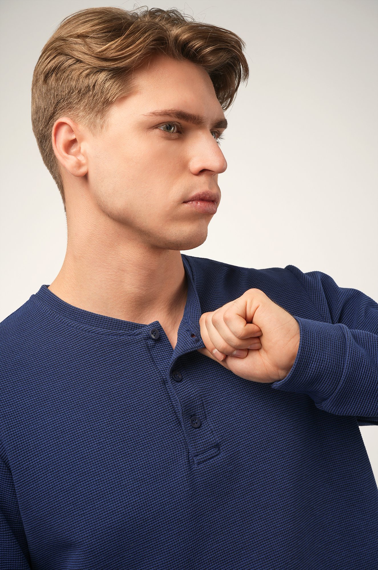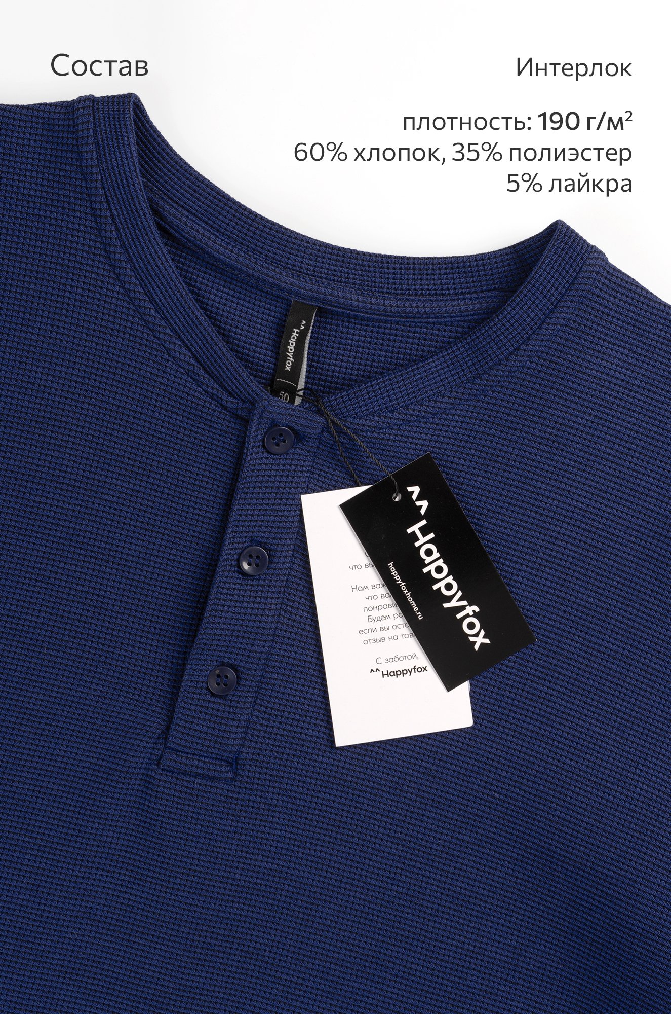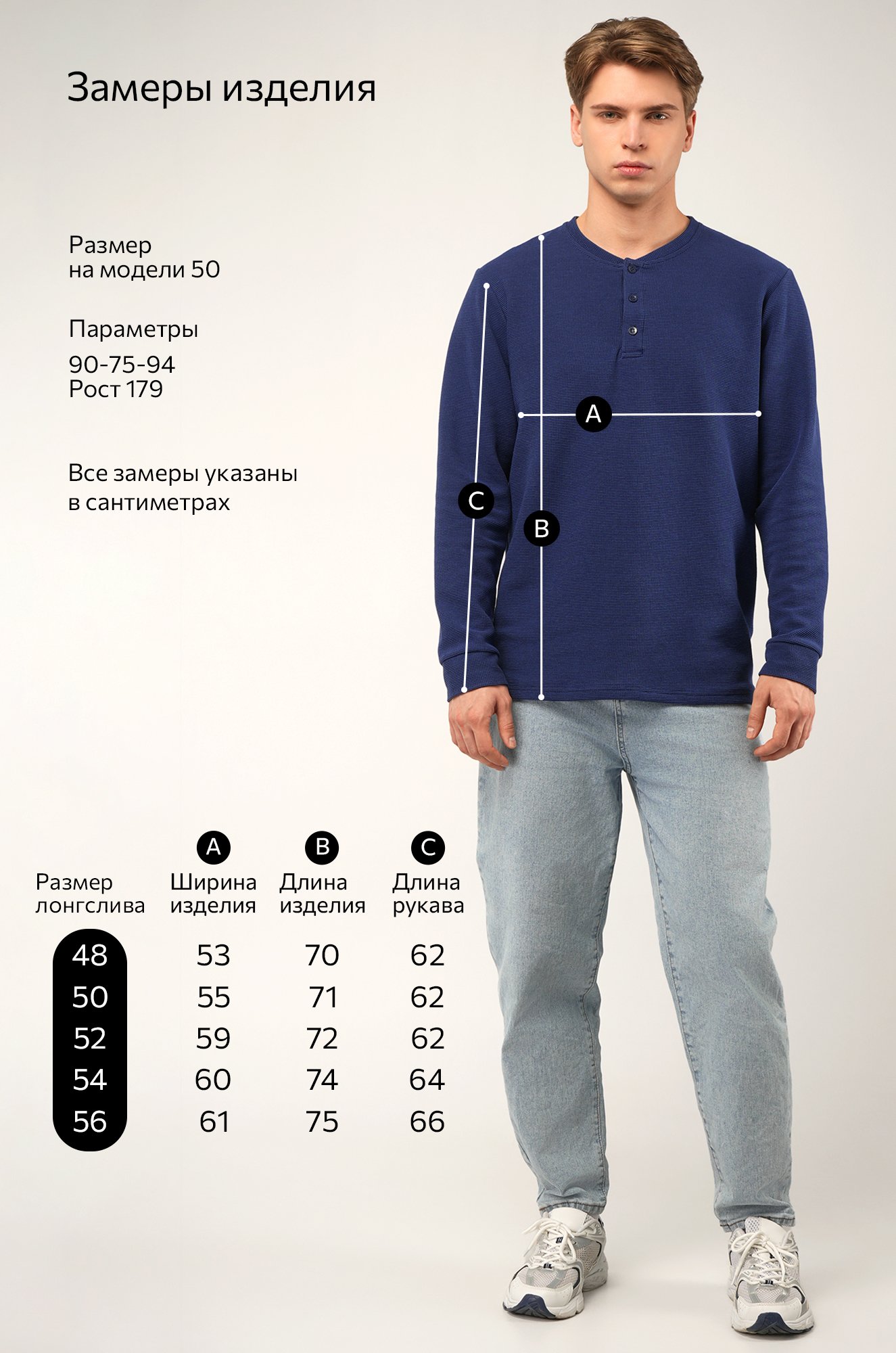 Трикотажный мужской лонгслив — твоя новая базовая классика! Стильная модель с оригинальным вырезом хенли легко заменит рубашку поло с длинным рукавом. Однотонный синий цвет и универсальный крой делают лонг идеальным для офиса и повседневных образов.