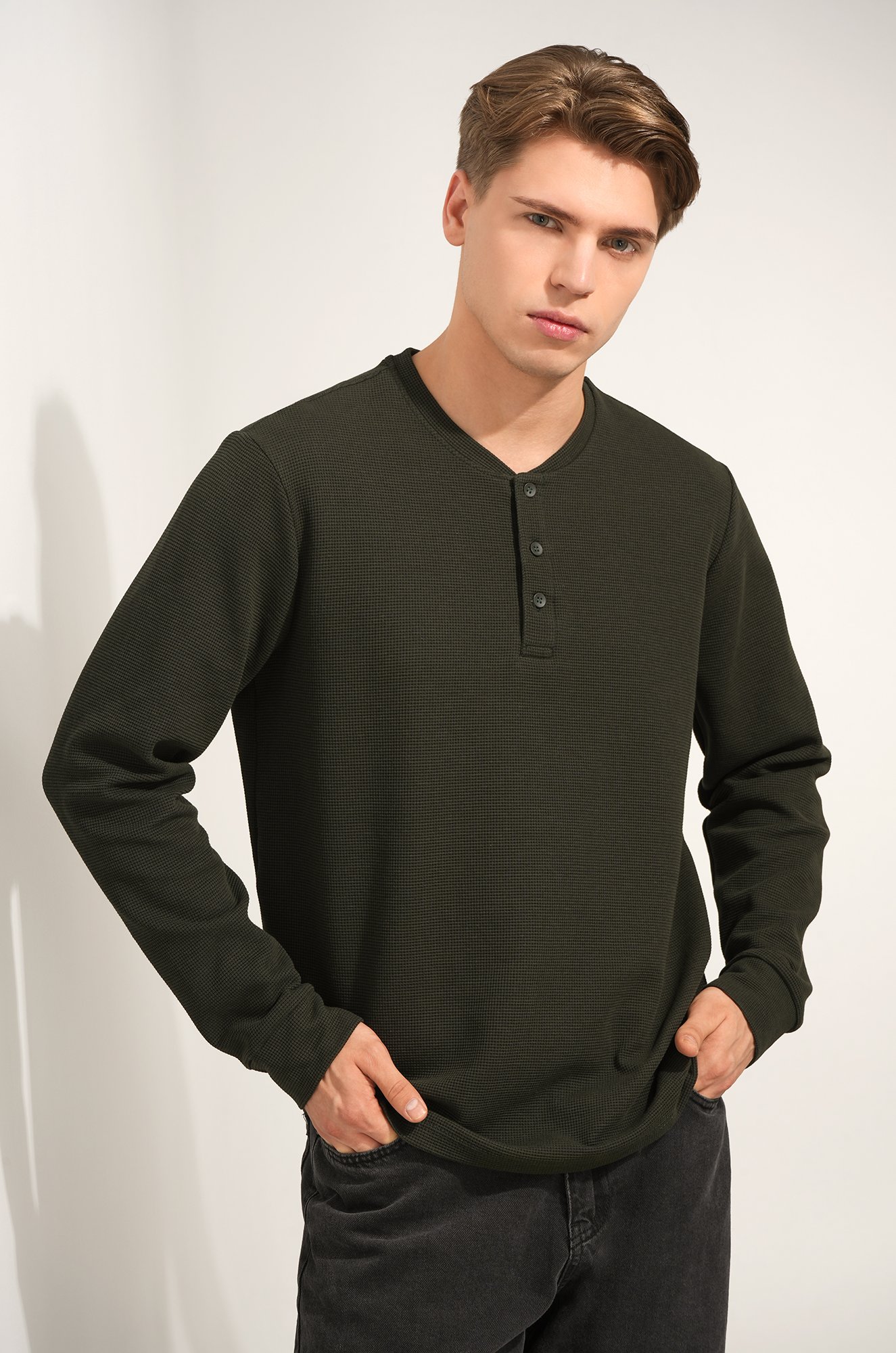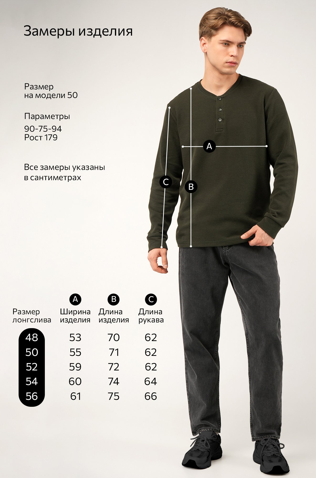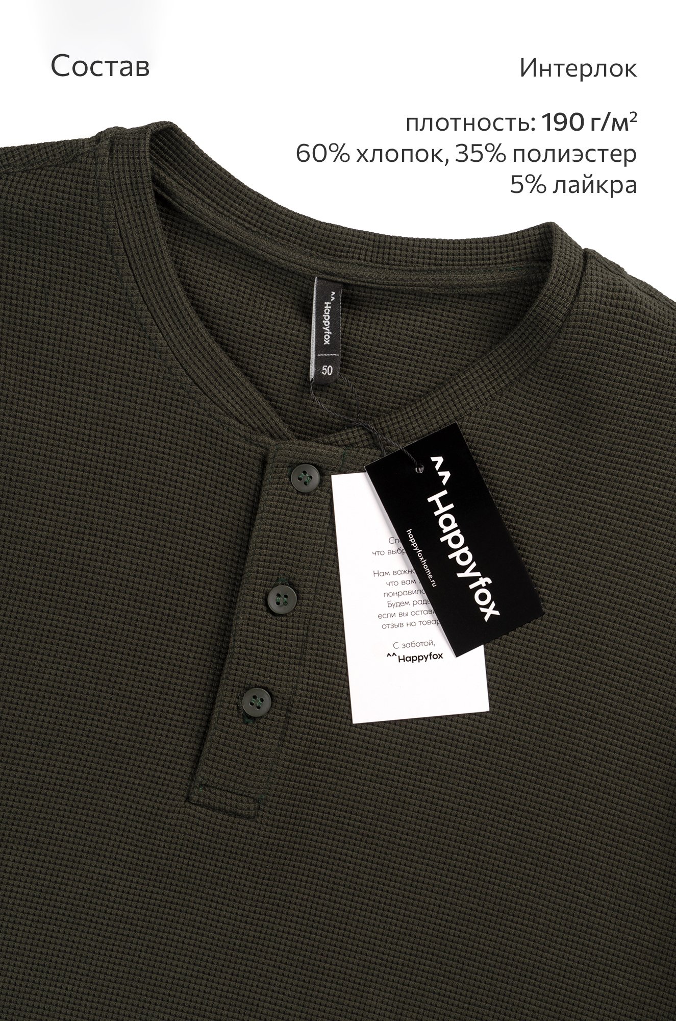 Трикотажный мужской лонгслив — твоя новая базовая классика! Стильная модель с оригинальным вырезом хенли легко заменит рубашку поло с длинным рукавом. Однотонный цвет хаки и универсальный крой делают лонг идеальным для офиса и повседневных образов.