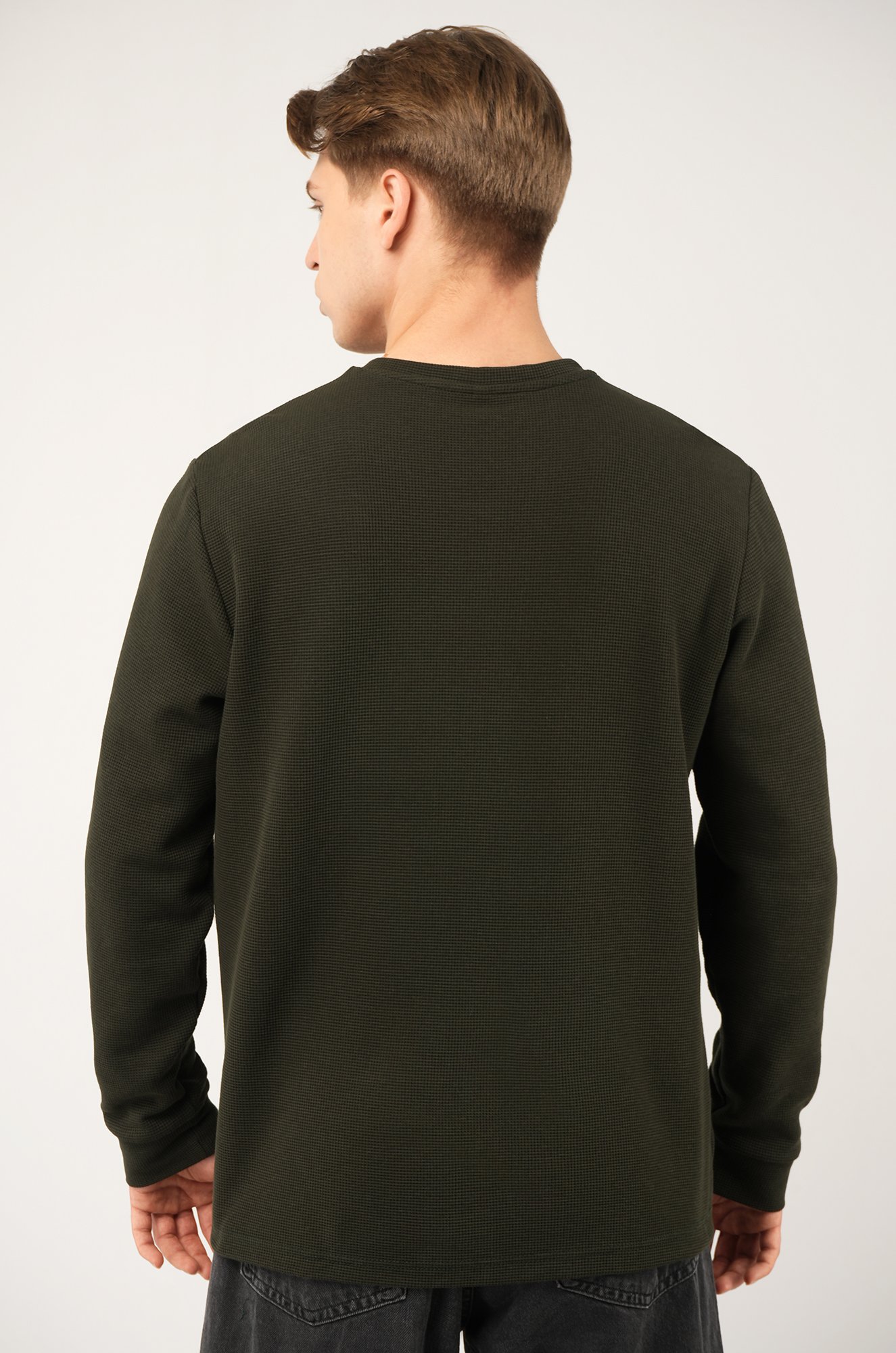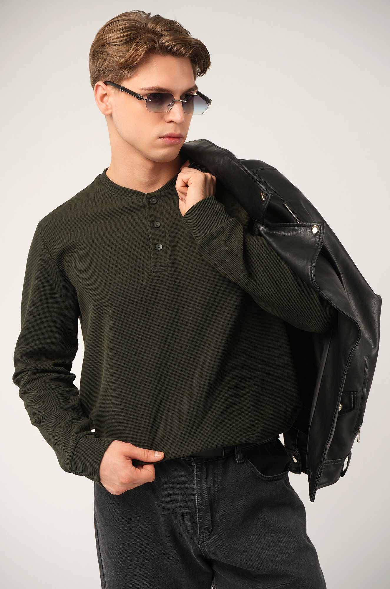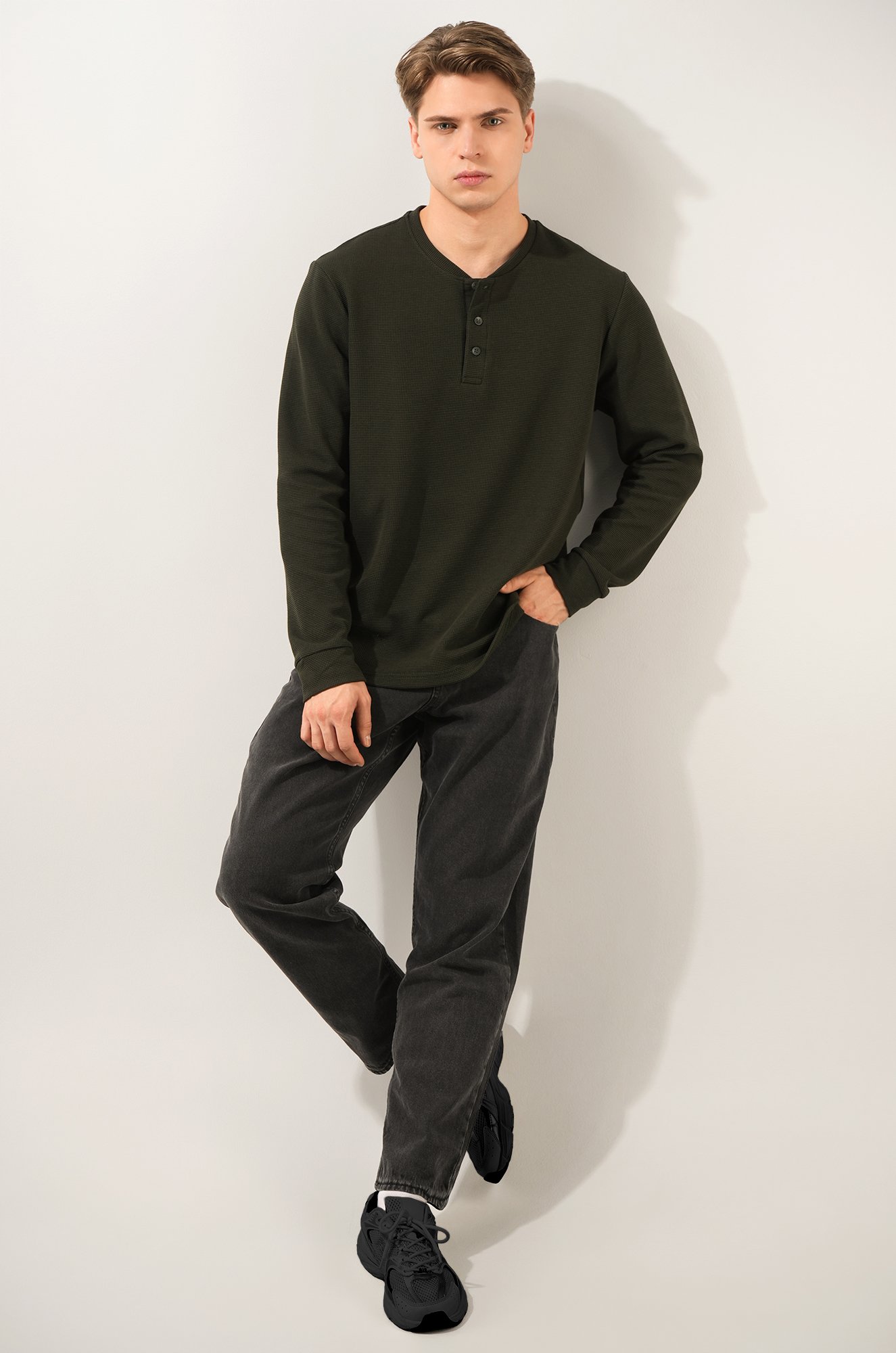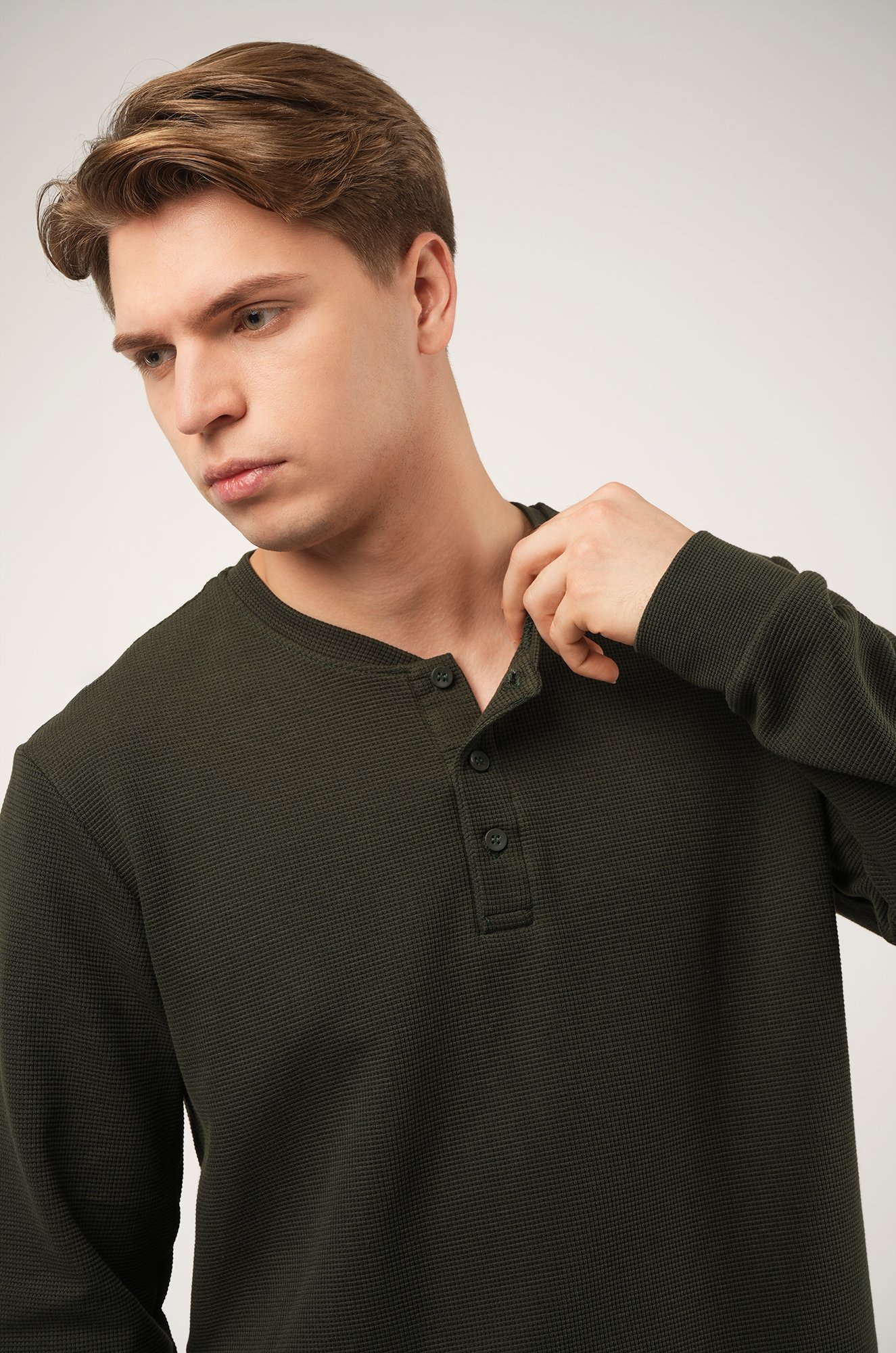 Трикотажный мужской лонгслив — твоя новая базовая классика! Стильная модель с оригинальным вырезом хенли легко заменит рубашку поло с длинным рукавом. Однотонный цвет хаки и универсальный крой делают лонг идеальным для офиса и повседневных образов.