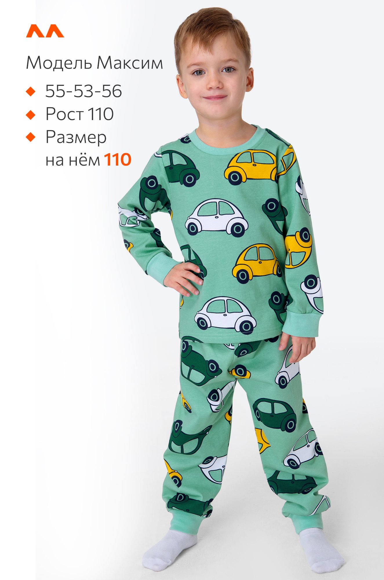 Рост модели 110 см, параметры: объем груди 55, объем талии 53, объем бедер 56 см. На нем размер 110.
