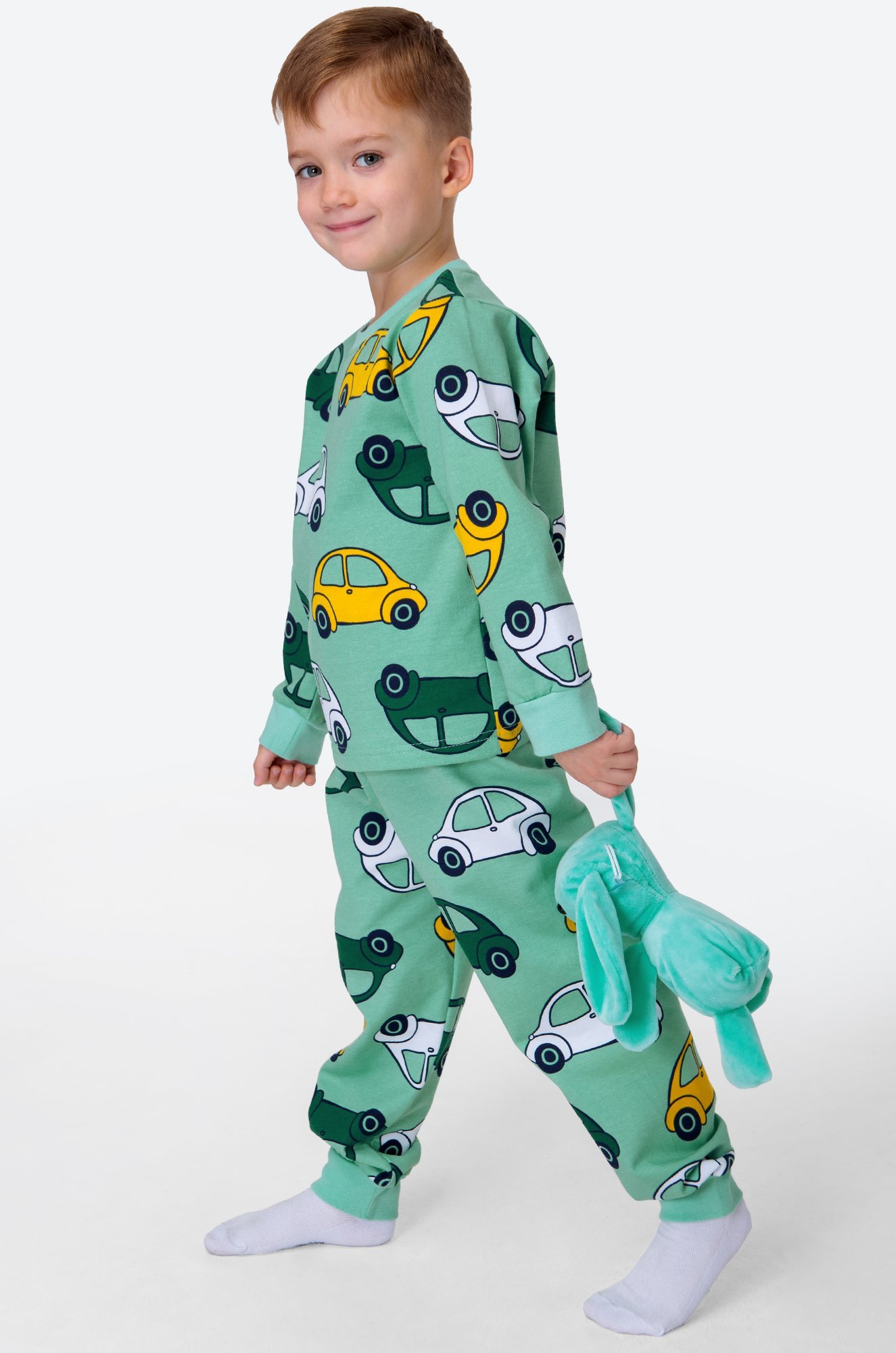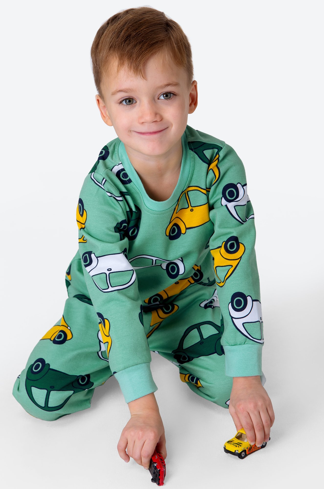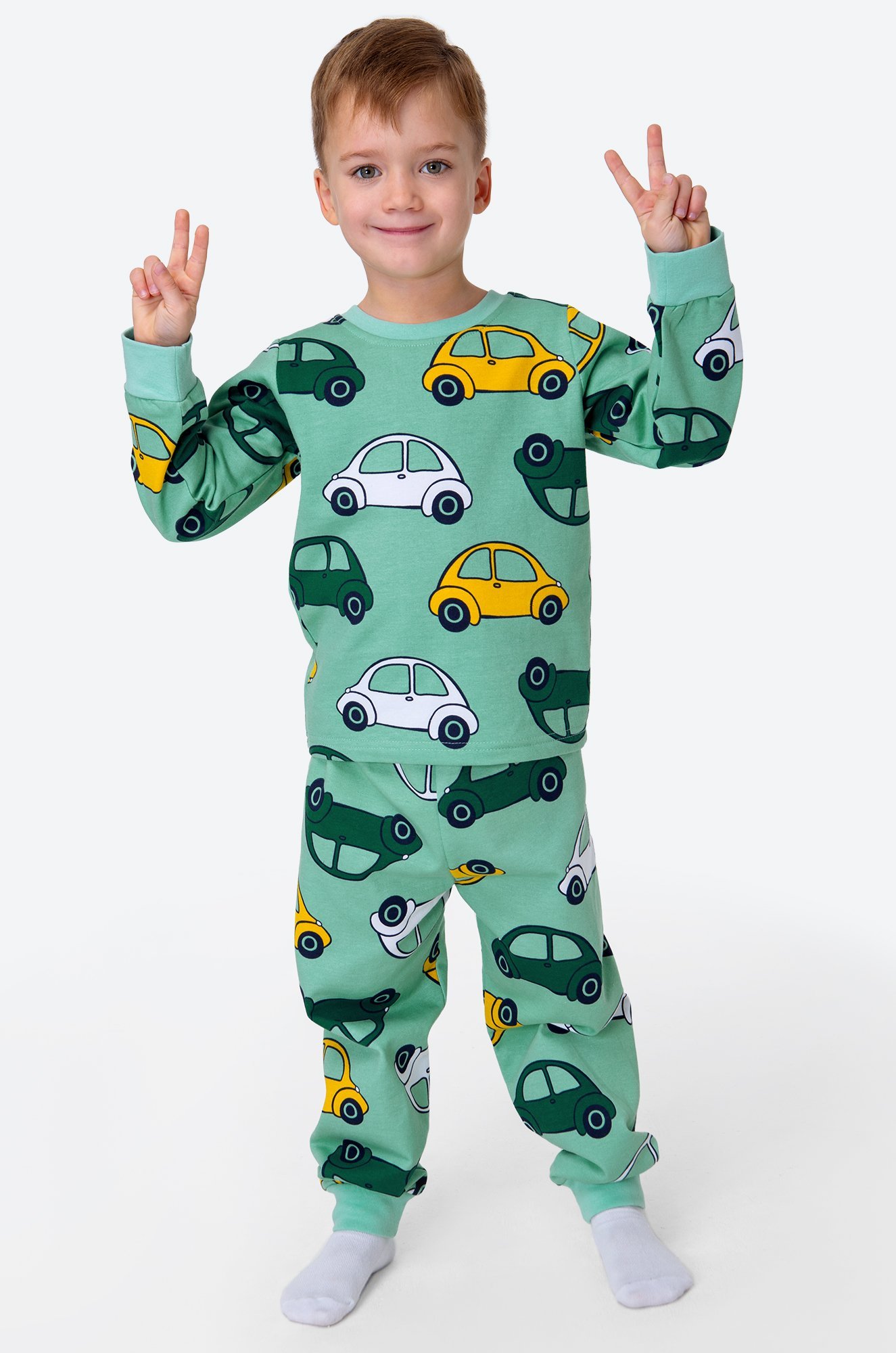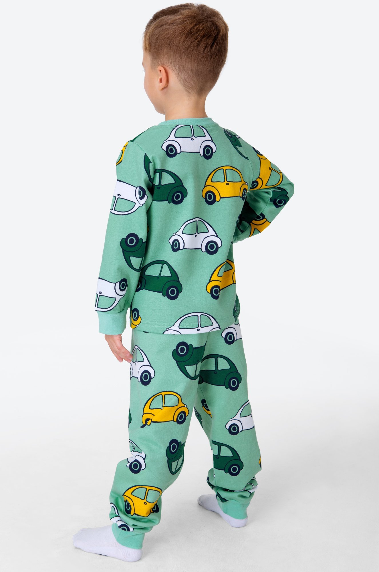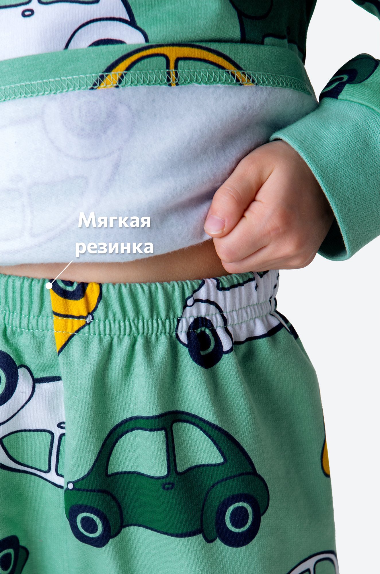 Теплая детская пижама с брюками для мальчиков выполнена из 100% хлопка. Пижама из футера с начесом станет любимым атрибутом отдыха благодаря свободному крою и спокойному малахитовому цвету. Прикольный принт Машинки поднимает настроение и создает уютную атмосферу.