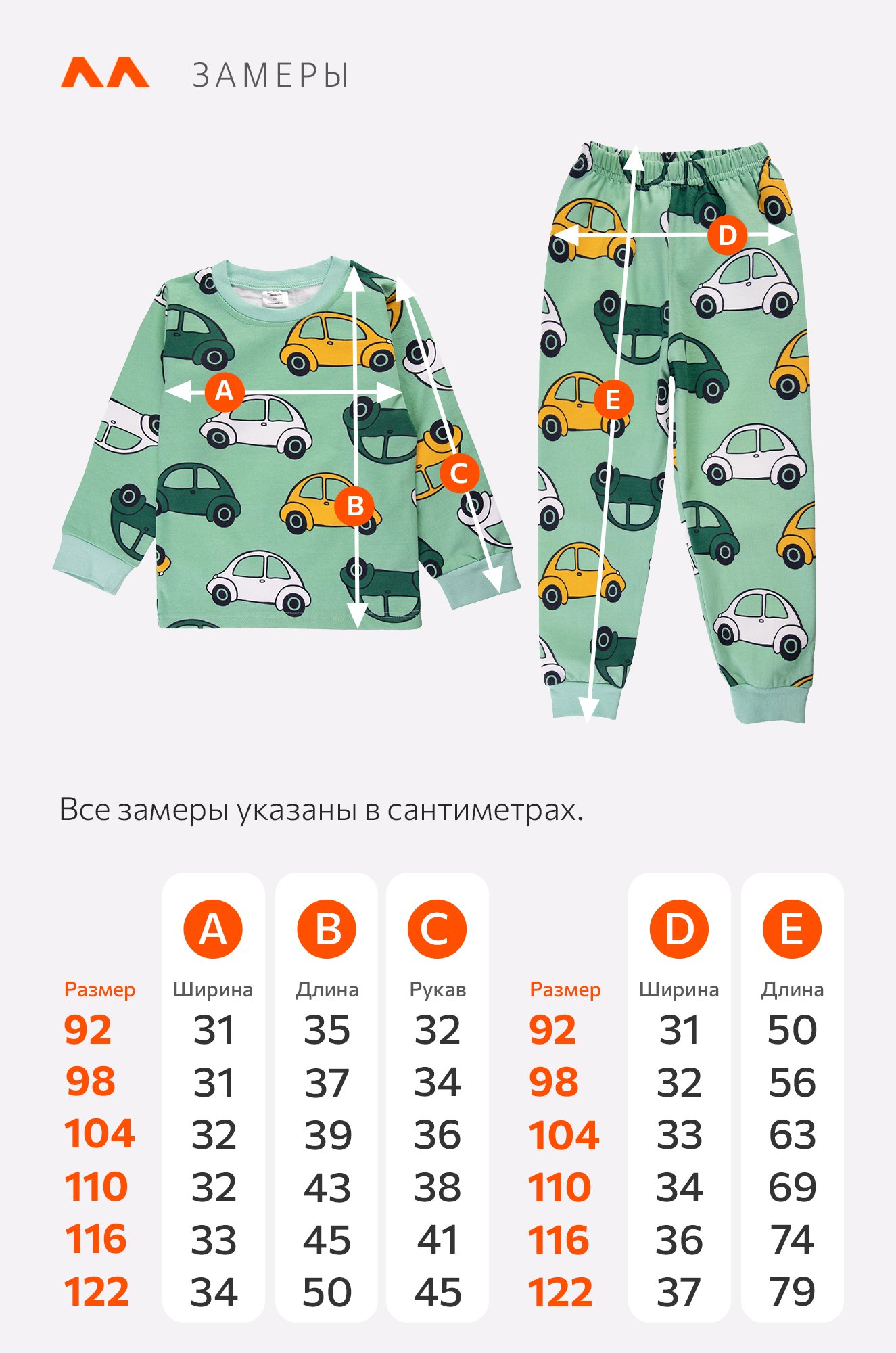 Размер 104: джемпер: длина: 39 см; ширина: 32 см; длина рукава внешняя: 36 см; длина рукава внутренняя: 30 см.