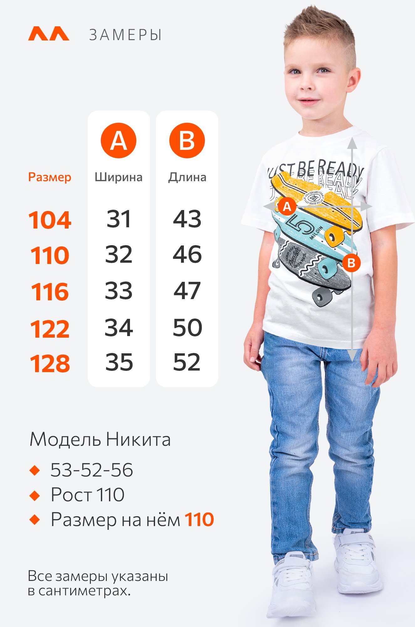 Модель Никита, его рост 110 см, параметры 53-52-56 см. На нем футболка размера 110.