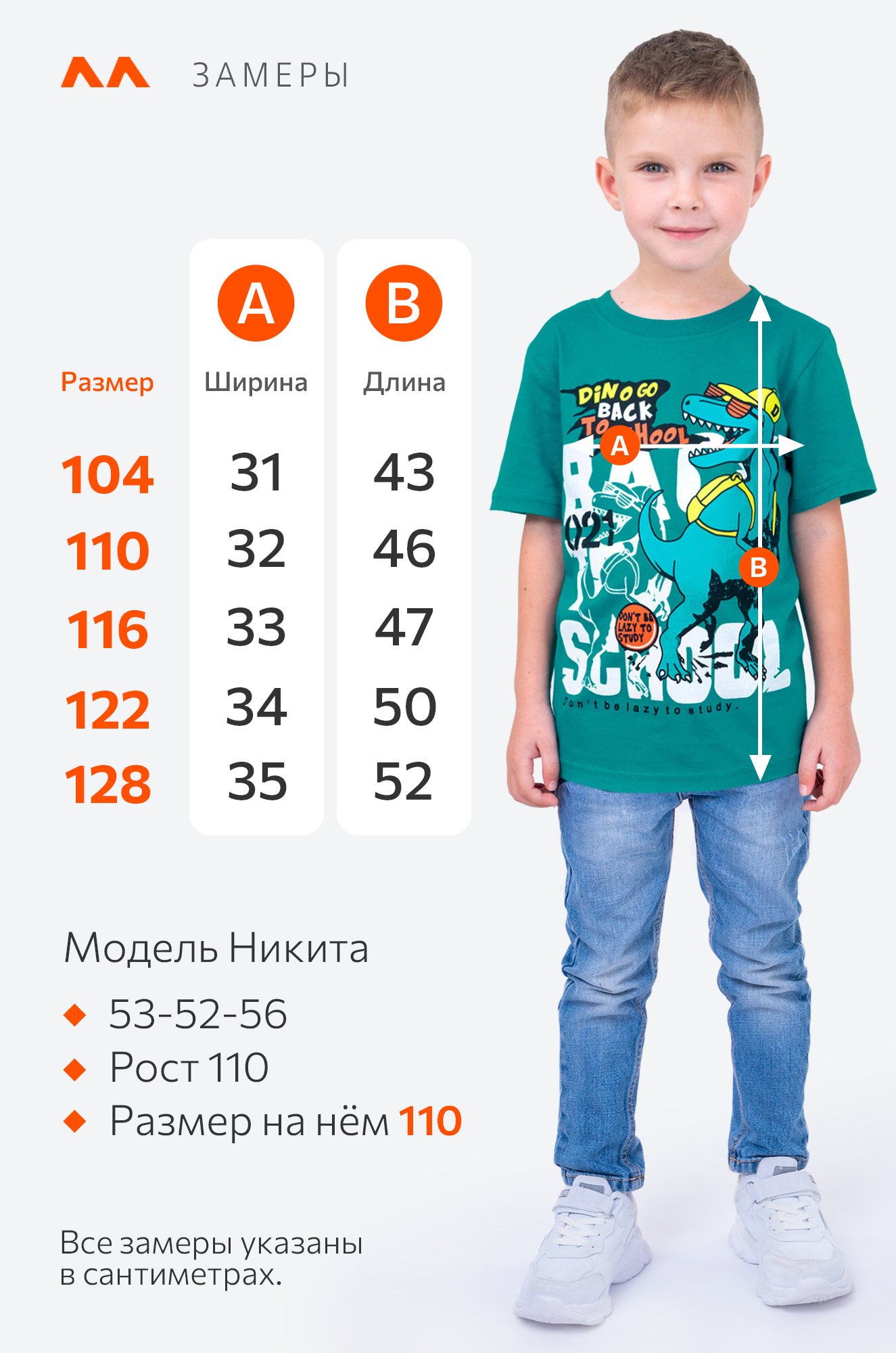 Модель Никита, его рост 110 см, параметры 53-52-56 см. На нем футболка размера 110.