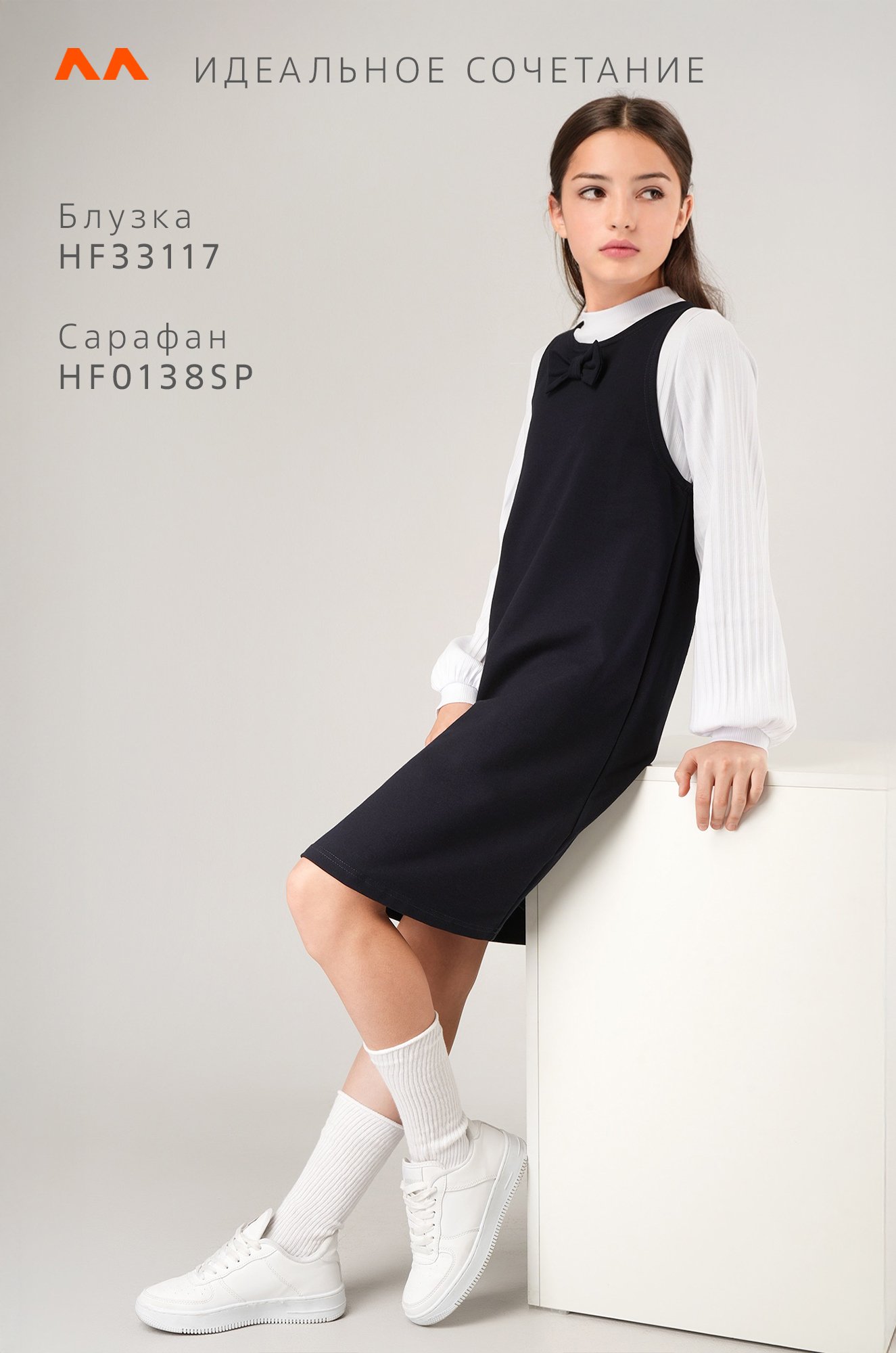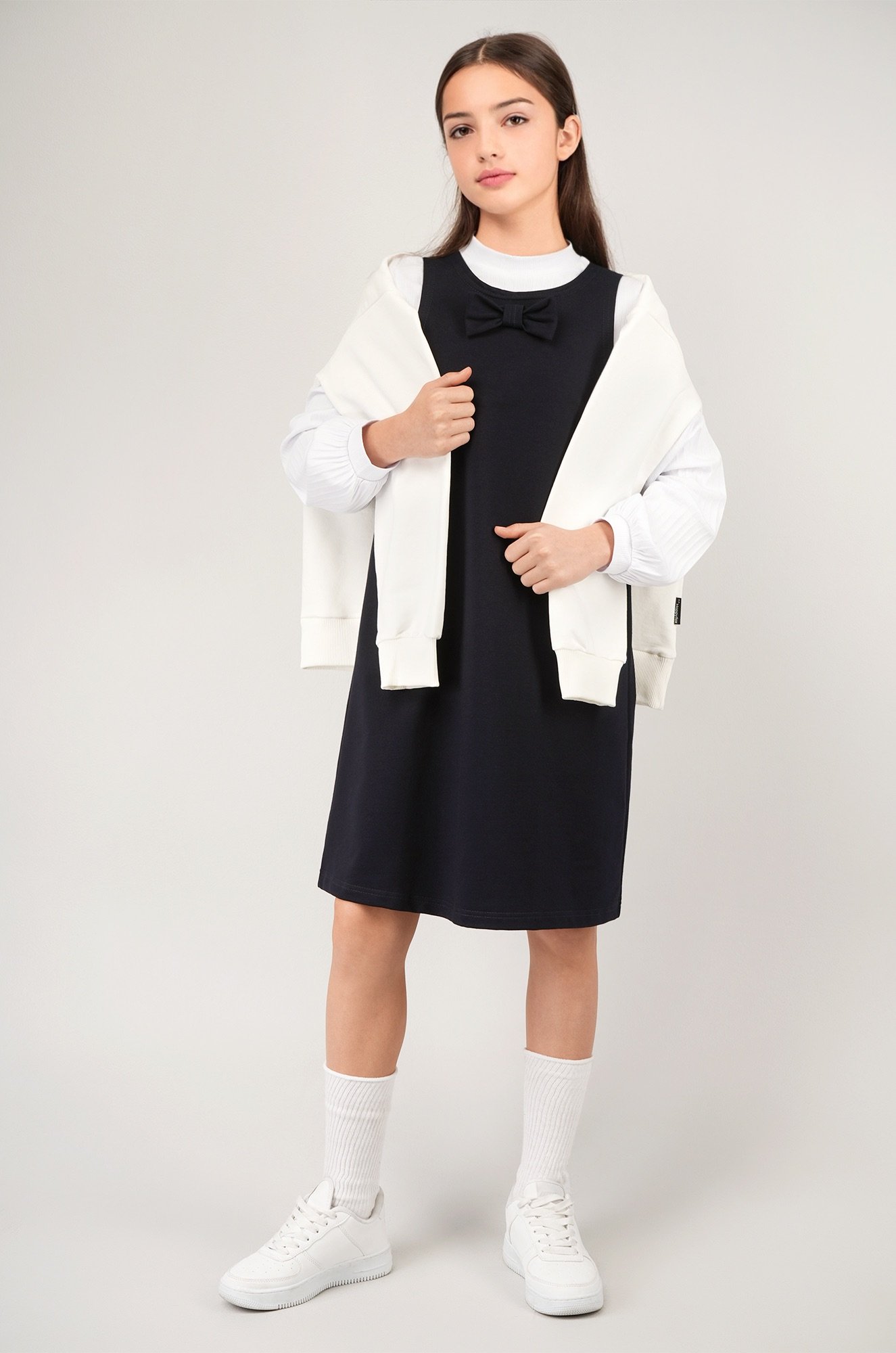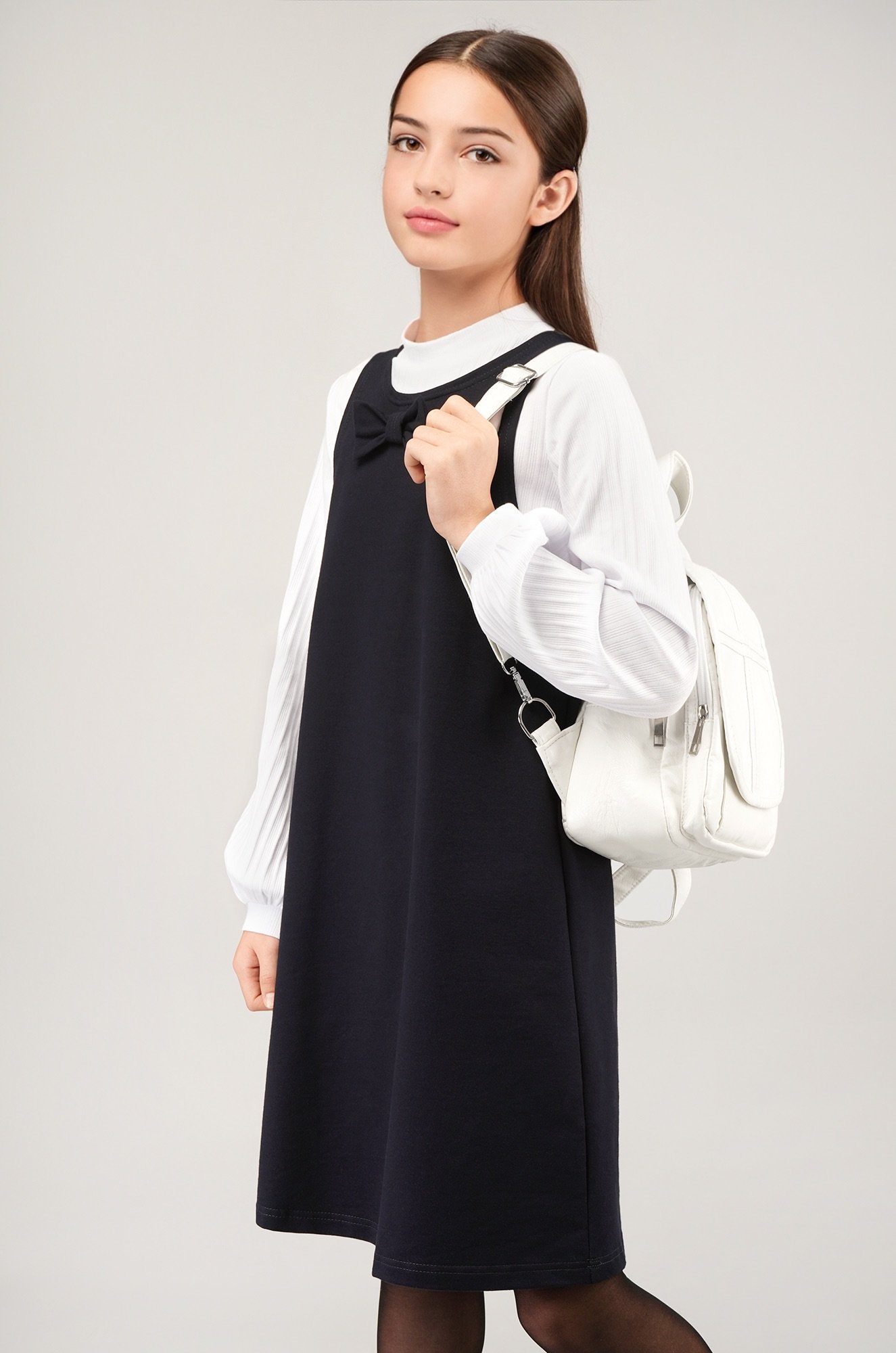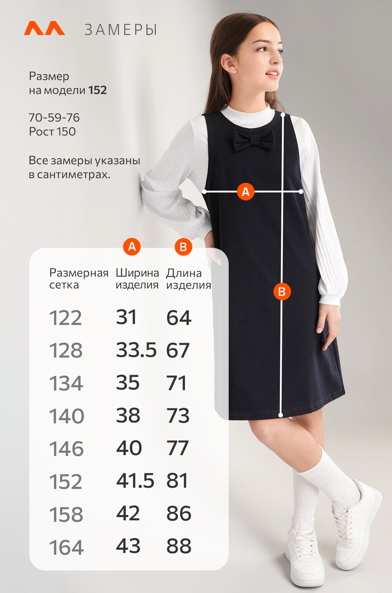 Выделяйся даже в рамках школьного дресс-кода! Детский сарафан для девочек и девочек-подростков выполнен из мягкого футера двухнитки. Комфортный силуэт трапеция, длина выше колена, милый бантик – этот синий сарафан для детей точно станет любимым элементом школьной формы и покорит сердца окружающих!