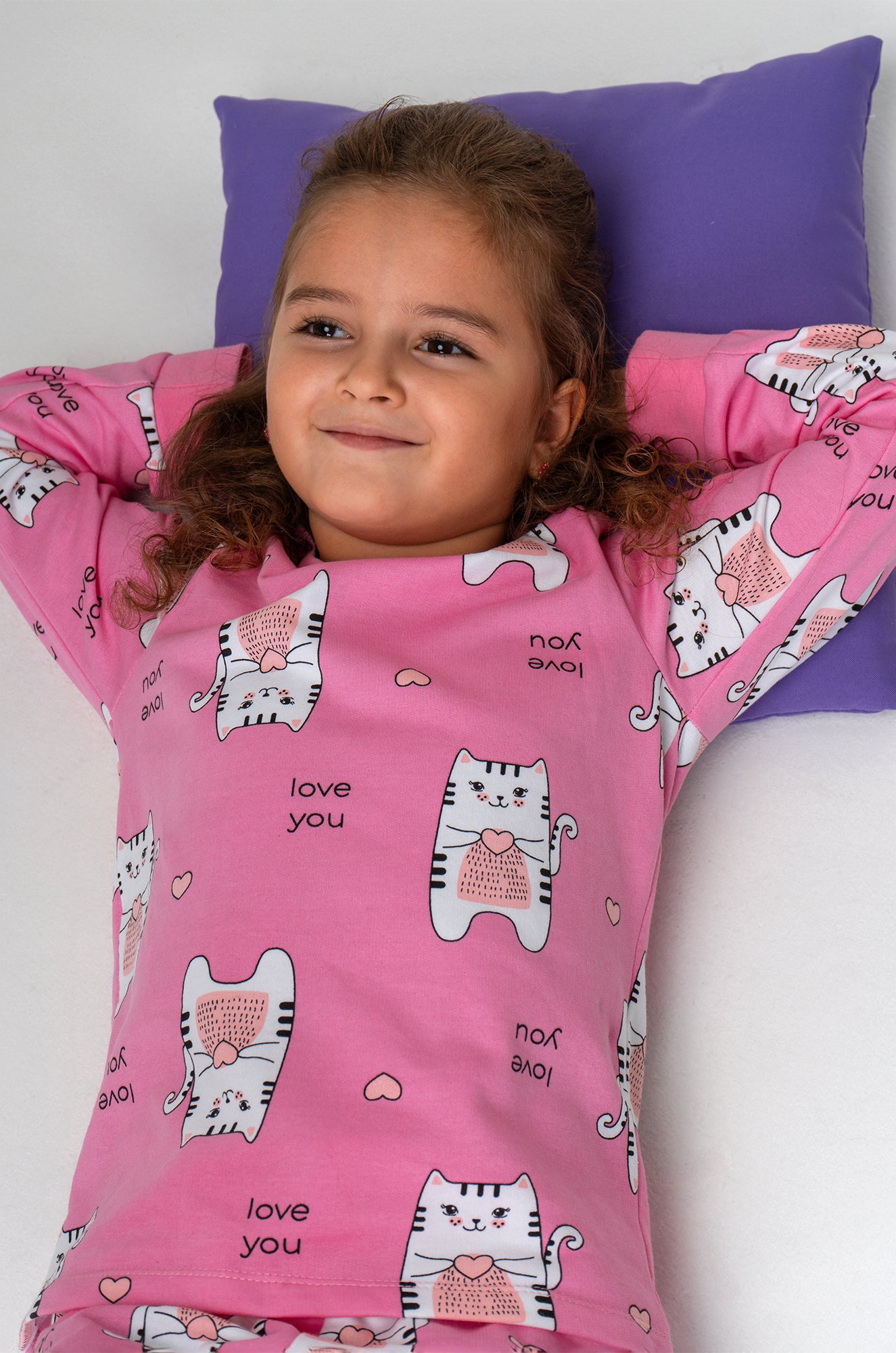 Теплая детская пижама с брюками для девочек выполнена из футера с начесом. Пижама для детей станет любимым атрибутом отдыха юной принцессы благодаря свободному крою и нежному розовому цвету. Милый принт котики поднимает настроение и создает уютную атмосферу.