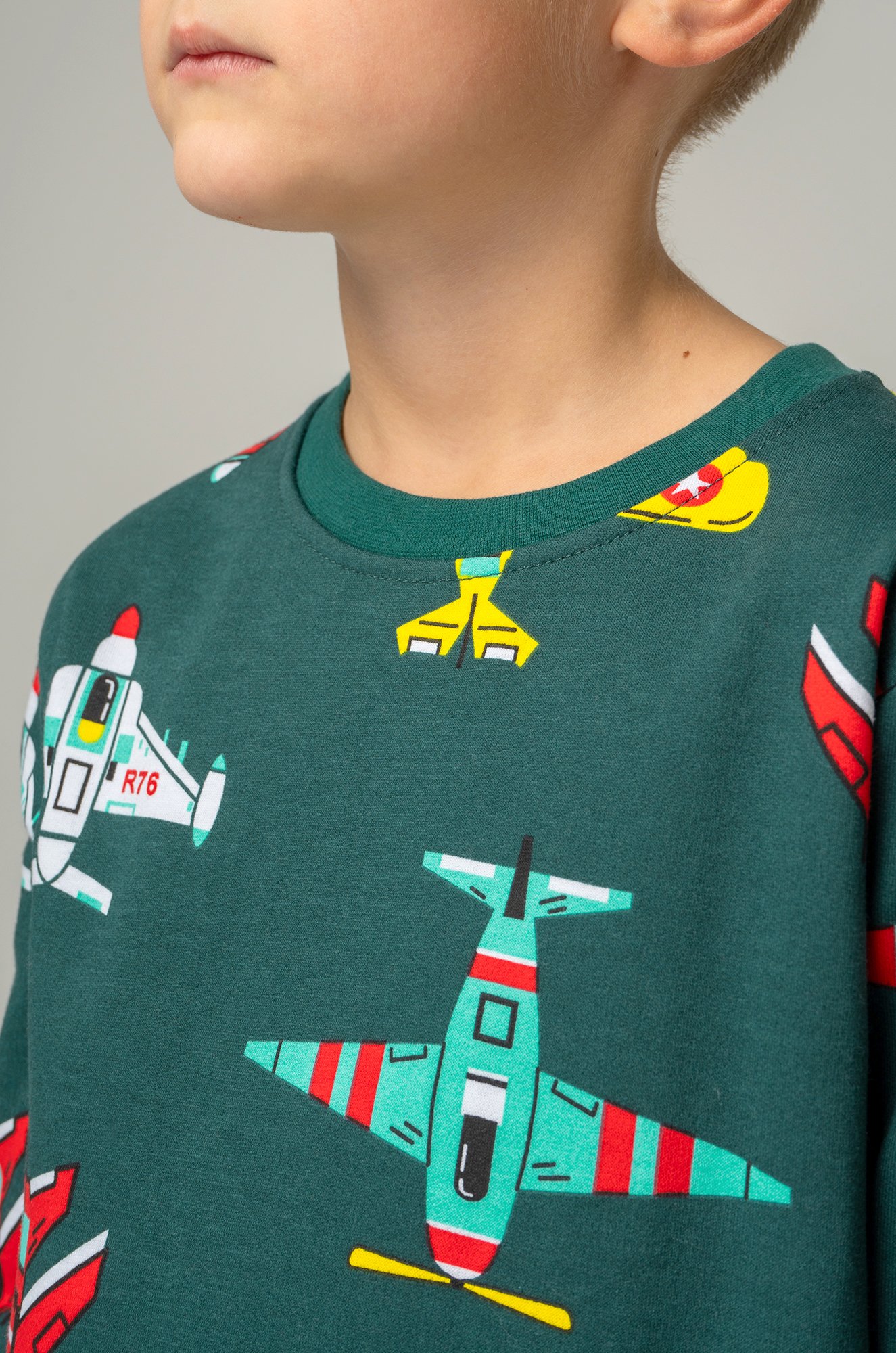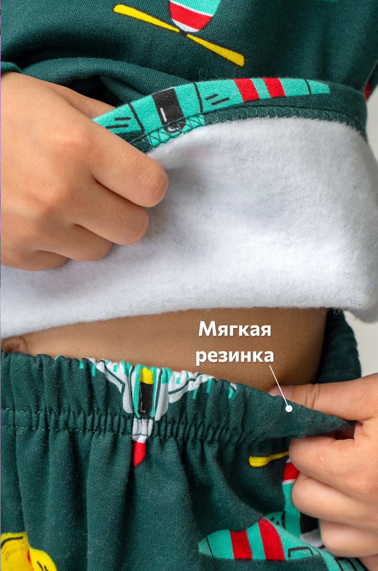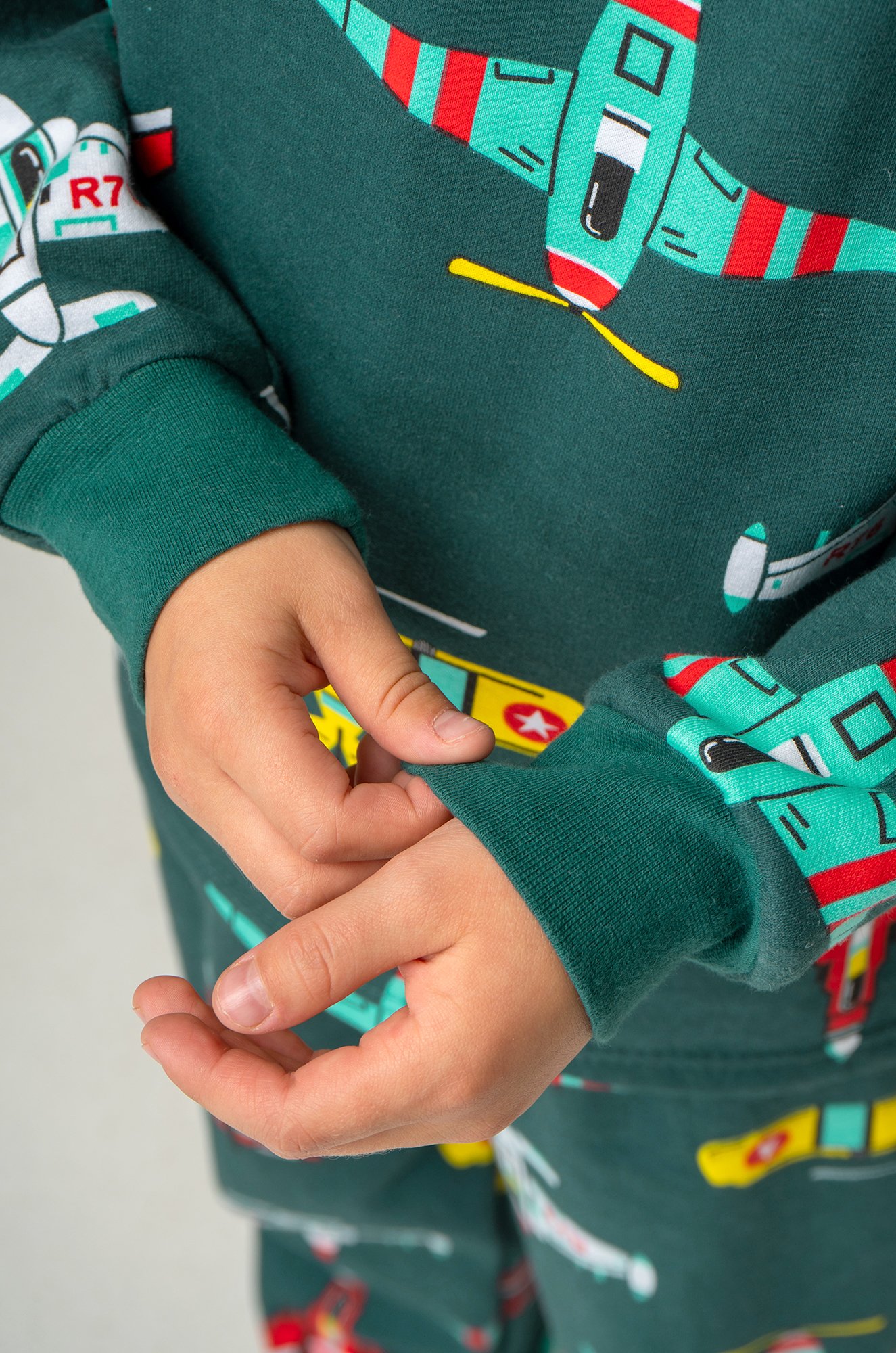 Теплая детская пижама с брюками для мальчиков выполнена из 100% хлопка. Пижама из футера с начесом станет любимым атрибутом отдыха благодаря свободному крою и симпатичному дизайну. Пижамка украшена принтом самолеты.
