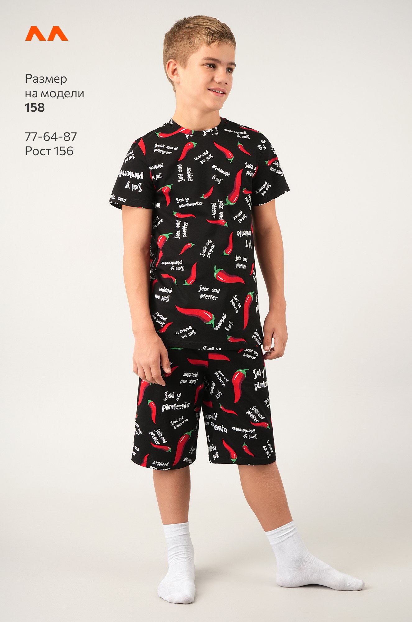 Черный костюм с рисунком перцы подходит для сна и отдыха. Подростковый трикотажный костюм идеален для дома.