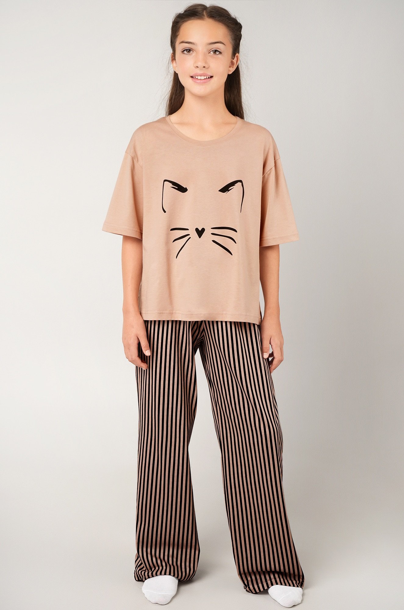 Детская пижама для девочки и девочки подростка — отличный выбор для сна и отдыха. Бежевая футболка со спущенным плечом украшена принтом Усы и ушки котика, а штаны дополнены атласным бантом на поясе и рисунком в полоску.